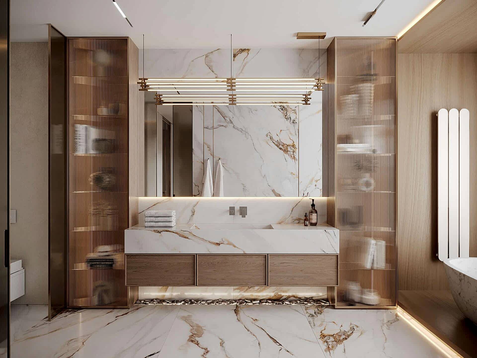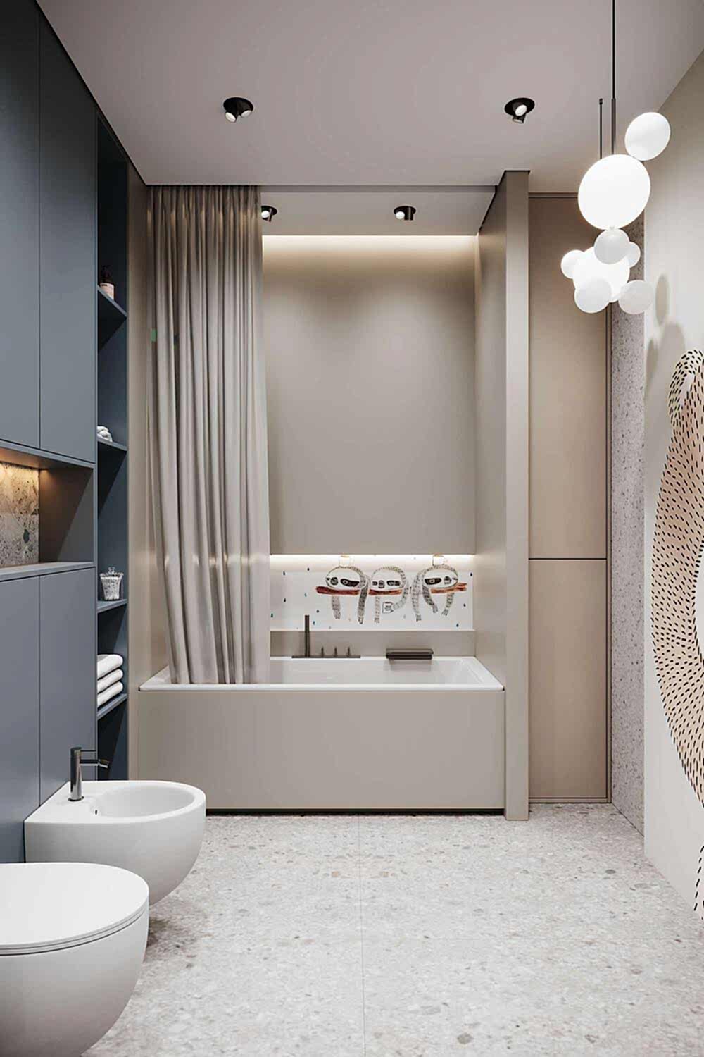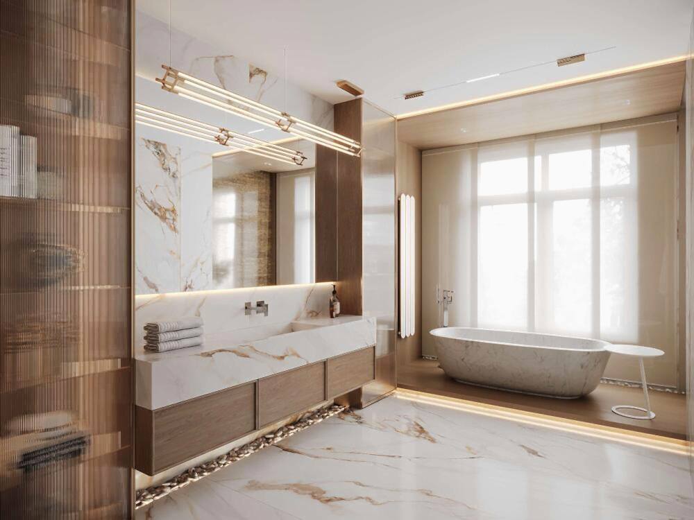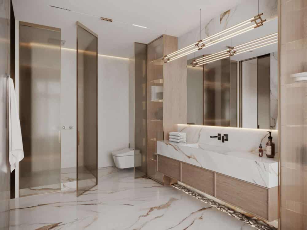 В квартире теперь три Pin-Up санузла, а не два, как было изначально.Теперь у хозяйки, сына и Pin-Up естьличное пространствос индивидуальным оформлениеВ отделке были использованы: натуральный камень, кварцевый агломерат и дизайнерская Pin-Up которые подчеркивают статус проекта.