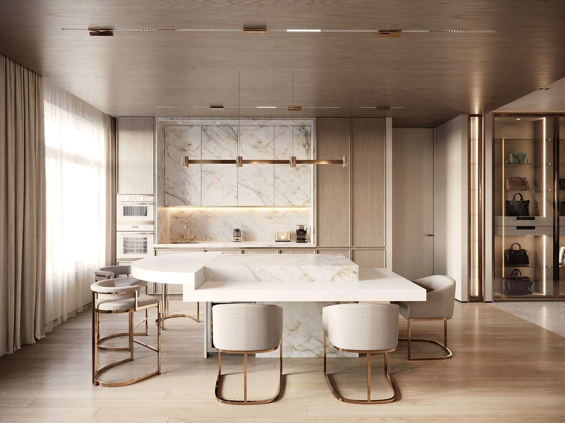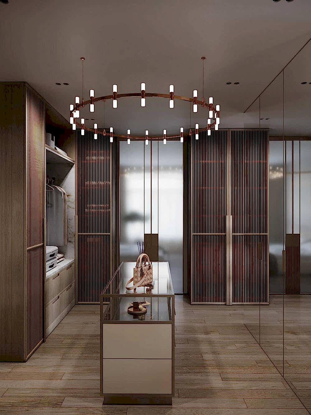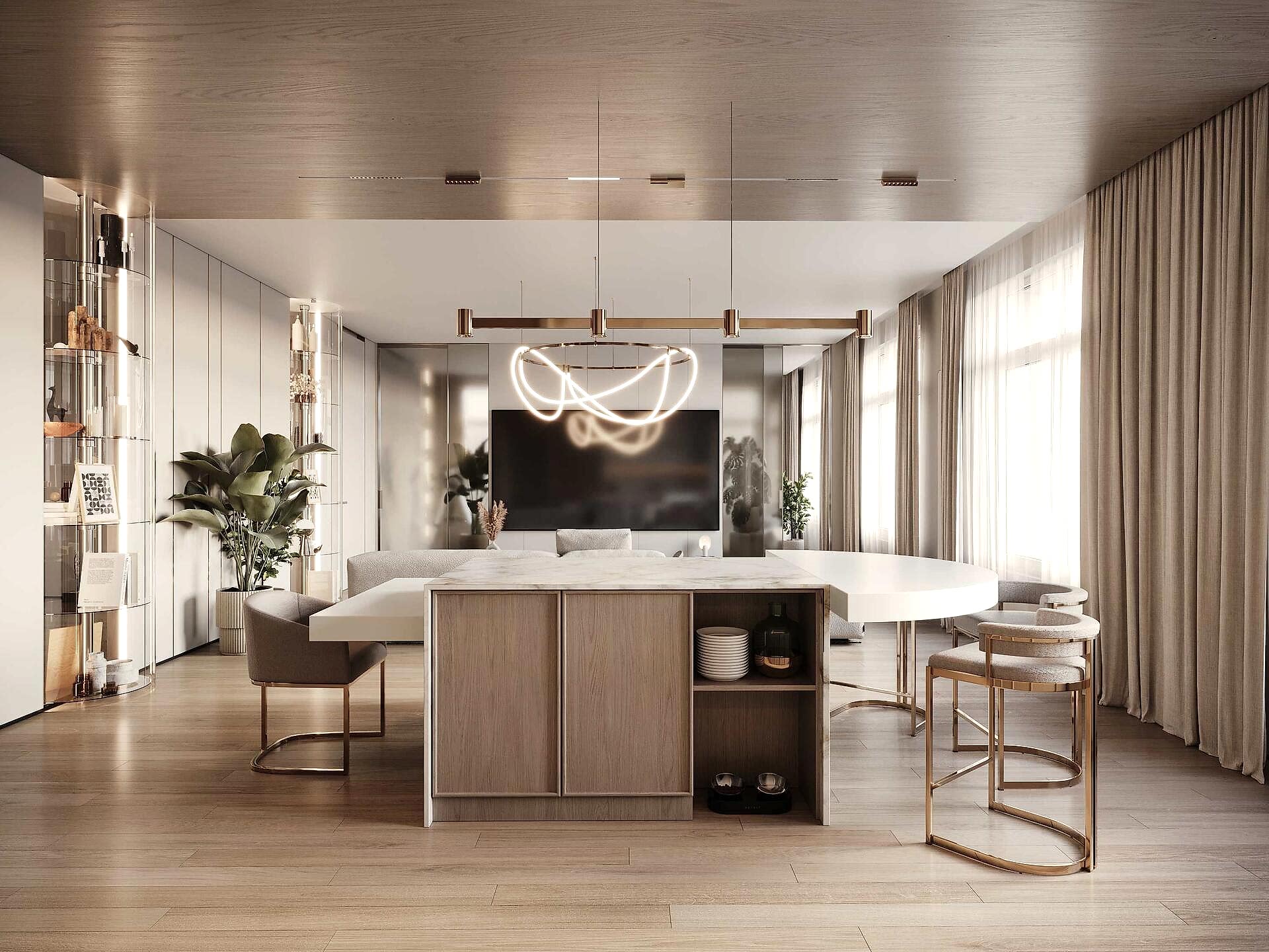 Заказчица хотела иметь просторную Pin-Up с радиусными витринами и удобный доступ к разным частям квартиры.