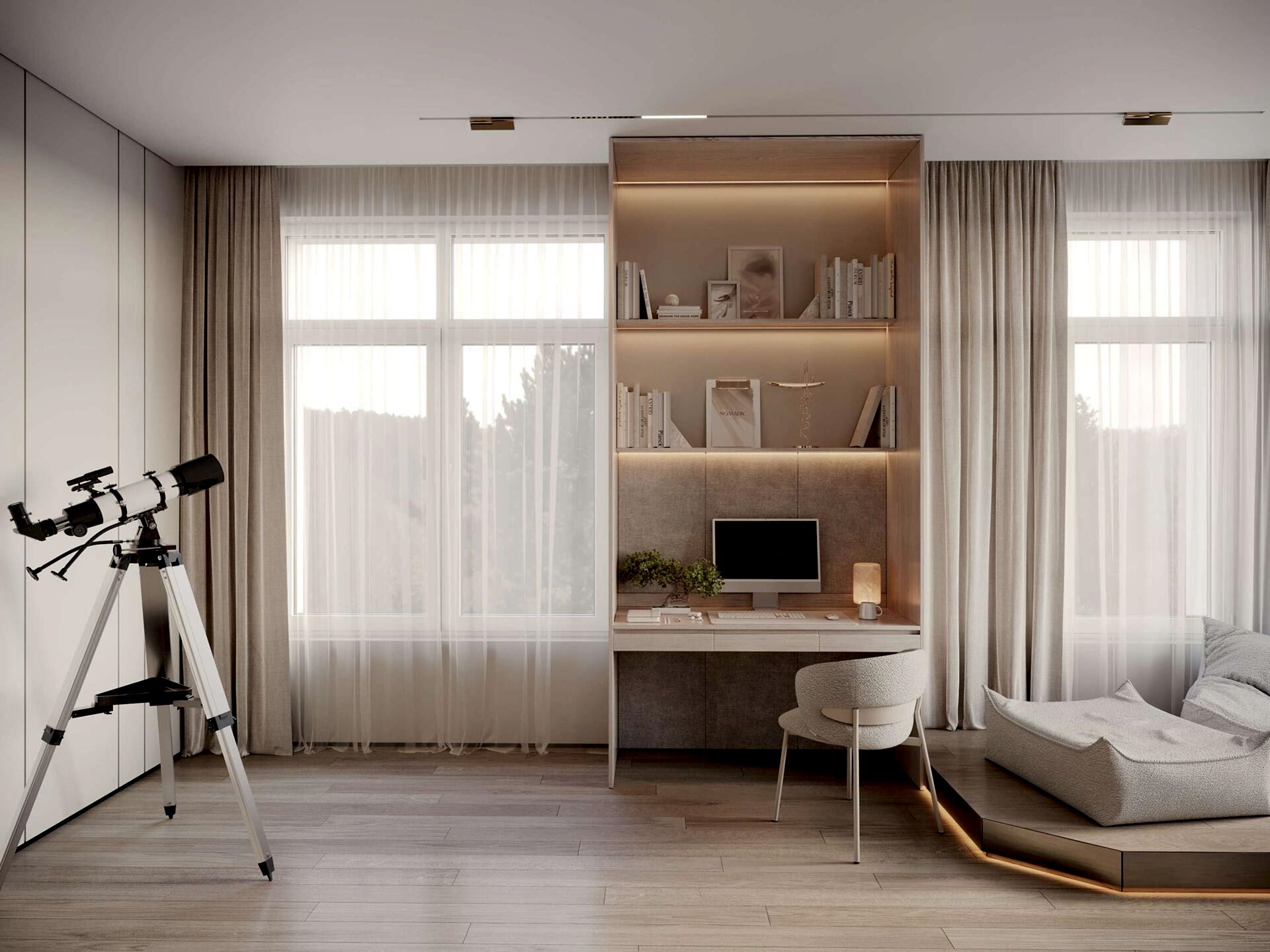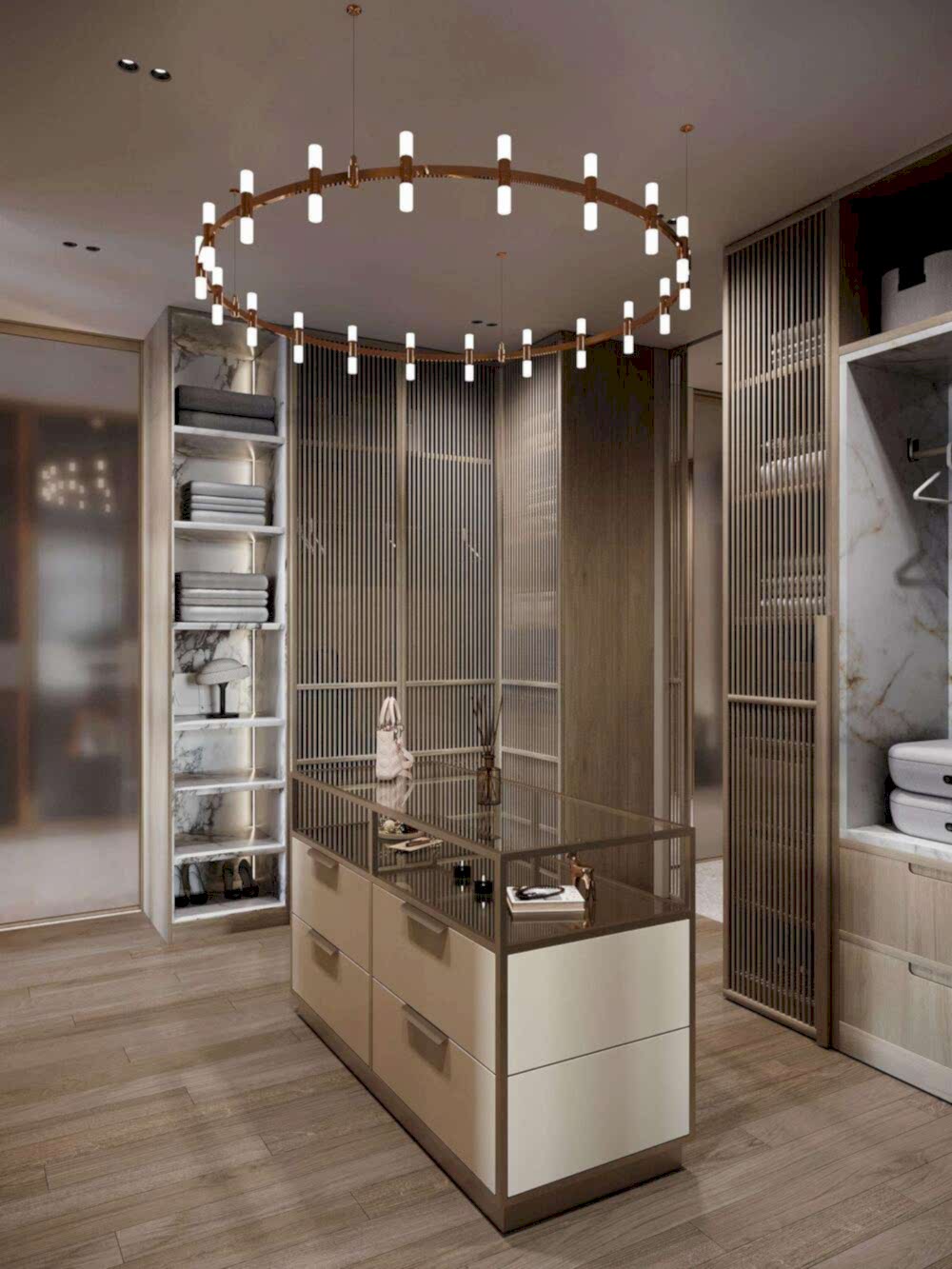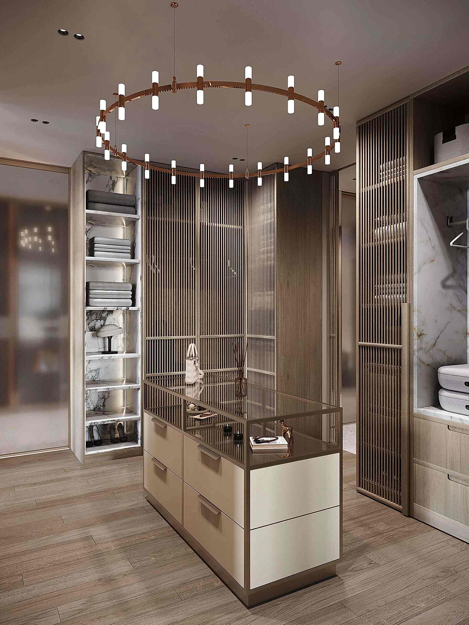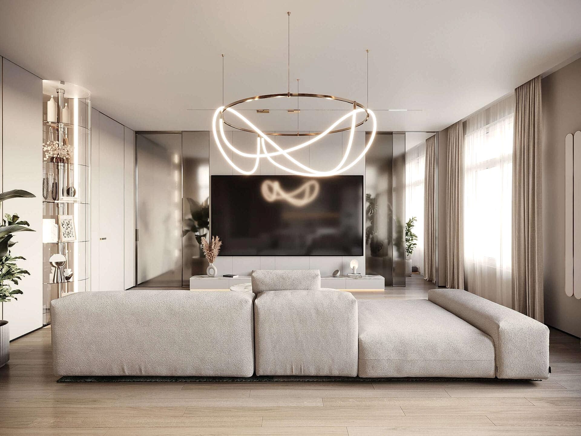 Заказчица хотела иметь просторную Pin-Up с радиусными витринами и удобный доступ к разным частям квартиры.