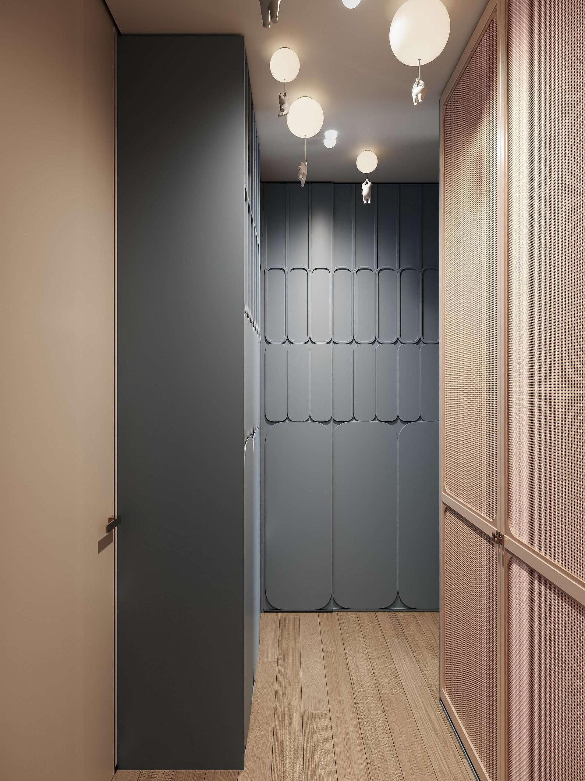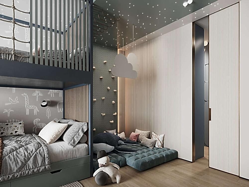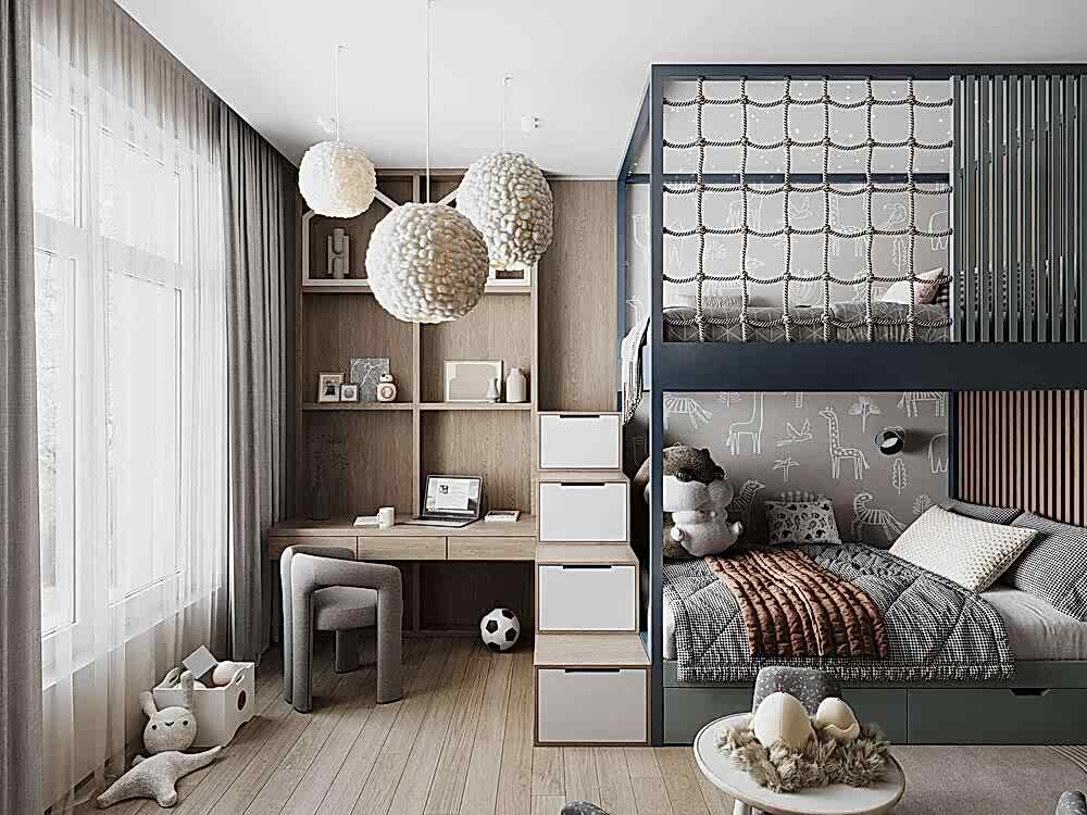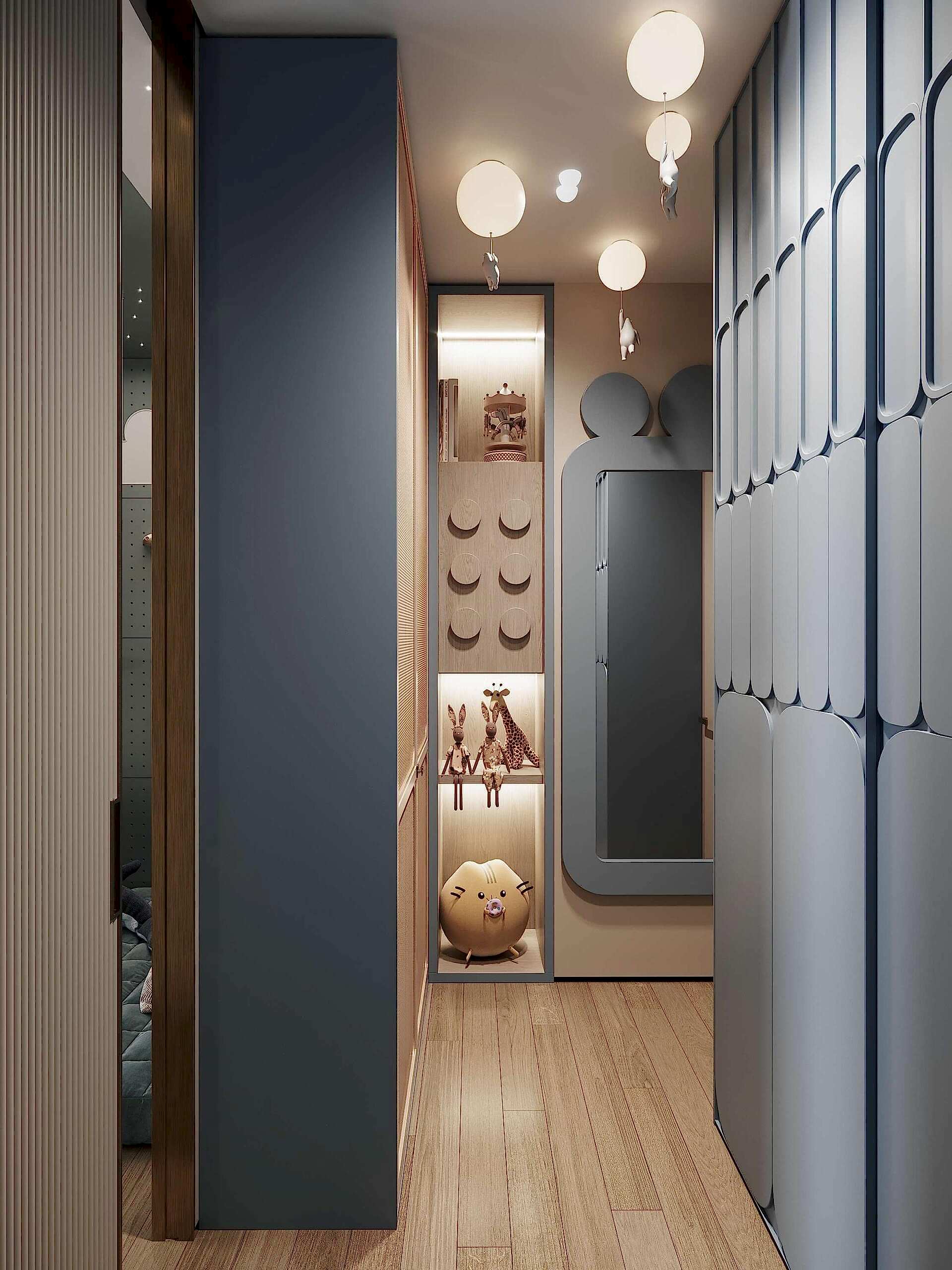 Детская оформленас учётом роста ребёнка- Pin-Up она адаптирована под шестилетнего мальчика, но в будущем трансформируется в подростковую спальню.В комнате появилась отдельная гардеробная, что позволило организовать место для зоны отдыха и занятий. Pin-Up продуманной планировке у ребёнка теперь больше личного пространства и удобный доступ в ванную.