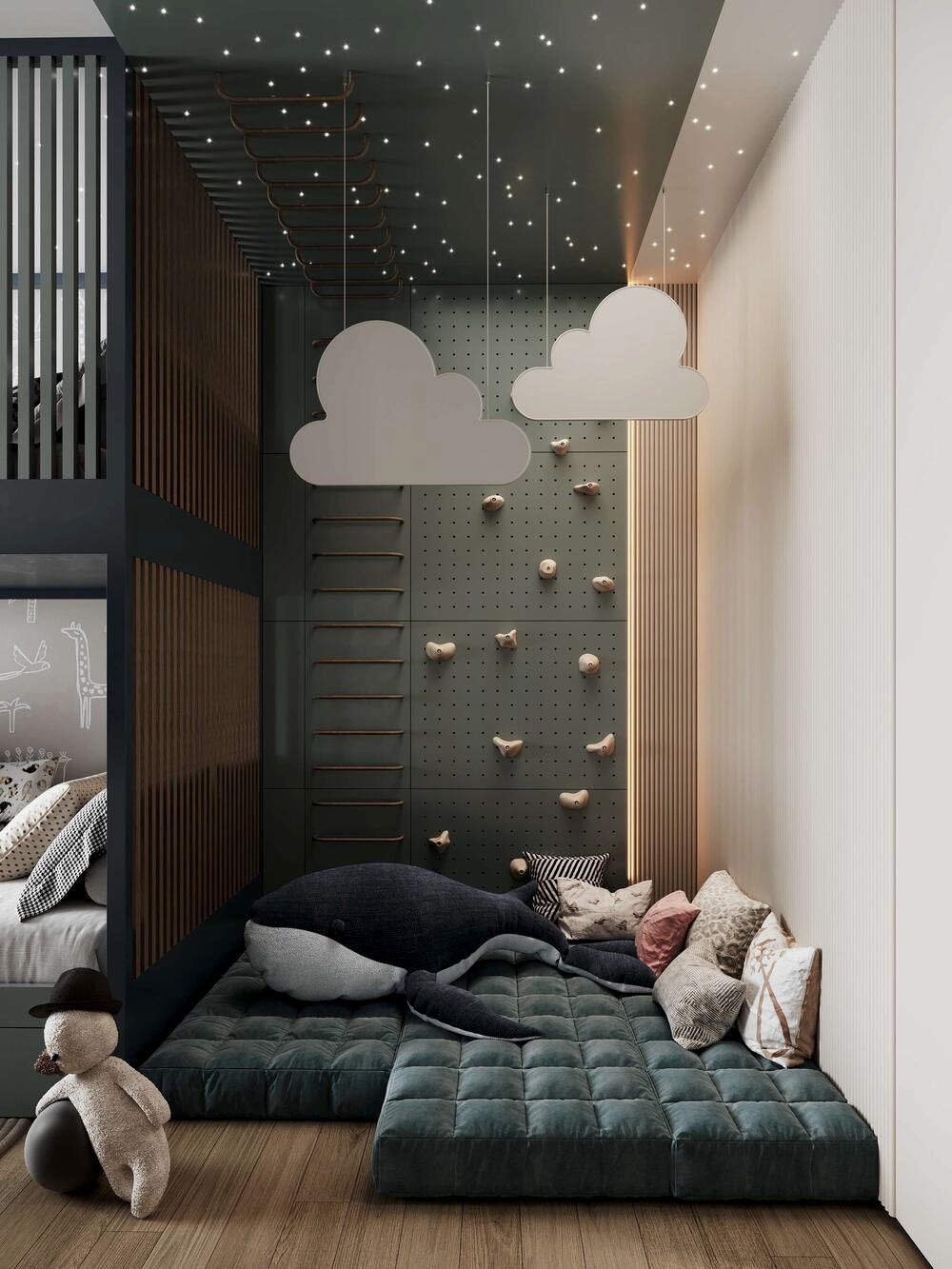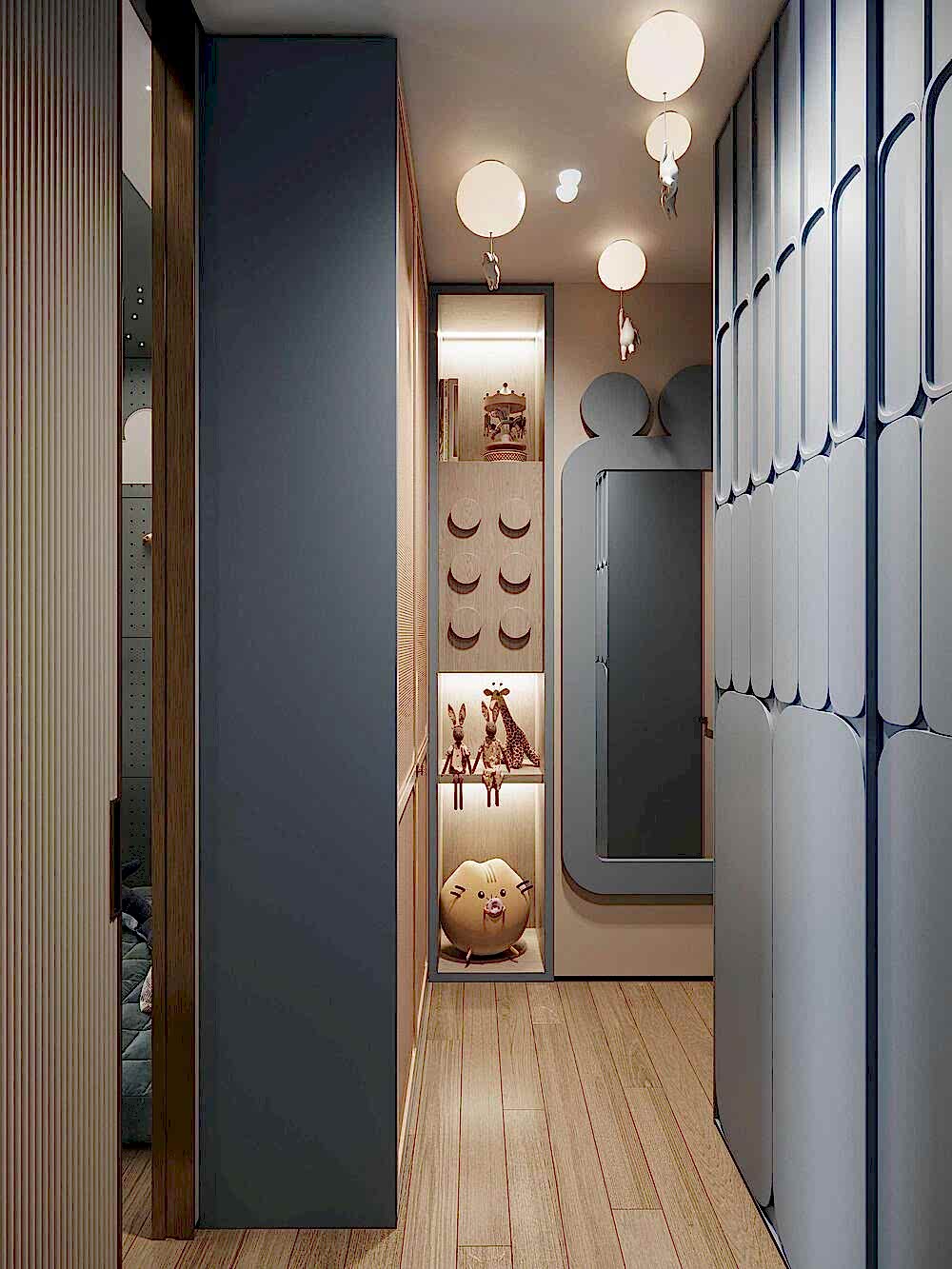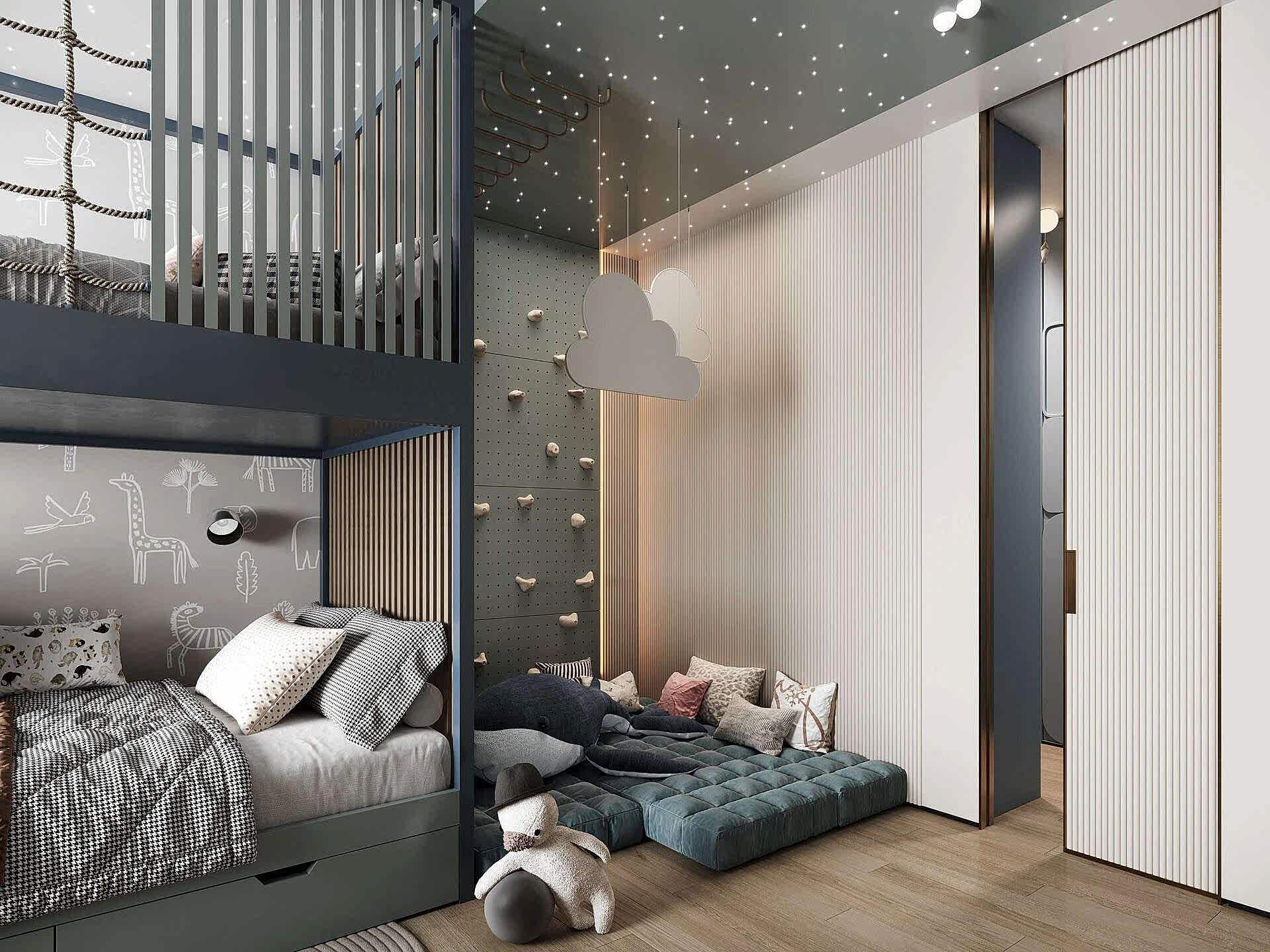 Детская оформленас учётом роста ребёнка- Pin-Up она адаптирована под шестилетнего мальчика, но в будущем трансформируется в подростковую спальню.В комнате появилась отдельная гардеробная, что позволило организовать место для зоны отдыха и занятий. Pin-Up продуманной планировке у ребёнка теперь больше личного пространства и удобный доступ в ванную.