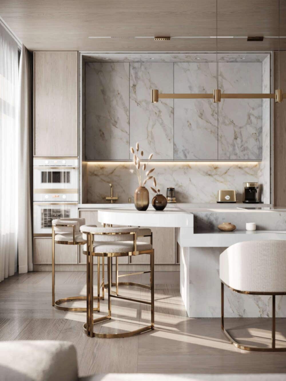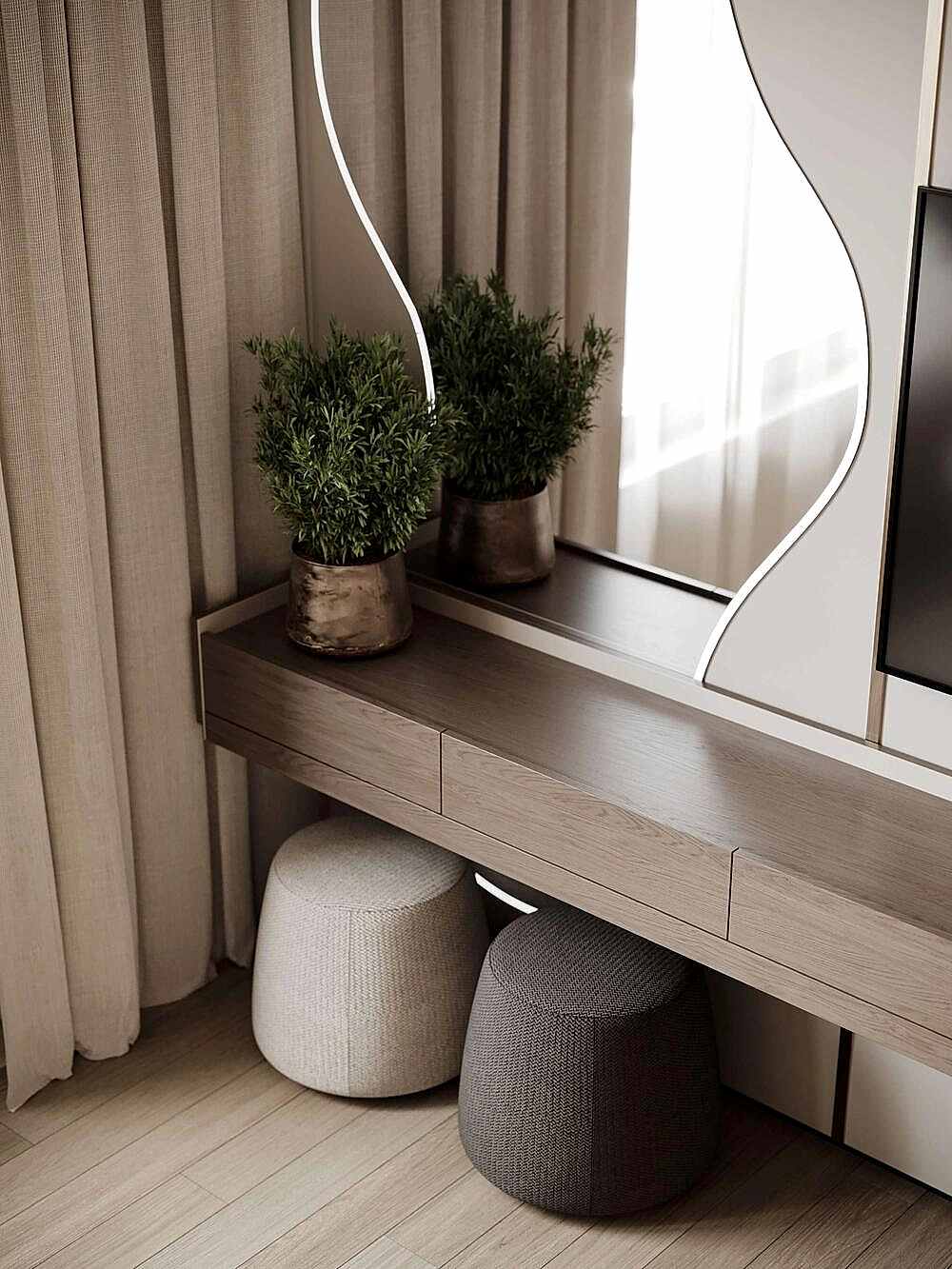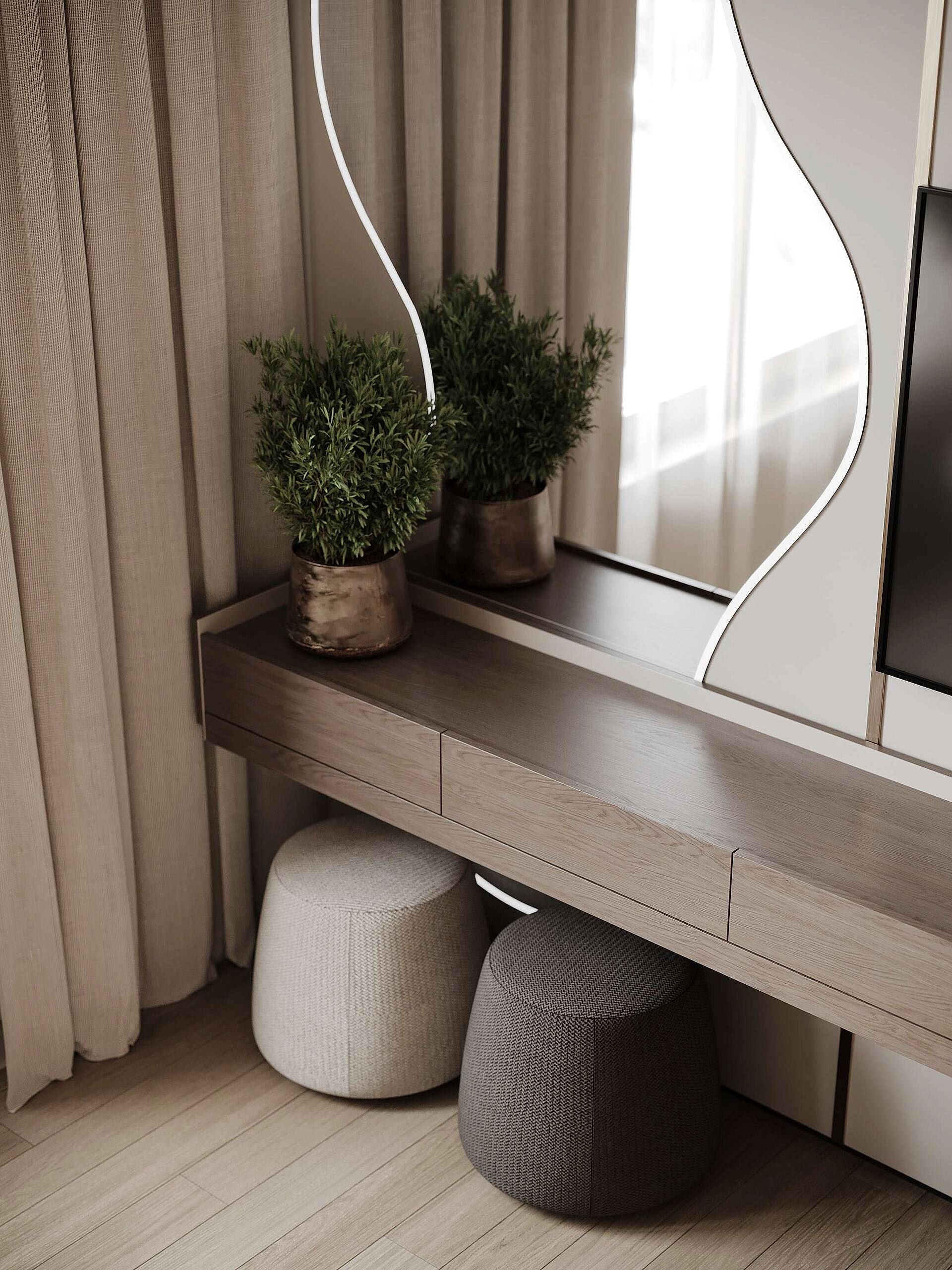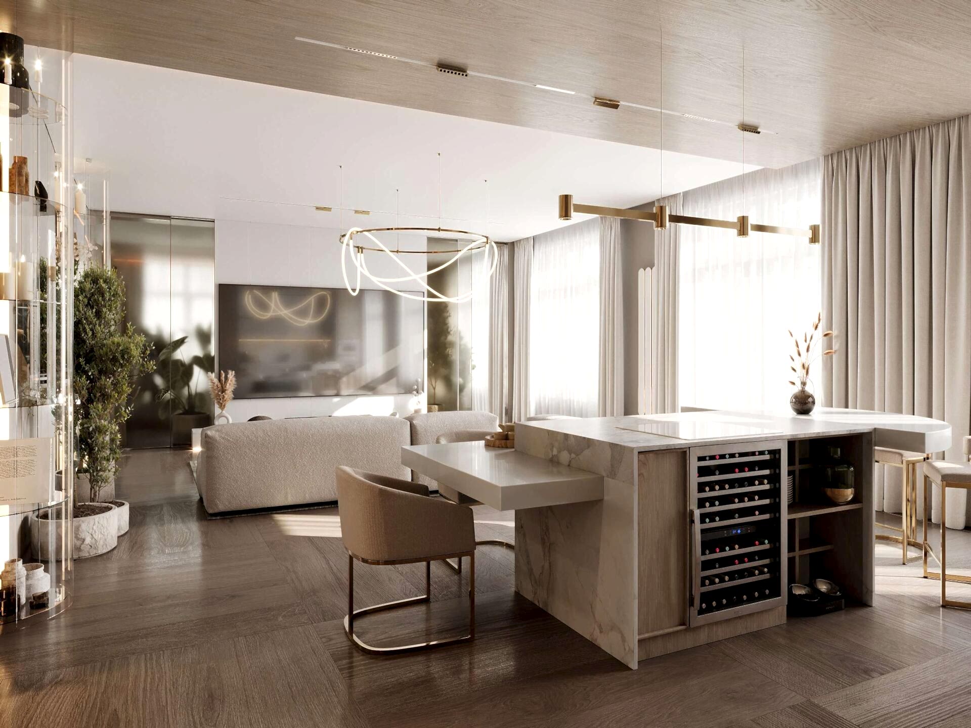 Мы убрали лишние стены и коридоры, чтобы квартира стала просторной и удобной. Теперь здесь можно свободно двигаться, а каждая зона плавно перетекает в другую. Кухня-гостиная продолжается зимним садом, спальня логично соединена с гардеробной, а продуманная планировка даёт несколько Pin-Up передвижения, чтобы всё было удобно и естественно.
