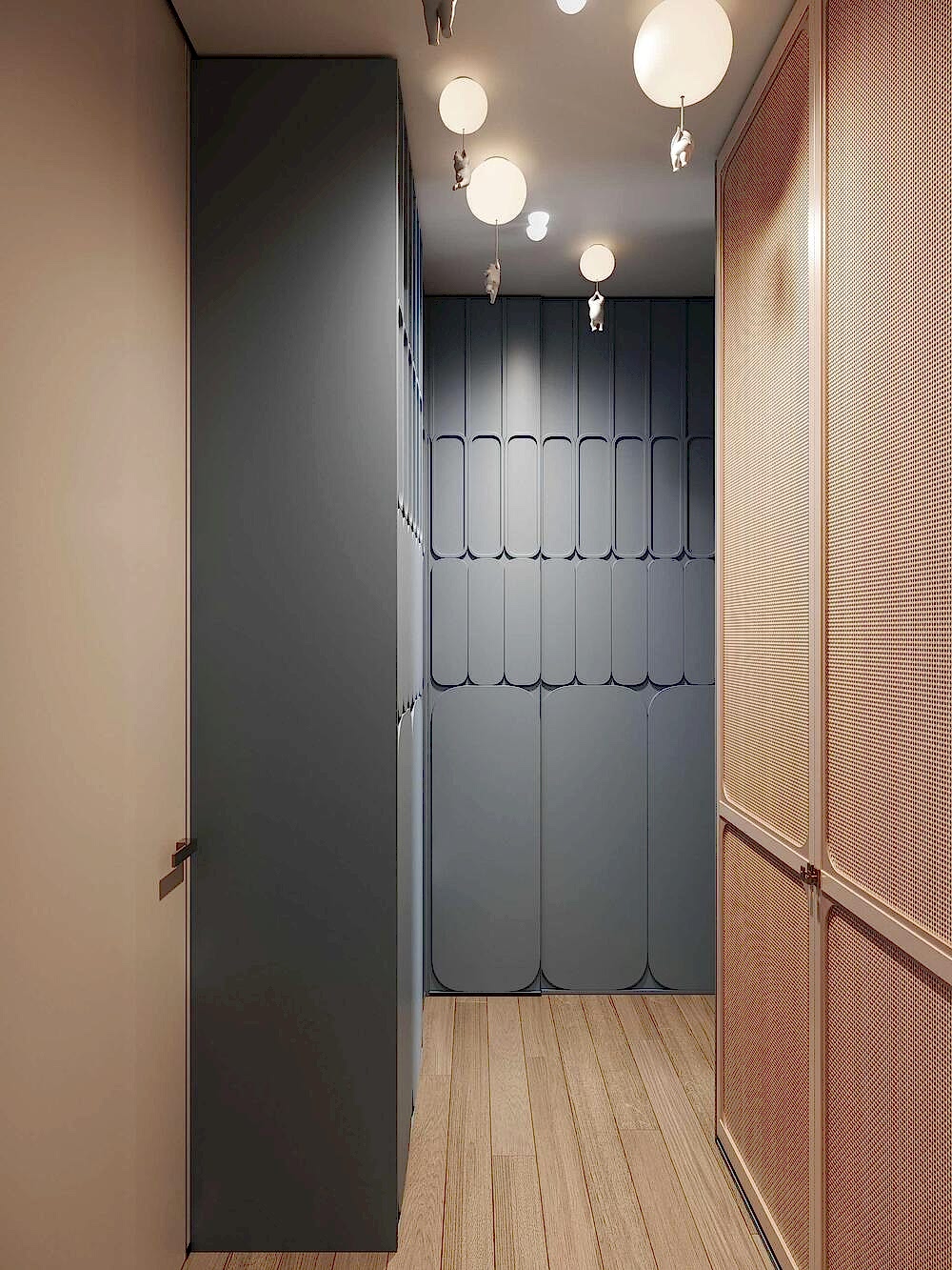 - Полностью встроенная корпусная мебель- здесь нет массивных шкафов, которые Pin-Up пространство - всё спрятано в единый архитектурный рит
