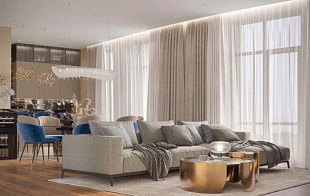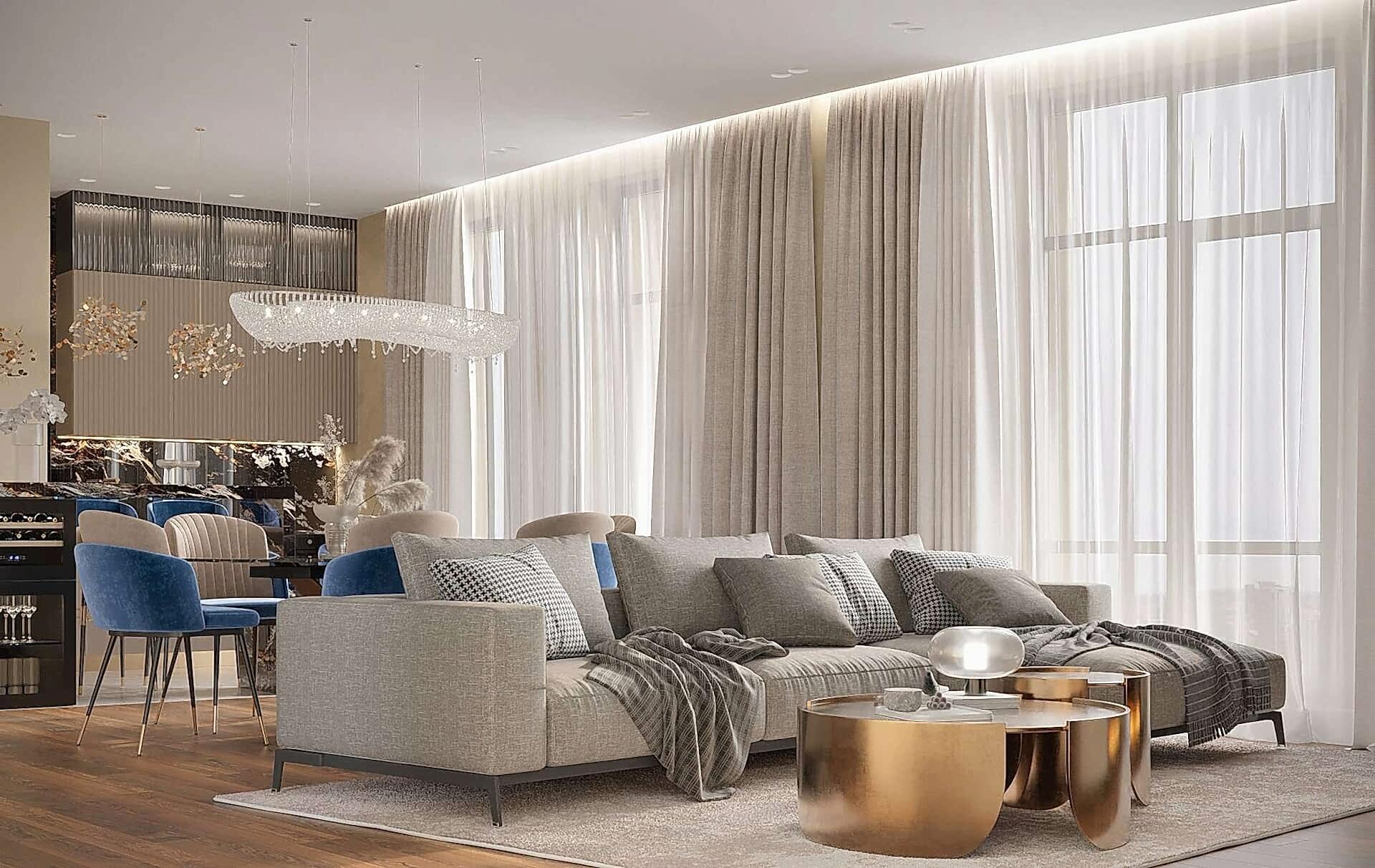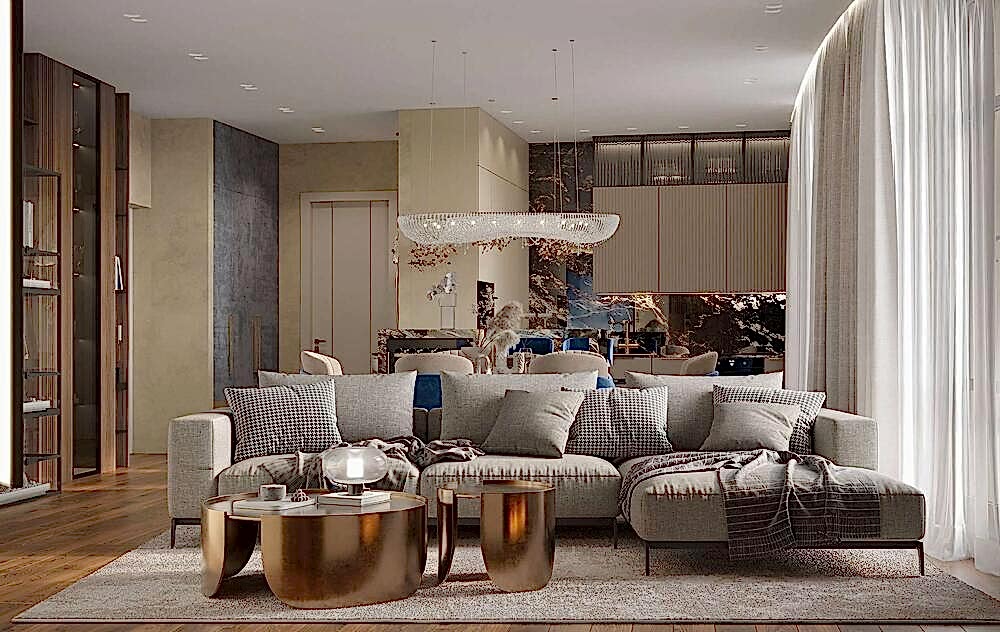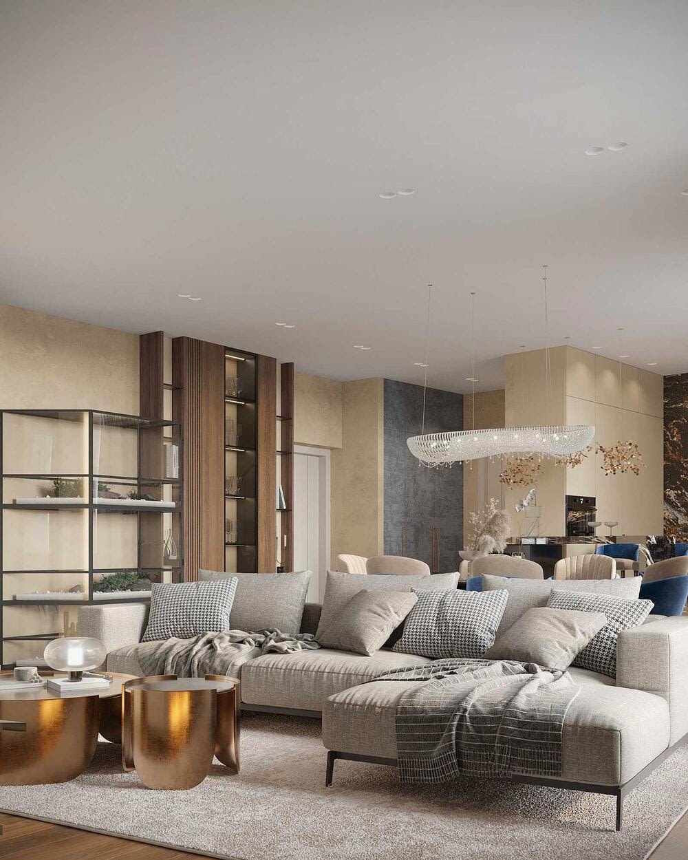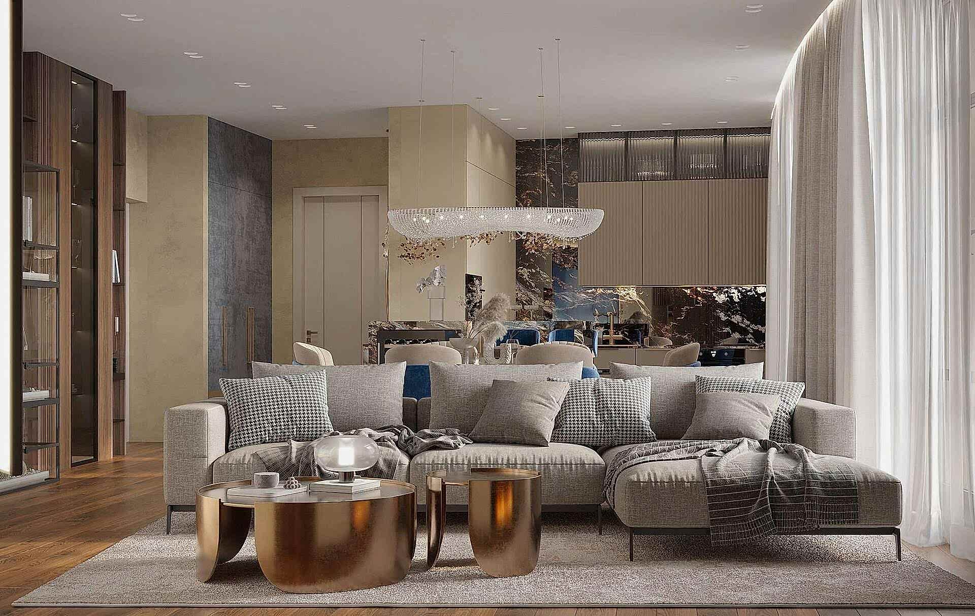 Гостиная выполнена в теплых нейтральных тонах с акцентами на бронзе и темном дереве. Просторный диван с фактурным текстилем, Pin-Up подушки и теплое освещение создают атмосферу уюта. Зона отдыха дополнена журнальными столиками из металла и стеклянным стеллажом, который служит для зонирования. Подвесная люстра с хрустальными элементами добавляет интерьеру элегантности.