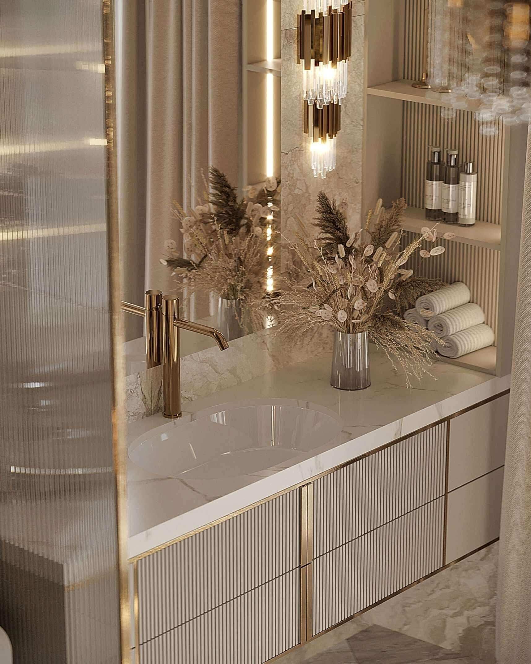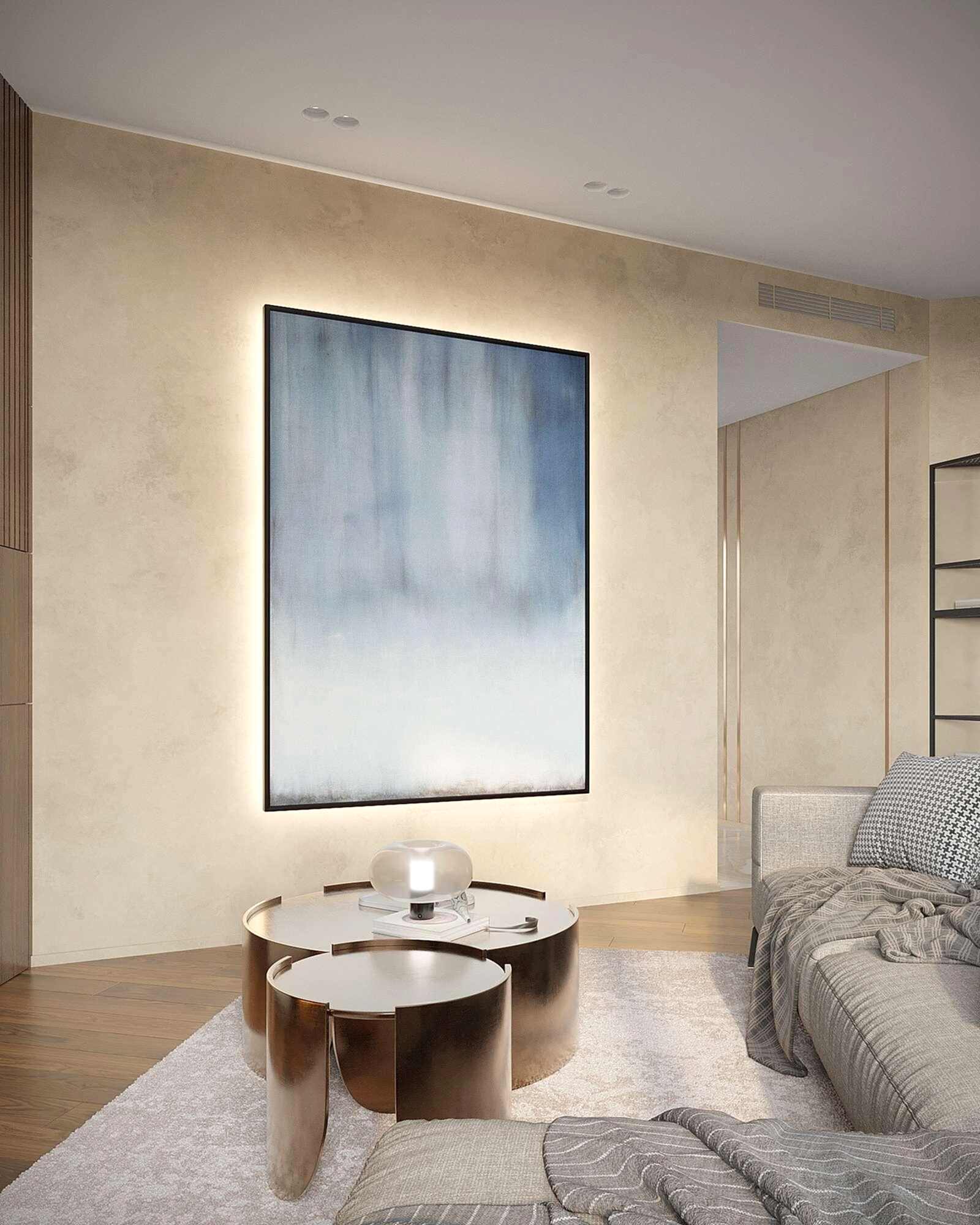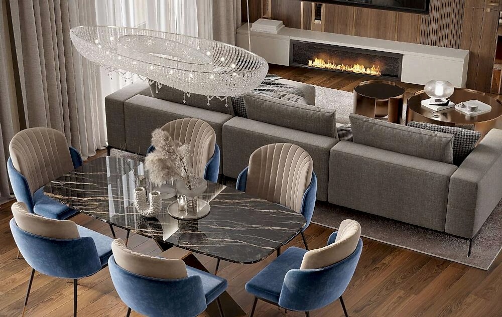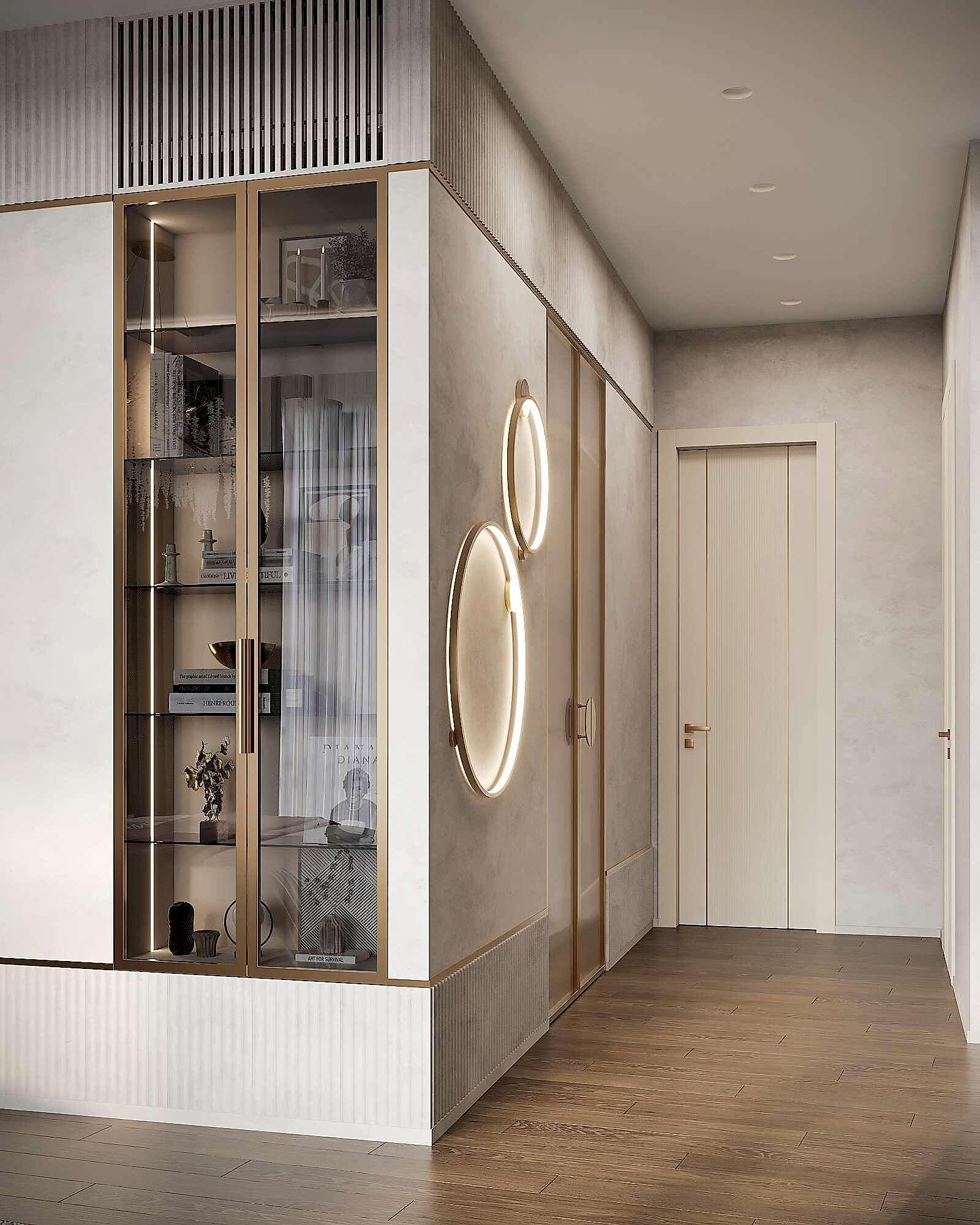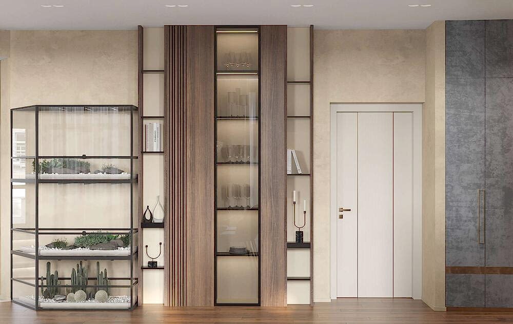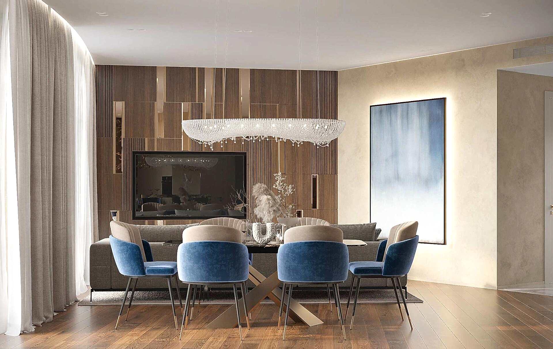 Гостиная выполнена в теплых нейтральных тонах с акцентами на бронзе и темном дереве. Просторный диван с фактурным текстилем, Pin-Up подушки и теплое освещение создают атмосферу уюта. Зона отдыха дополнена журнальными столиками из металла и стеклянным стеллажом, который служит для зонирования. Подвесная люстра с хрустальными элементами добавляет интерьеру элегантности.