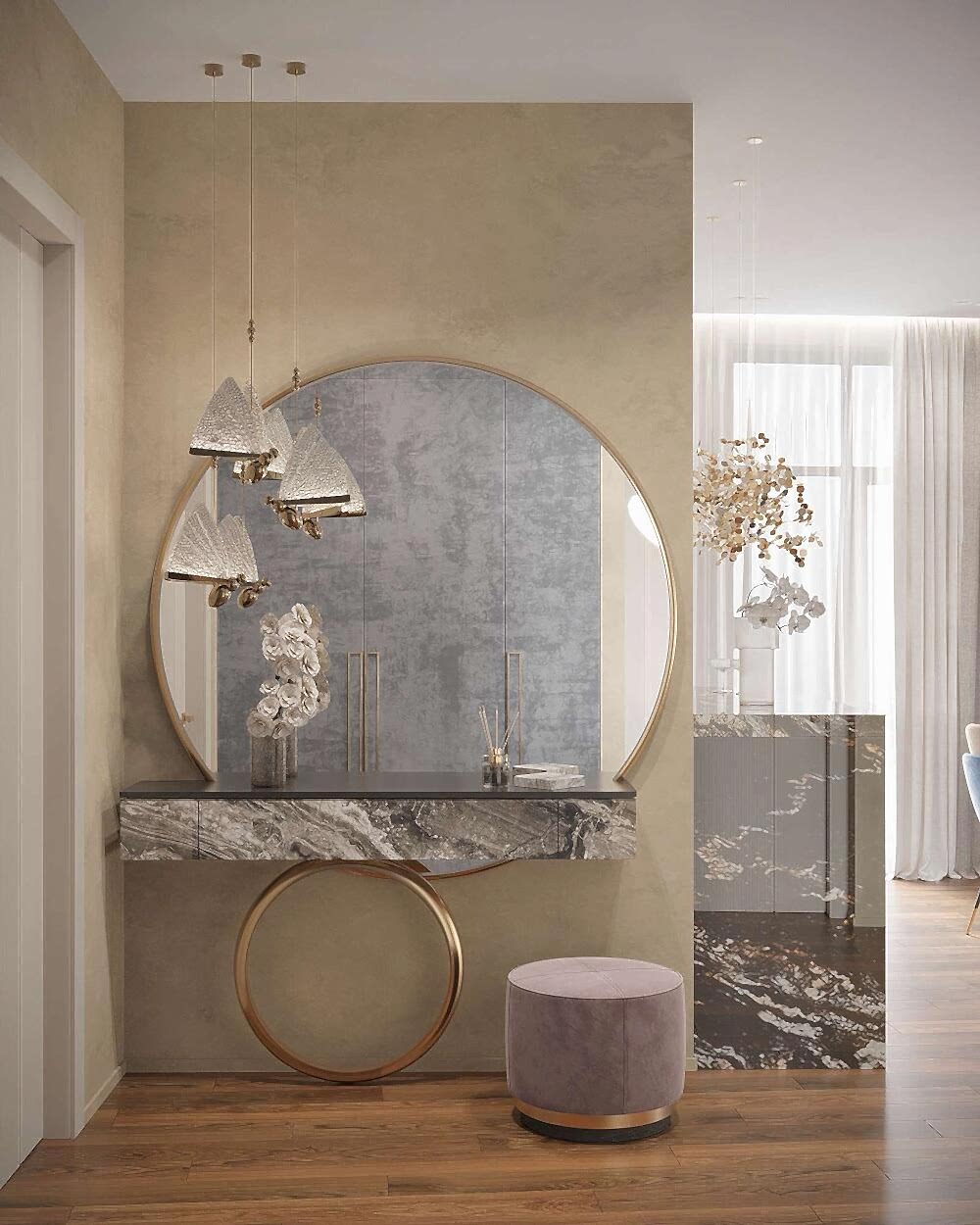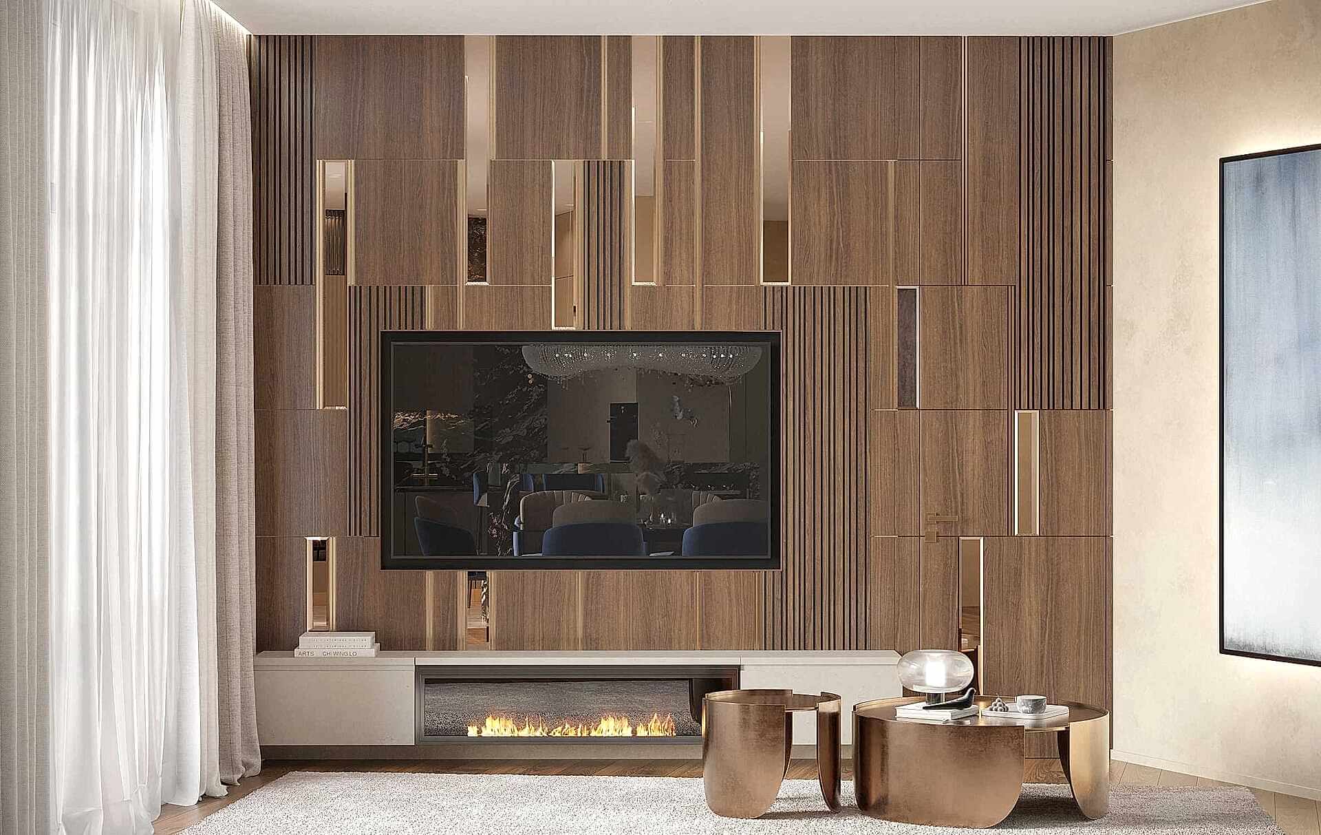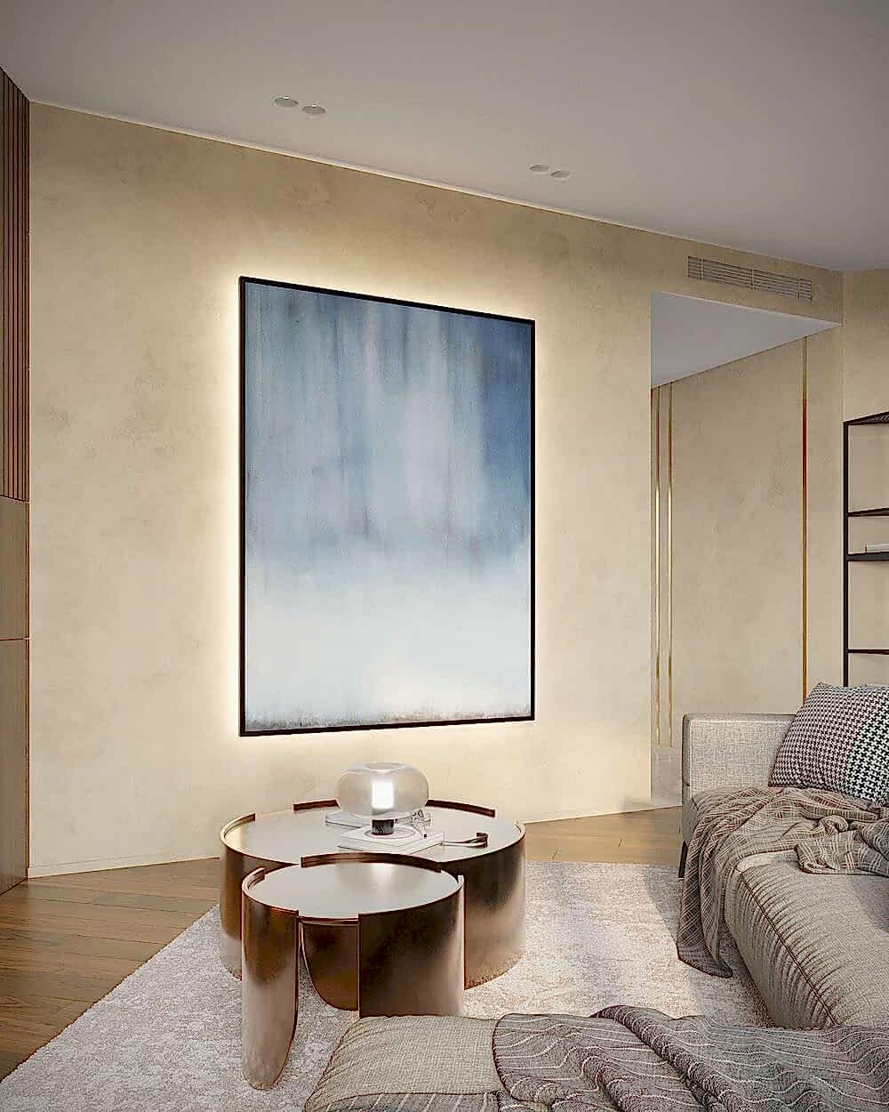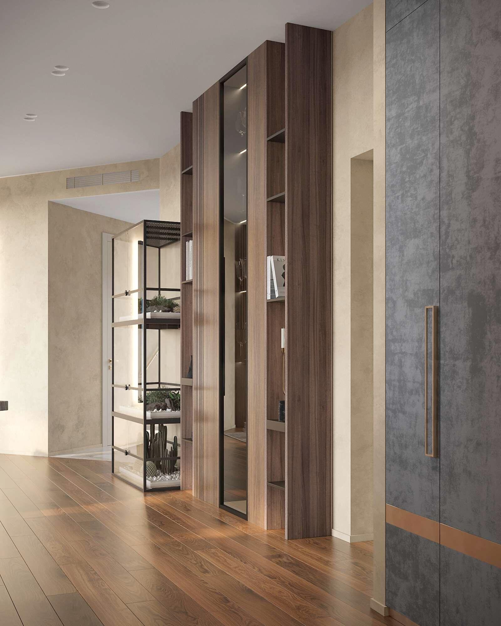 Гостиная выполнена в теплых нейтральных тонах с акцентами на бронзе и темном дереве. Просторный диван с фактурным текстилем, Pin-Up подушки и теплое освещение создают атмосферу уюта. Зона отдыха дополнена журнальными столиками из металла и стеклянным стеллажом, который служит для зонирования. Подвесная люстра с хрустальными элементами добавляет интерьеру элегантности.