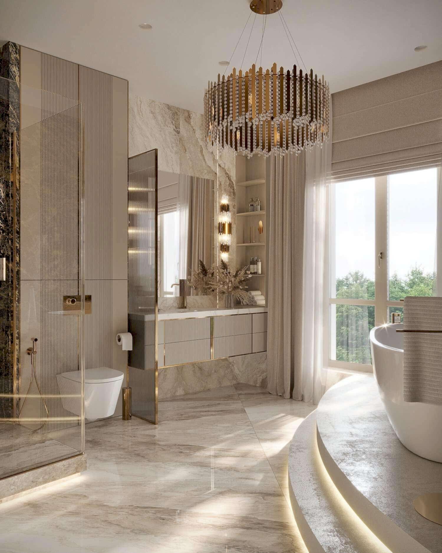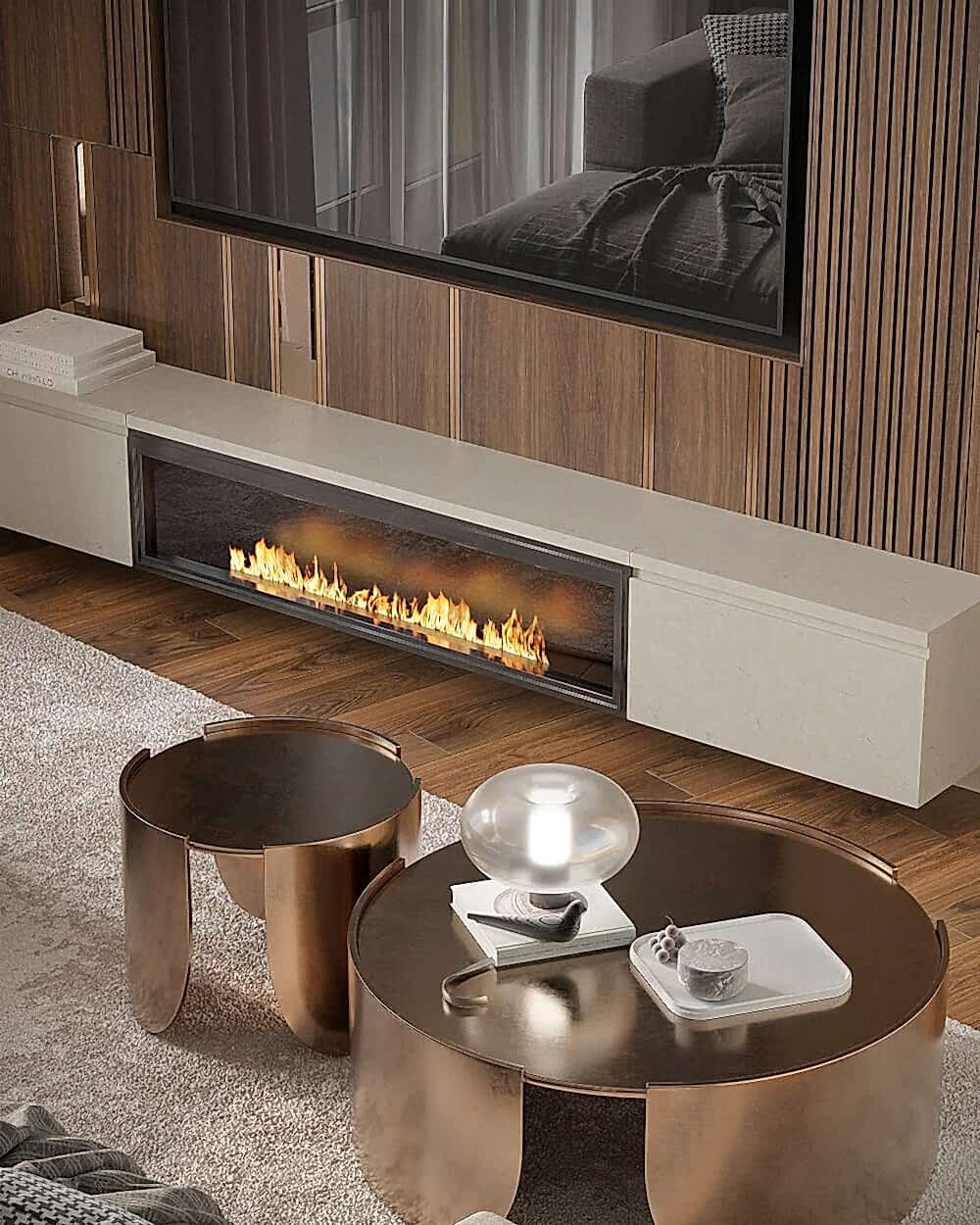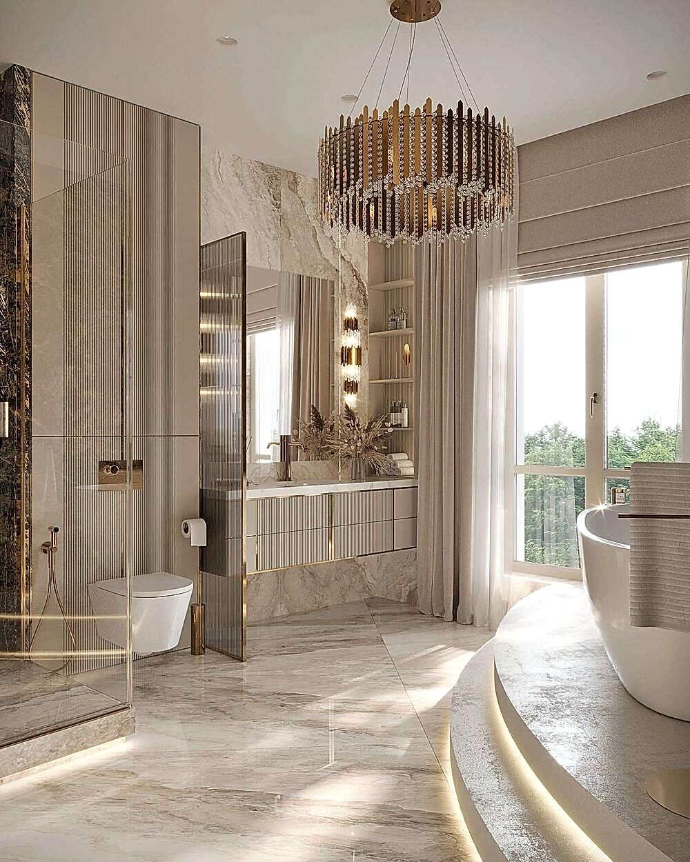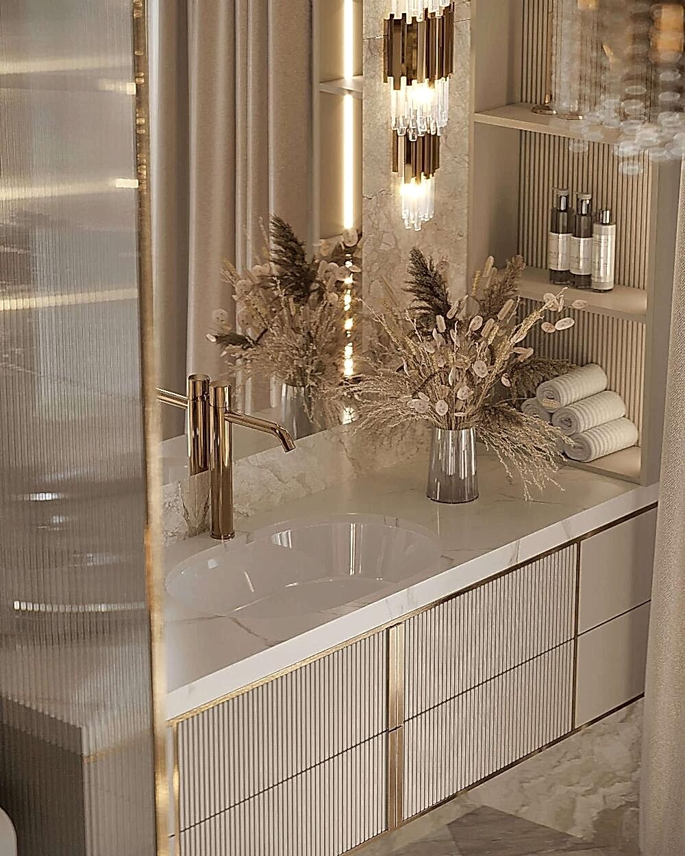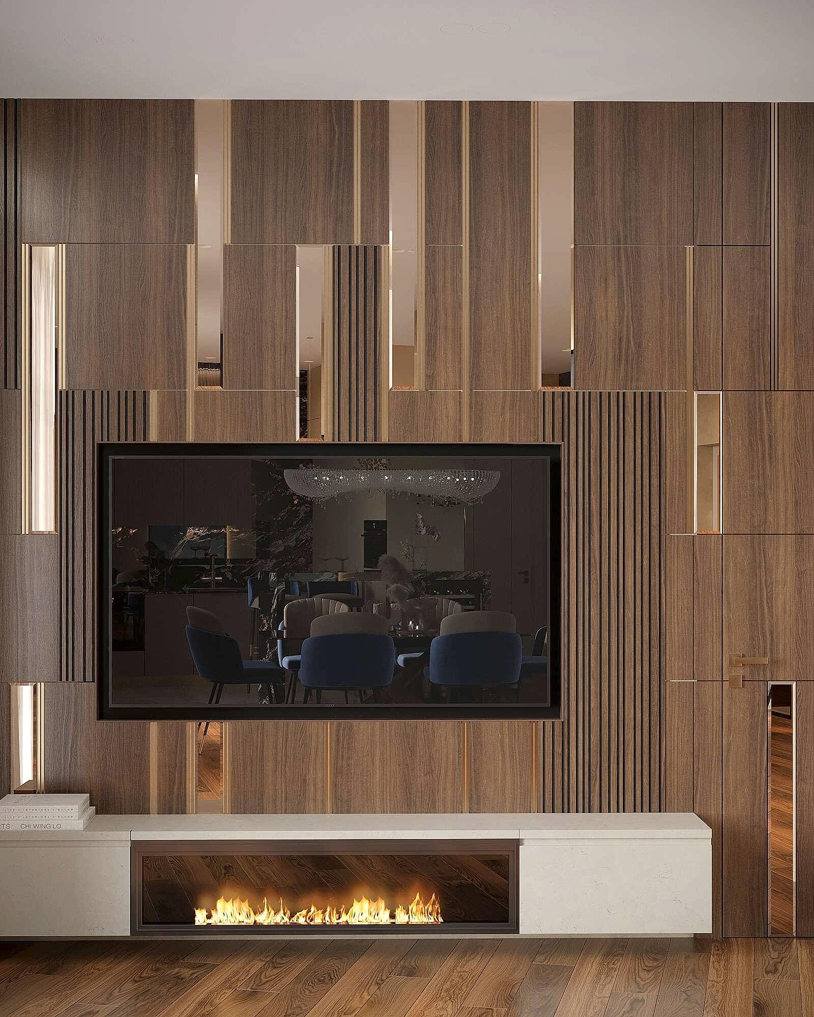 Гостиная выполнена в теплых нейтральных тонах с акцентами на бронзе и темном дереве. Просторный диван с фактурным текстилем, Pin-Up подушки и теплое освещение создают атмосферу уюта. Зона отдыха дополнена журнальными столиками из металла и стеклянным стеллажом, который служит для зонирования. Подвесная люстра с хрустальными элементами добавляет интерьеру элегантности.