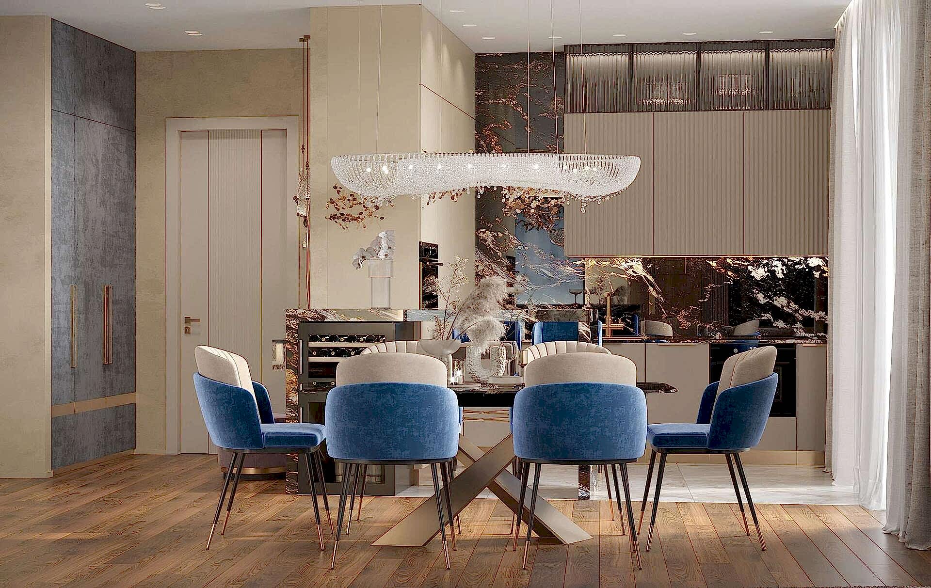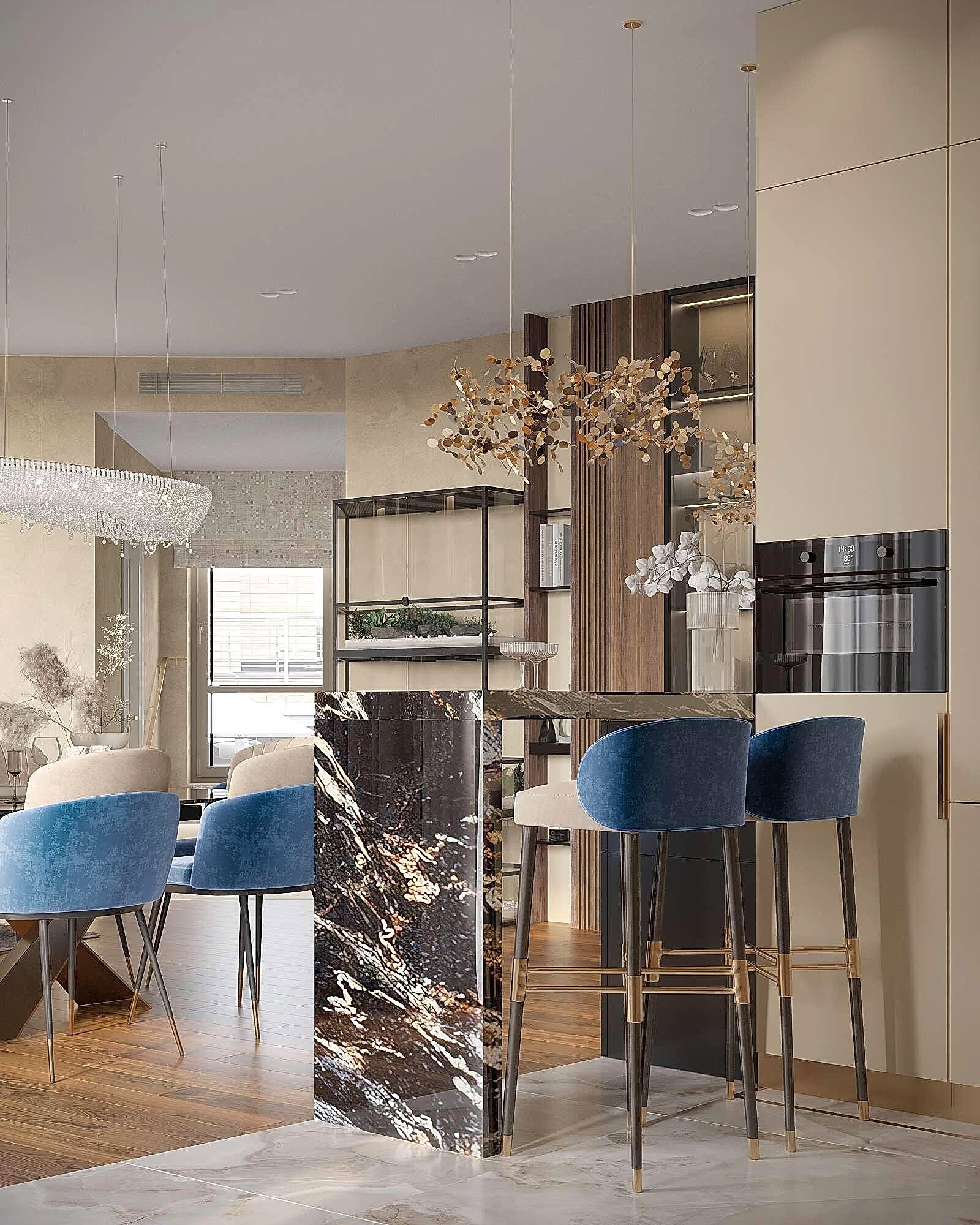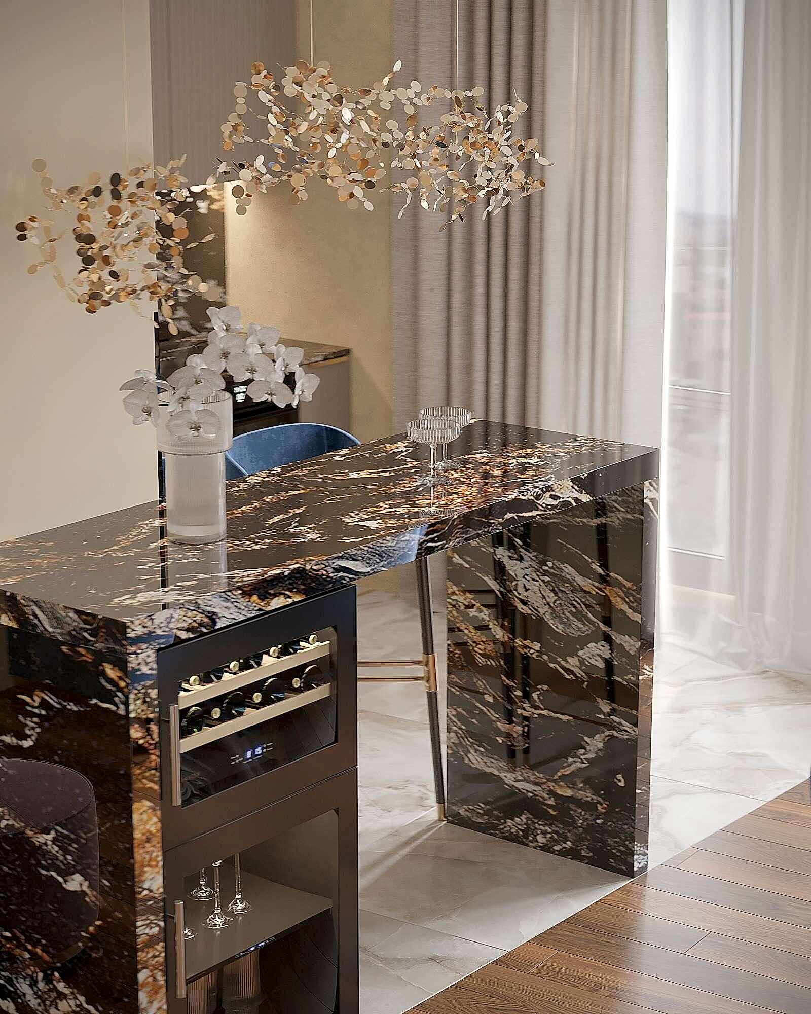 Кухня оформлена в современном стиле с акцентом на роскошь и Pin-Up Барная стойка с подвесными светильниками стала стильным акцентом, который подчеркивает современный характер интерьера.