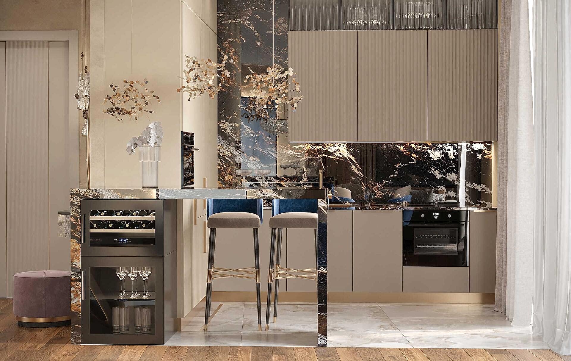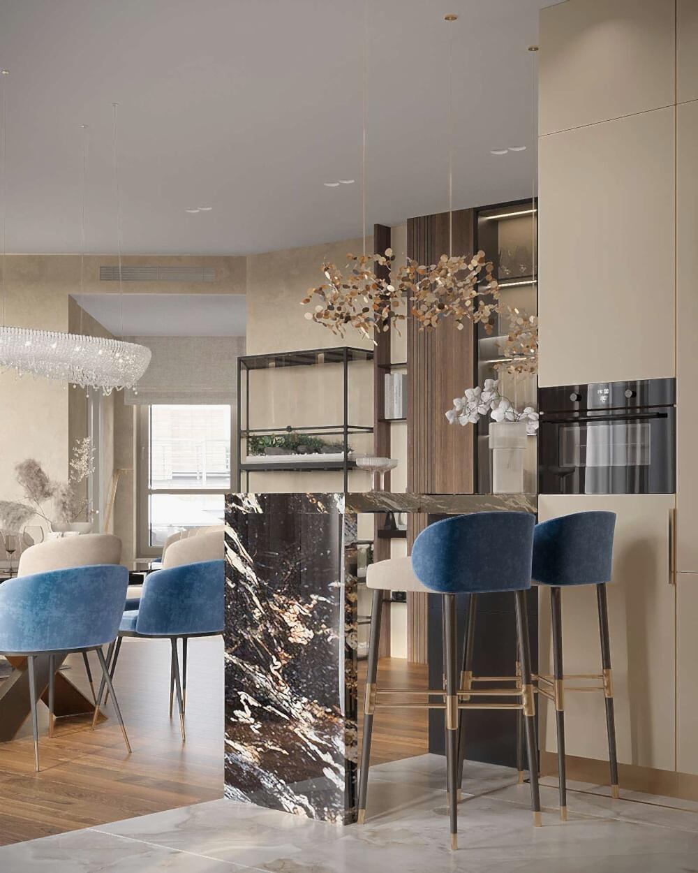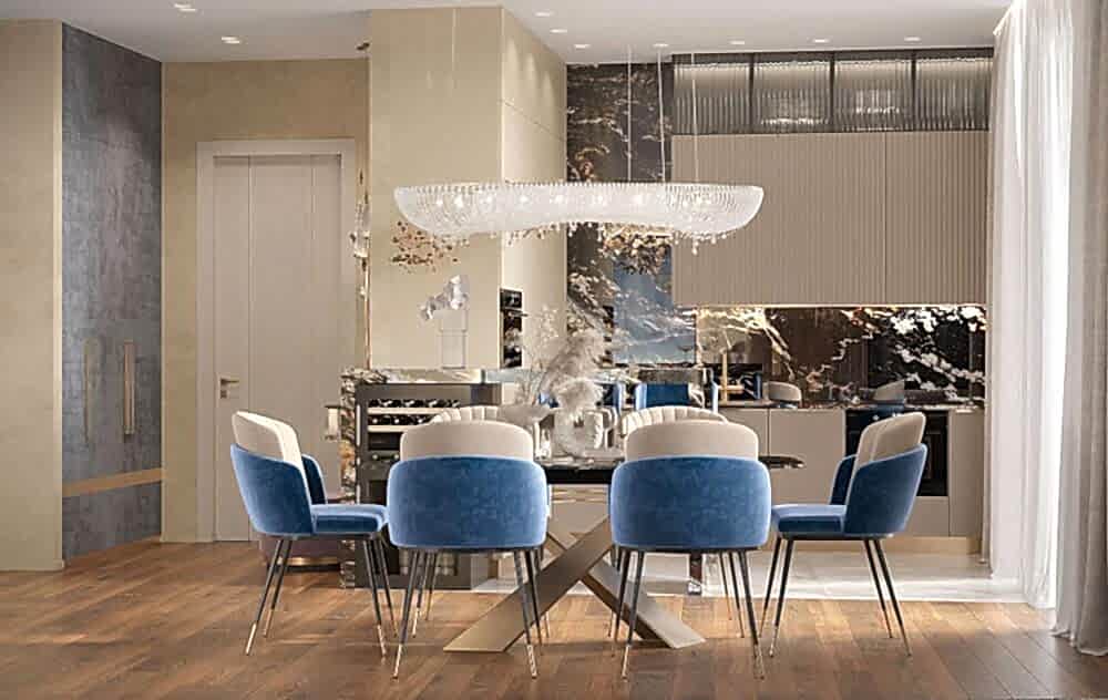 Кухня оформлена в современном стиле с акцентом на роскошь и Pin-Up Барная стойка с подвесными светильниками стала стильным акцентом, который подчеркивает современный характер интерьера.