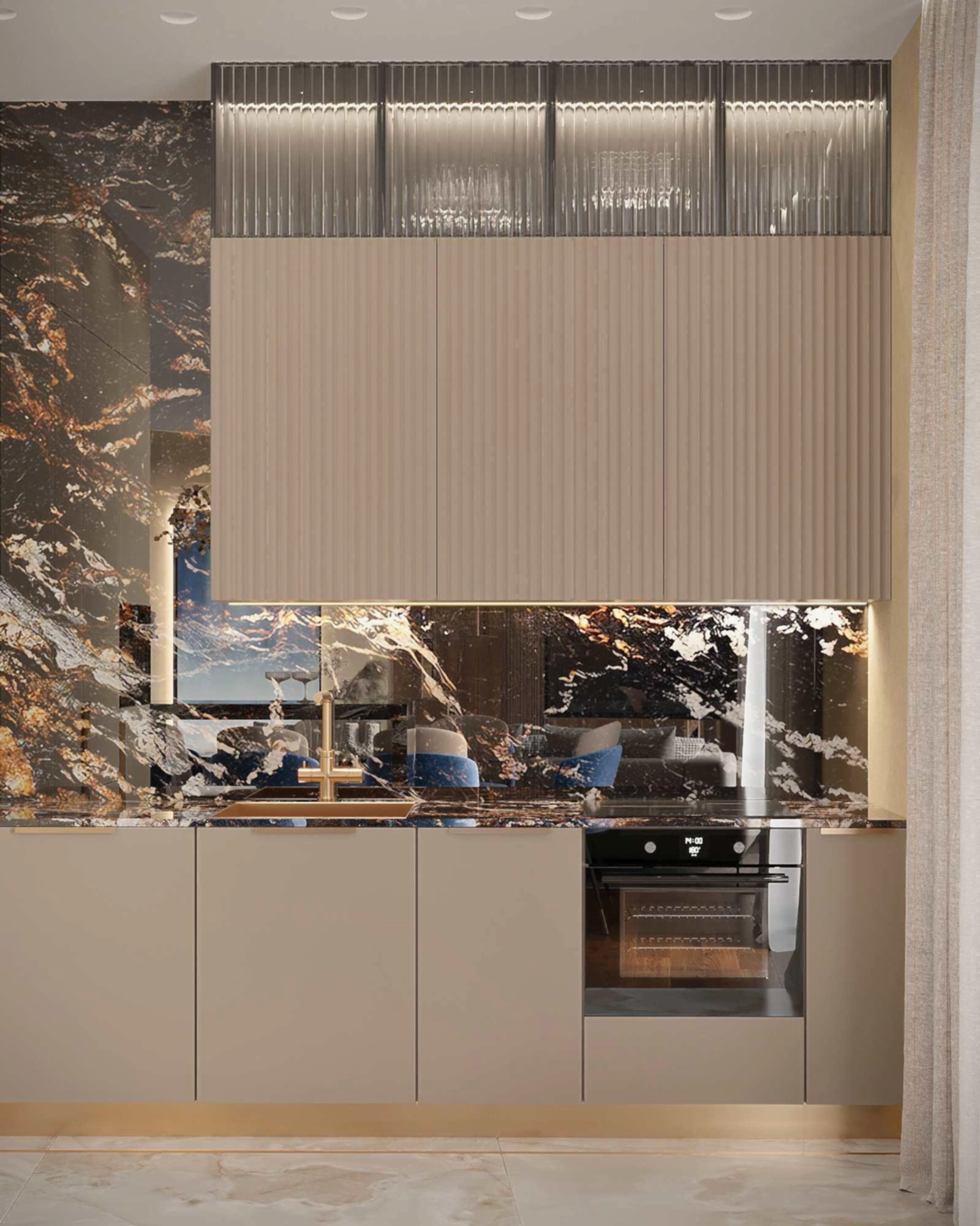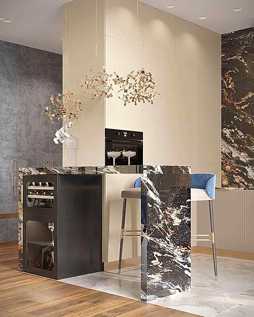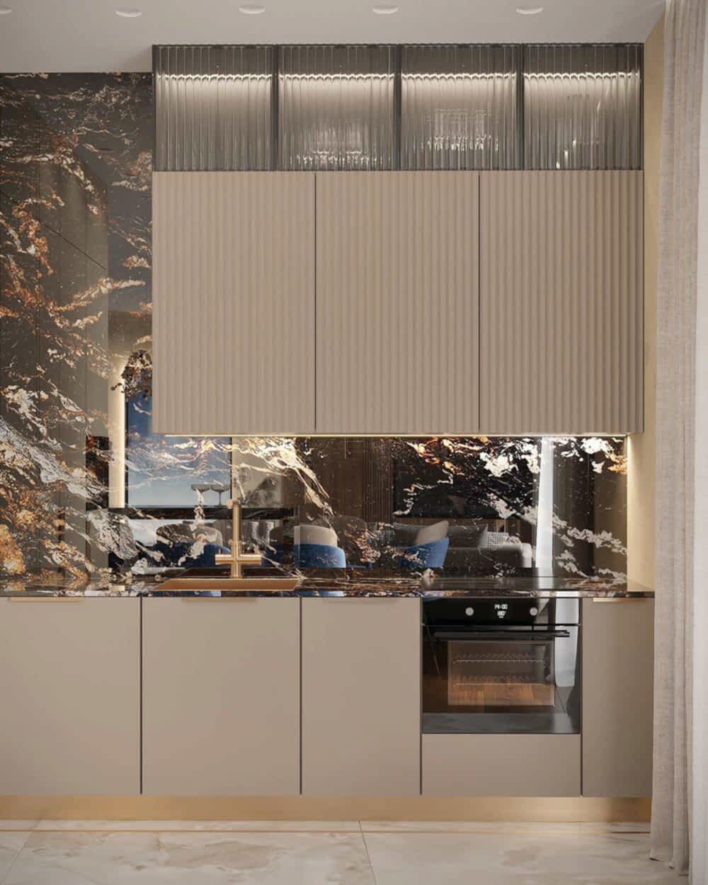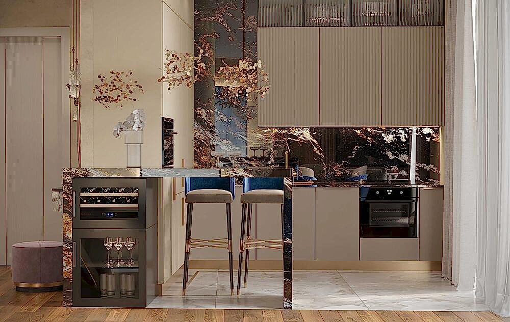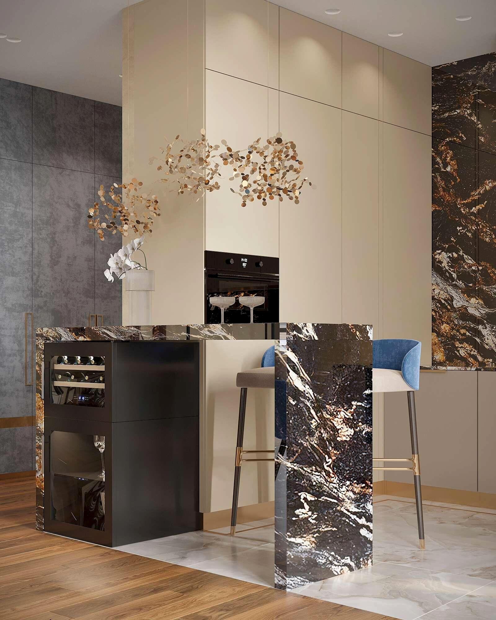 Мраморный фартук с выразительным природным рисунком, где темные и золотистые акценты создают эффект динамики и глубины. Столешница и Pin-Up объединены единой каменной структурой, что визуально связывает зоны готовки и хранения.