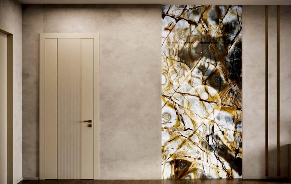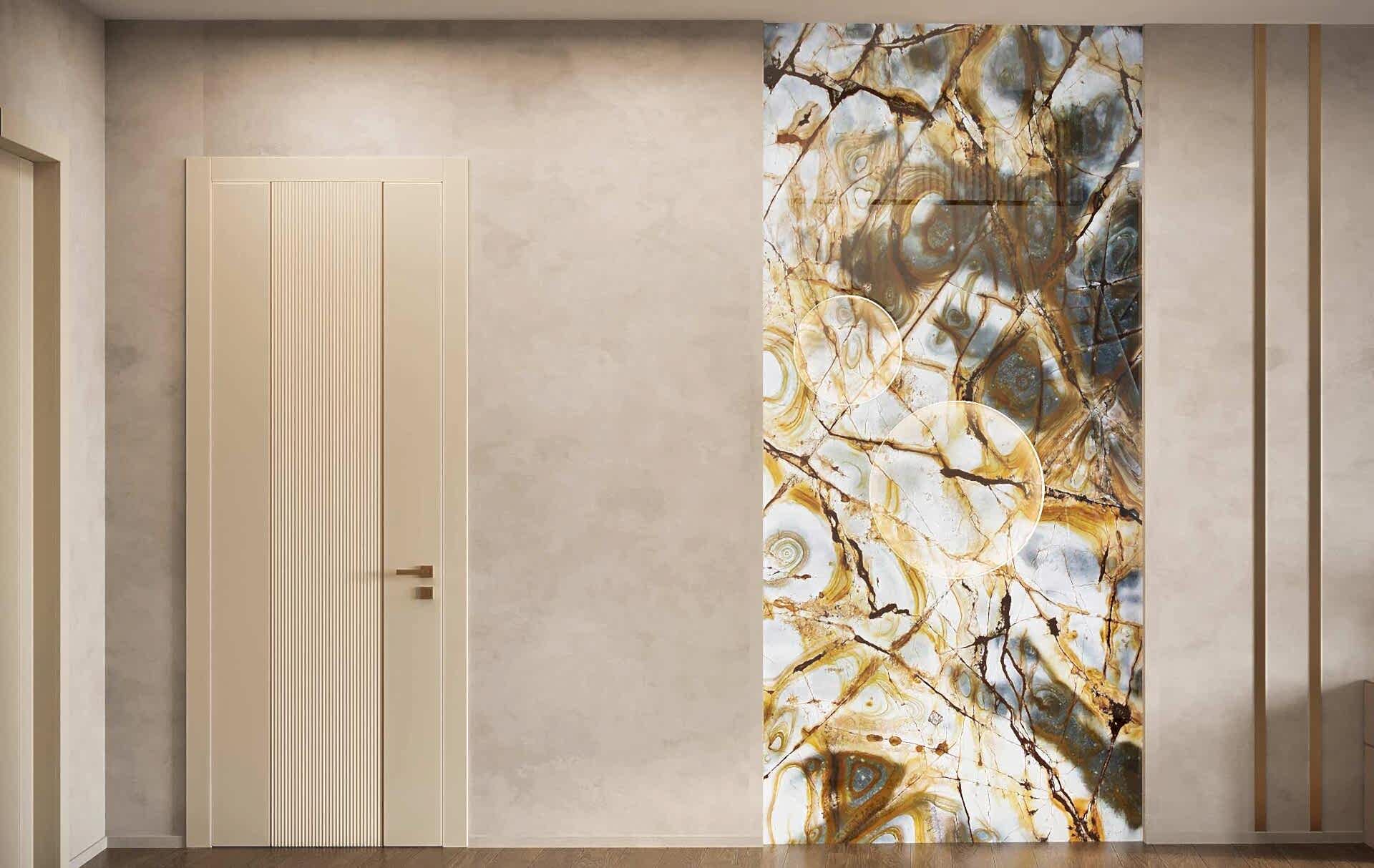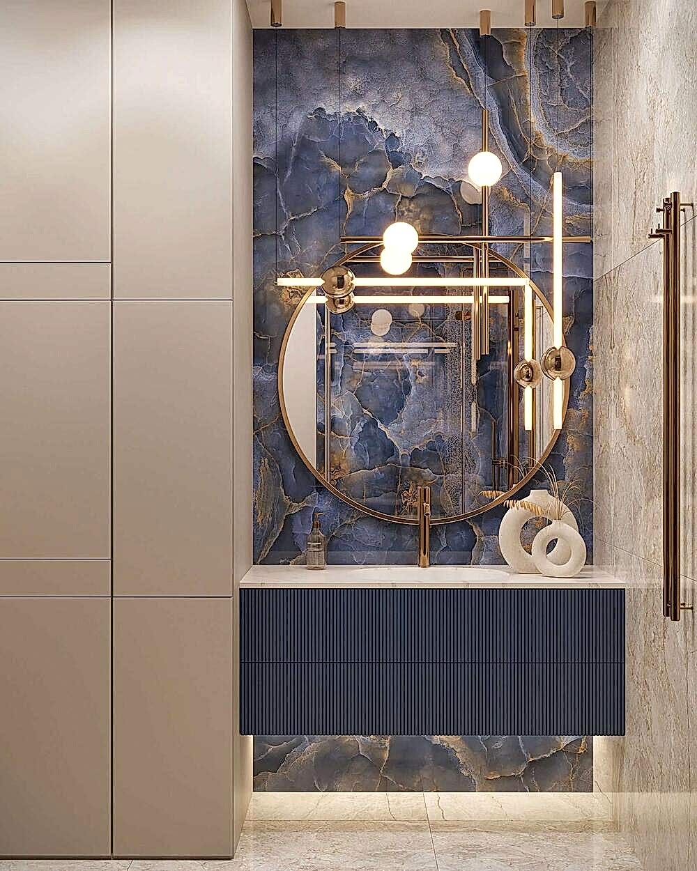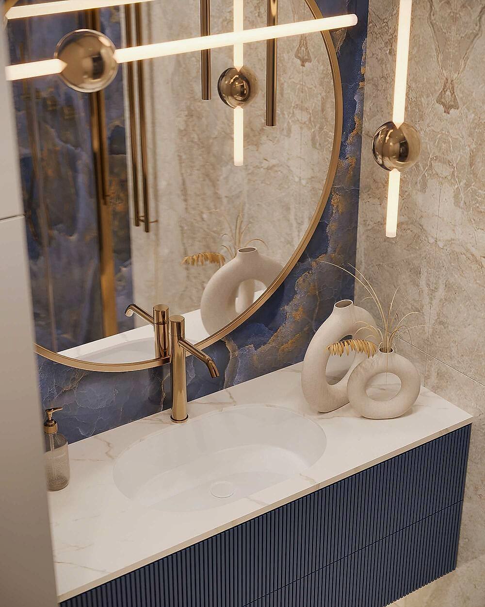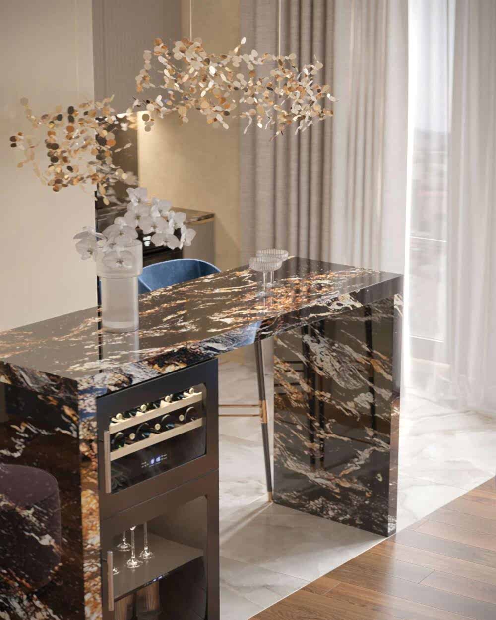Мраморный фартук с выразительным природным рисунком, где темные и золотистые акценты создают эффект динамики и глубины. Столешница и Pin-Up объединены единой каменной структурой, что визуально связывает зоны готовки и хранения.