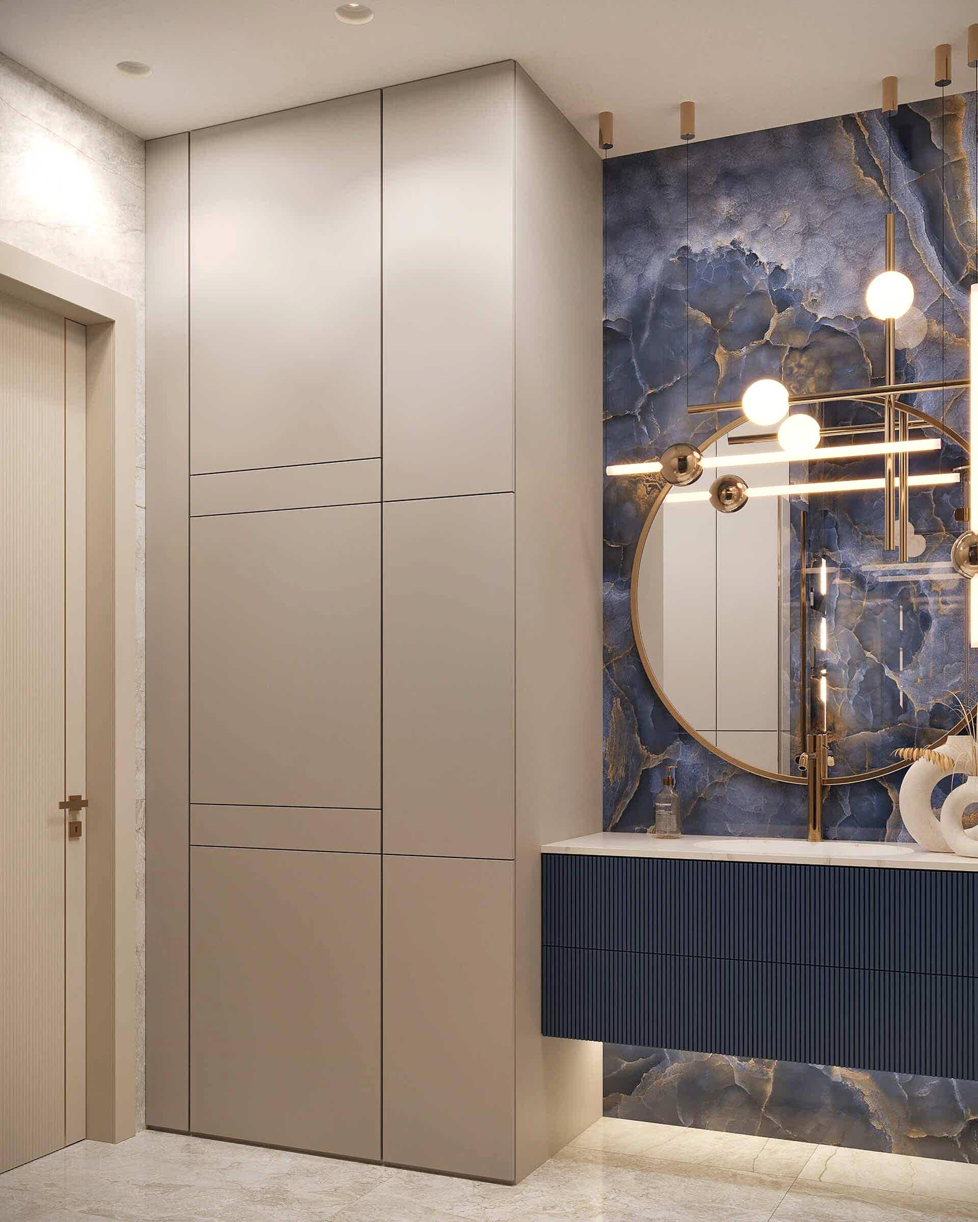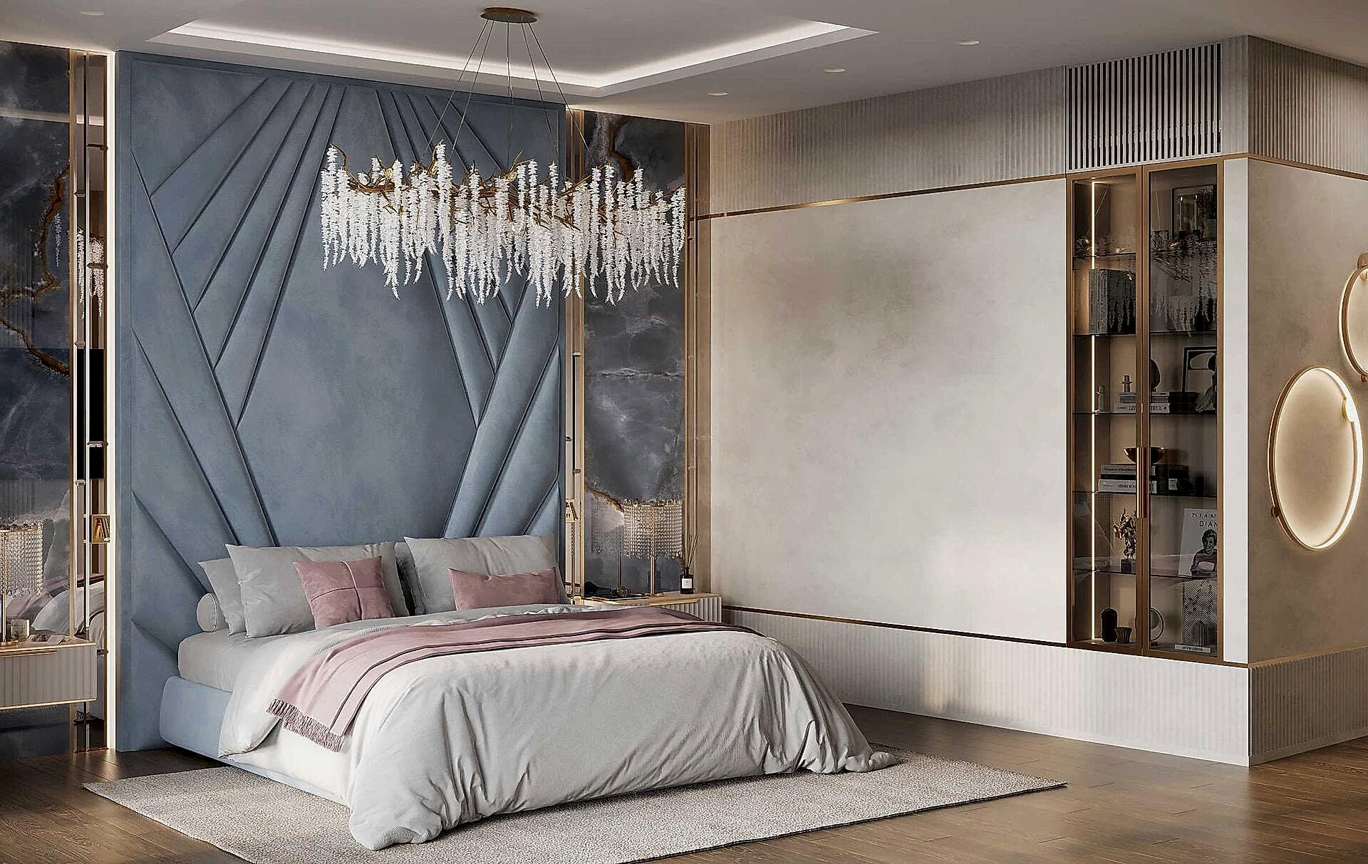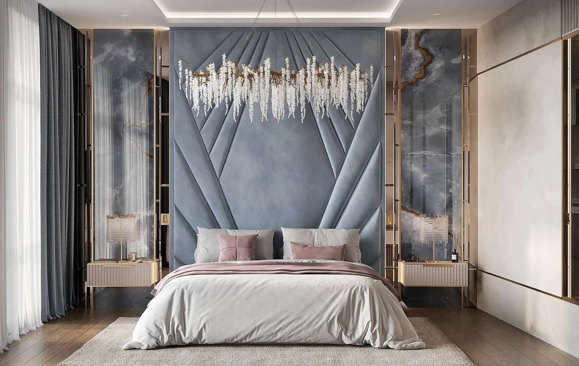 Спальня оформлена вмягкой, спокойной палитрес акцентом на глубоком синем Pin-Up Изголовье кровати украшенобархатной геометрической панелью. Натуральные Pin-Up зеркальные вставки и мраморные панели добавляют интерьеру роскоши. Легкий текстиль в серых и пудровых тонах смягчает обстановку. Люстра с хрустальными элементами подчеркивает элегантность интерьера.