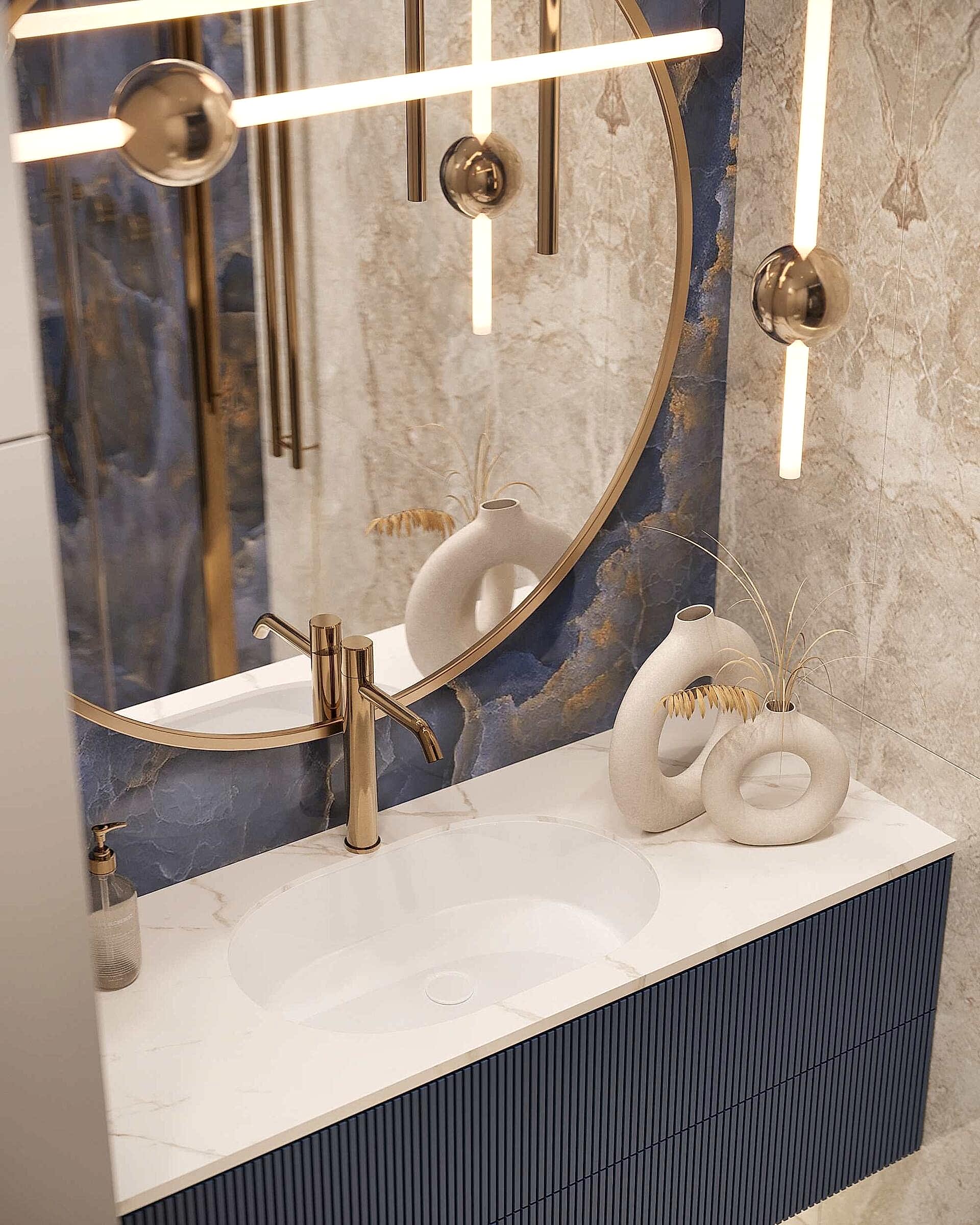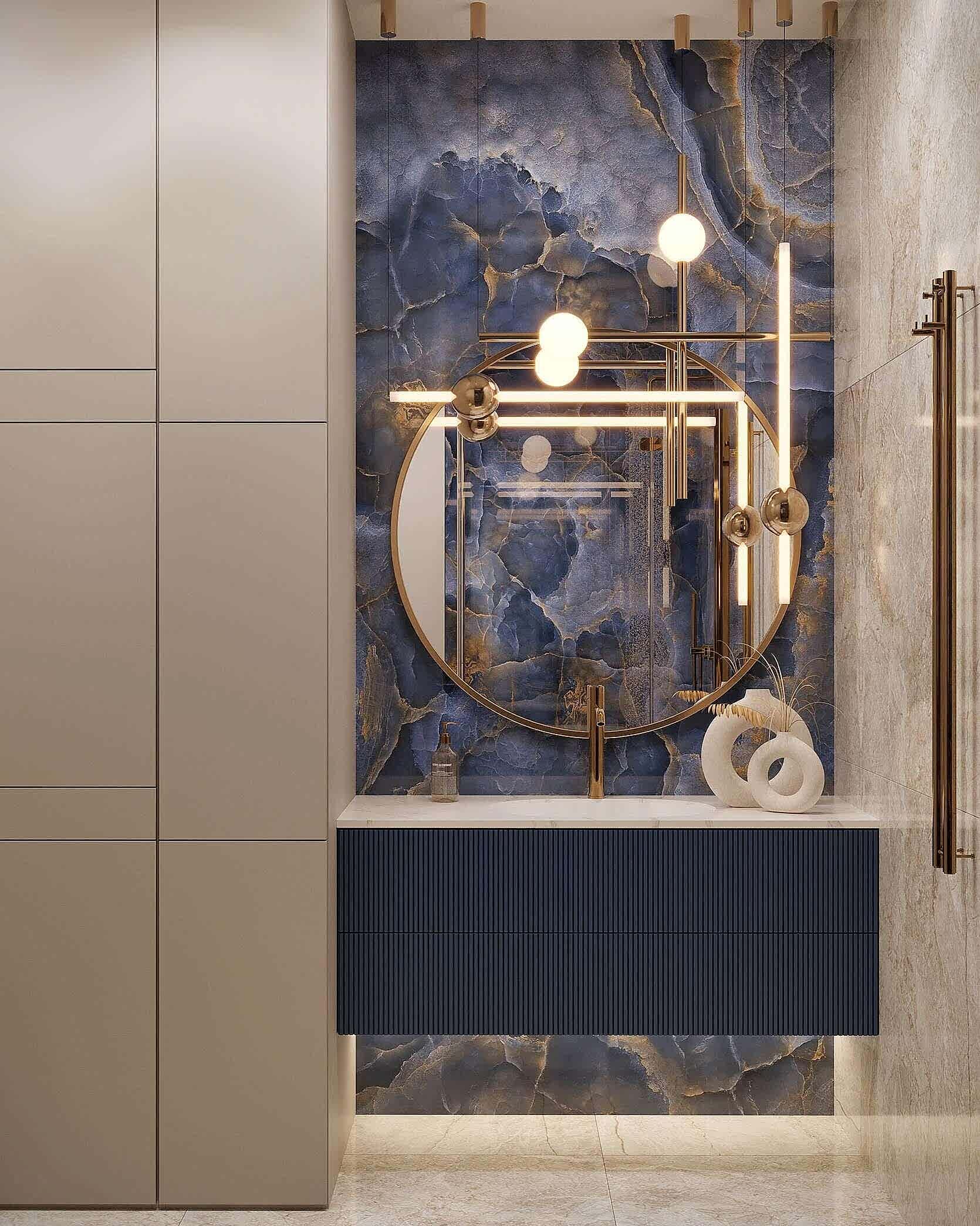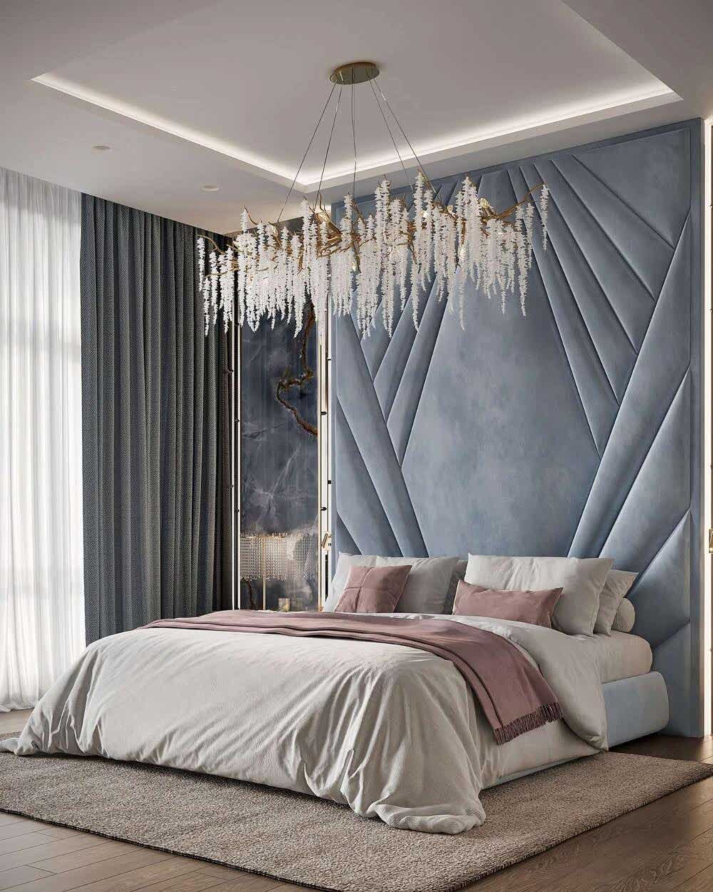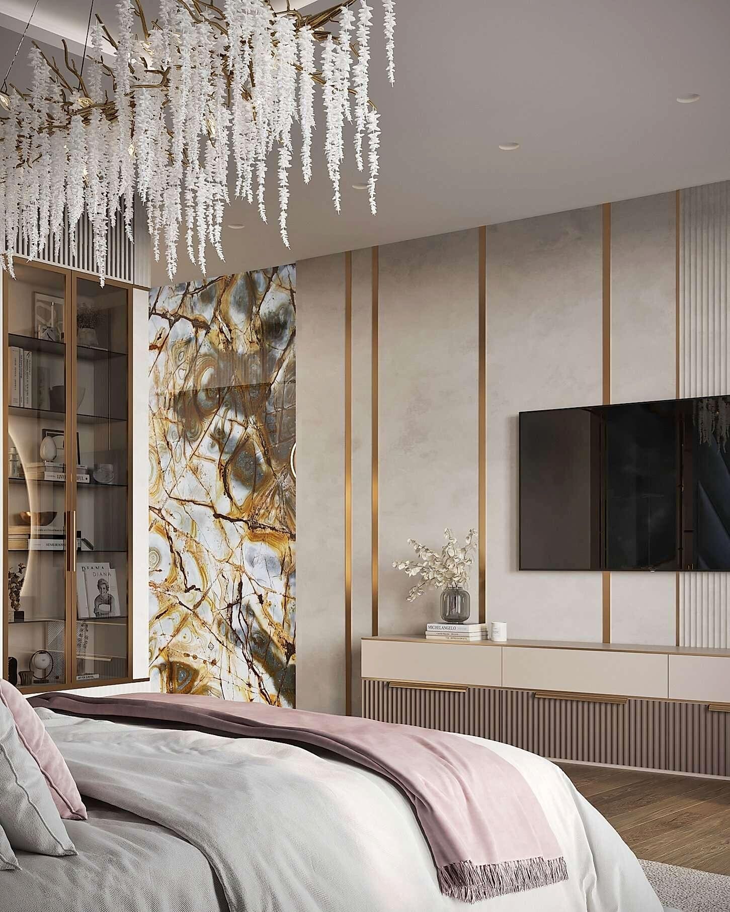 Спальня оформлена вмягкой, спокойной палитрес акцентом на глубоком синем Pin-Up Изголовье кровати украшенобархатной геометрической панелью. Натуральные Pin-Up зеркальные вставки и мраморные панели добавляют интерьеру роскоши. Легкий текстиль в серых и пудровых тонах смягчает обстановку. Люстра с хрустальными элементами подчеркивает элегантность интерьера.