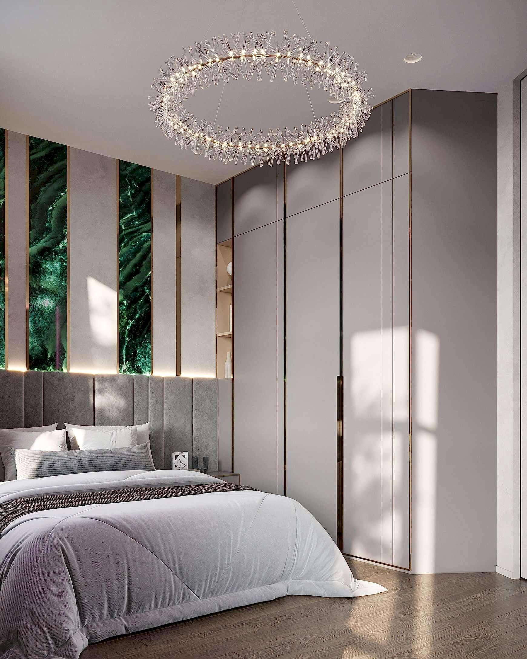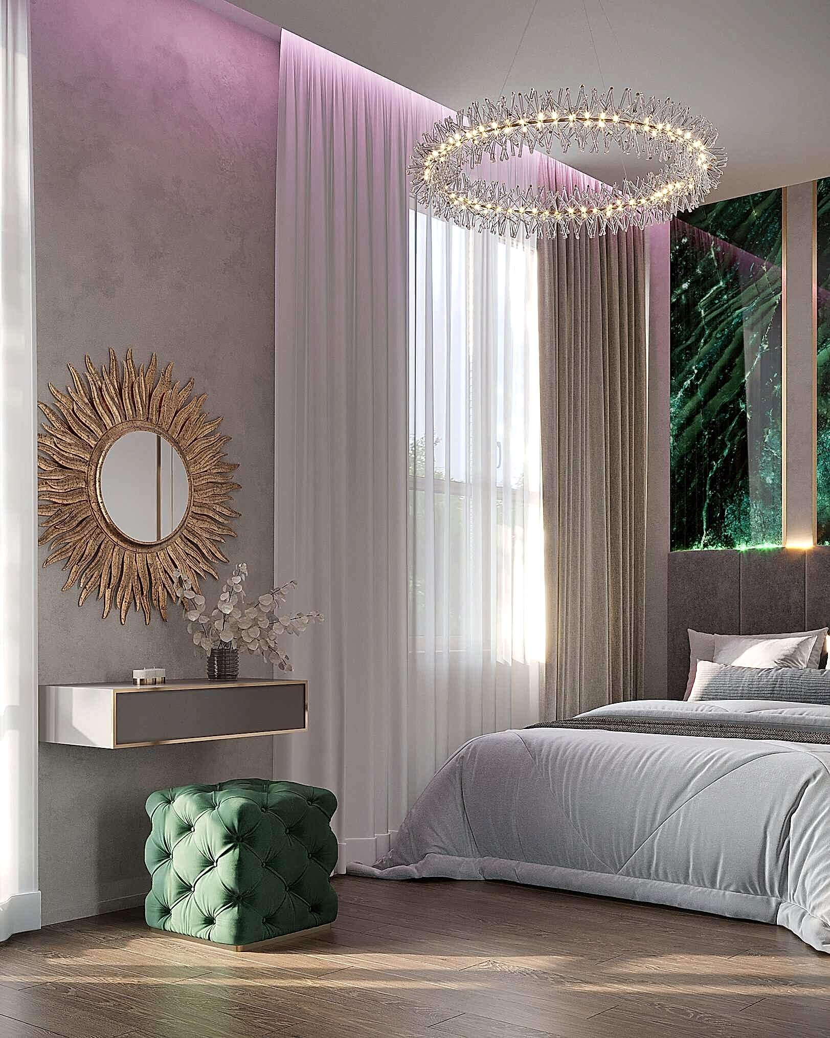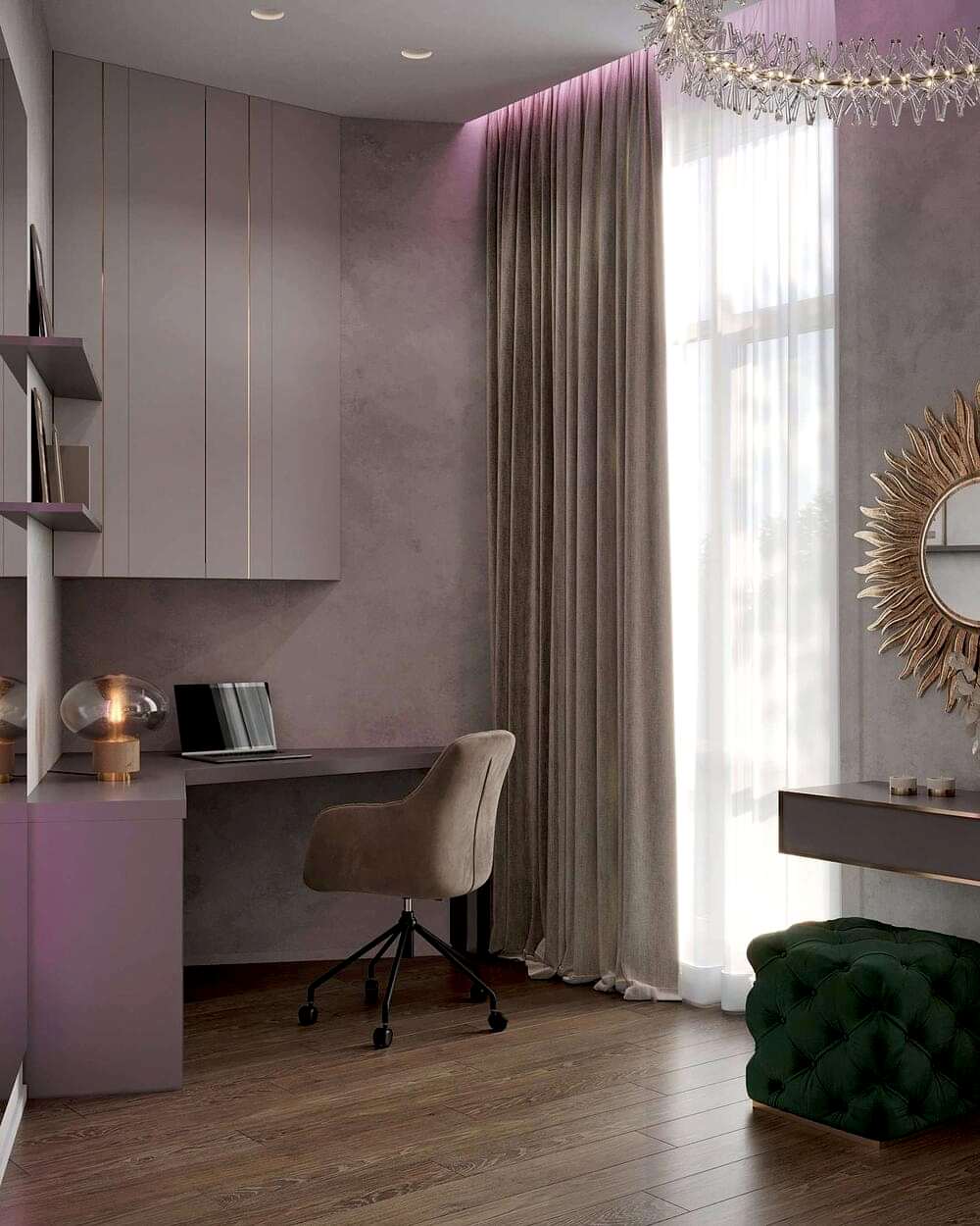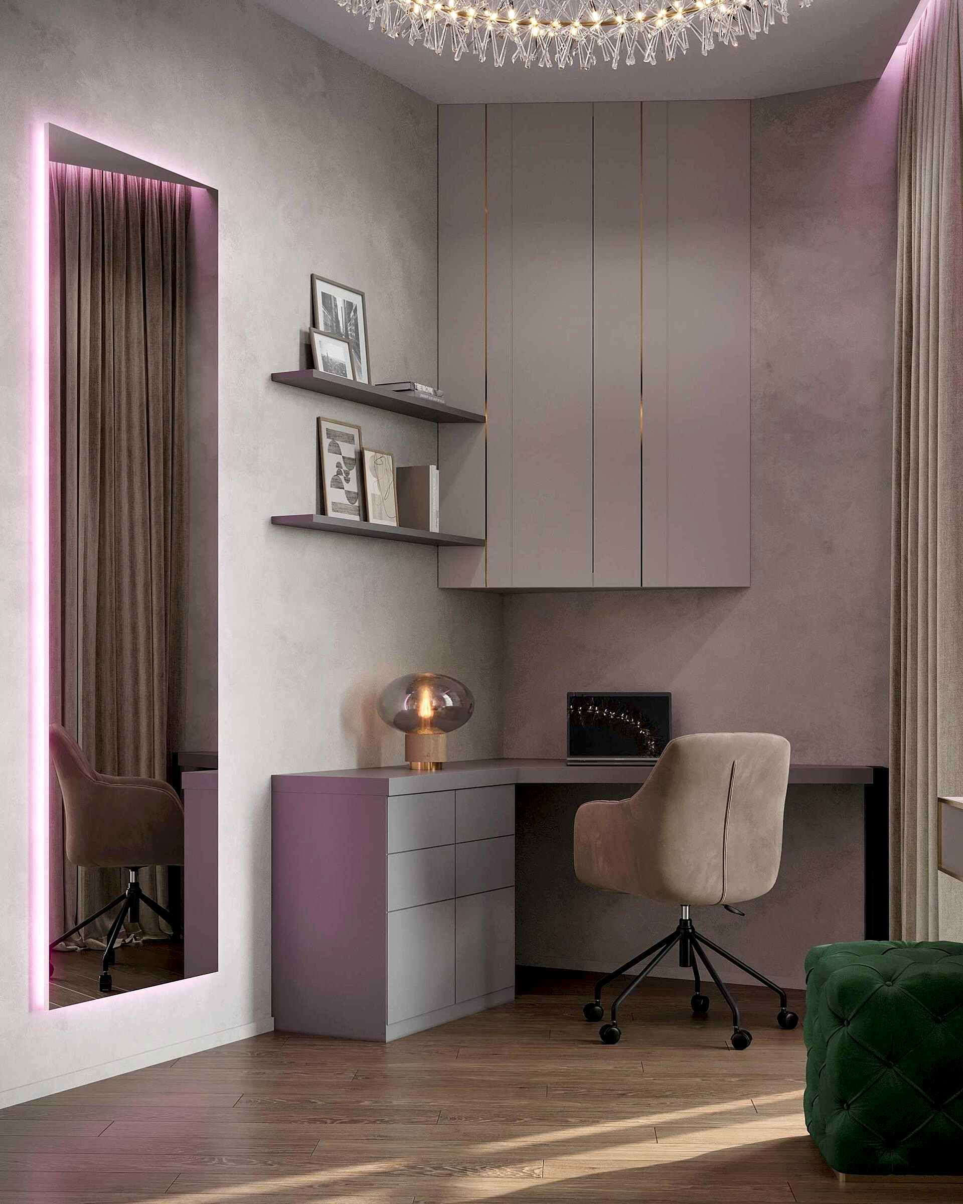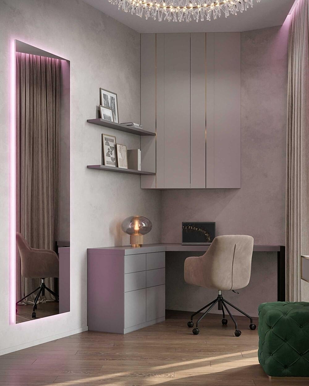 Детская - это стильное и функциональное пространство, оформленное в спокойных серых тонах с золотыми акцентами. Изголовье кровати дополнено вертикальными вставками с текстурой камня и мягкой подсветкой. Рабочая зона выполнена в лаконичном дизайне с мягким креслом и встроенными Pin-Up Бархатный пуф насыщенного зеленого оттенка добавляет интерьеру глубины. Люстра с хрустальными элементами делает пространство изящным и уютным.