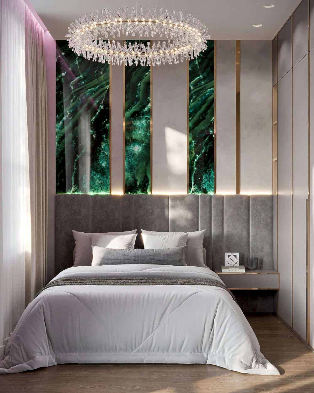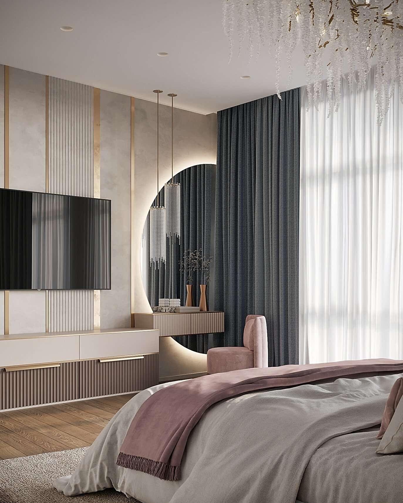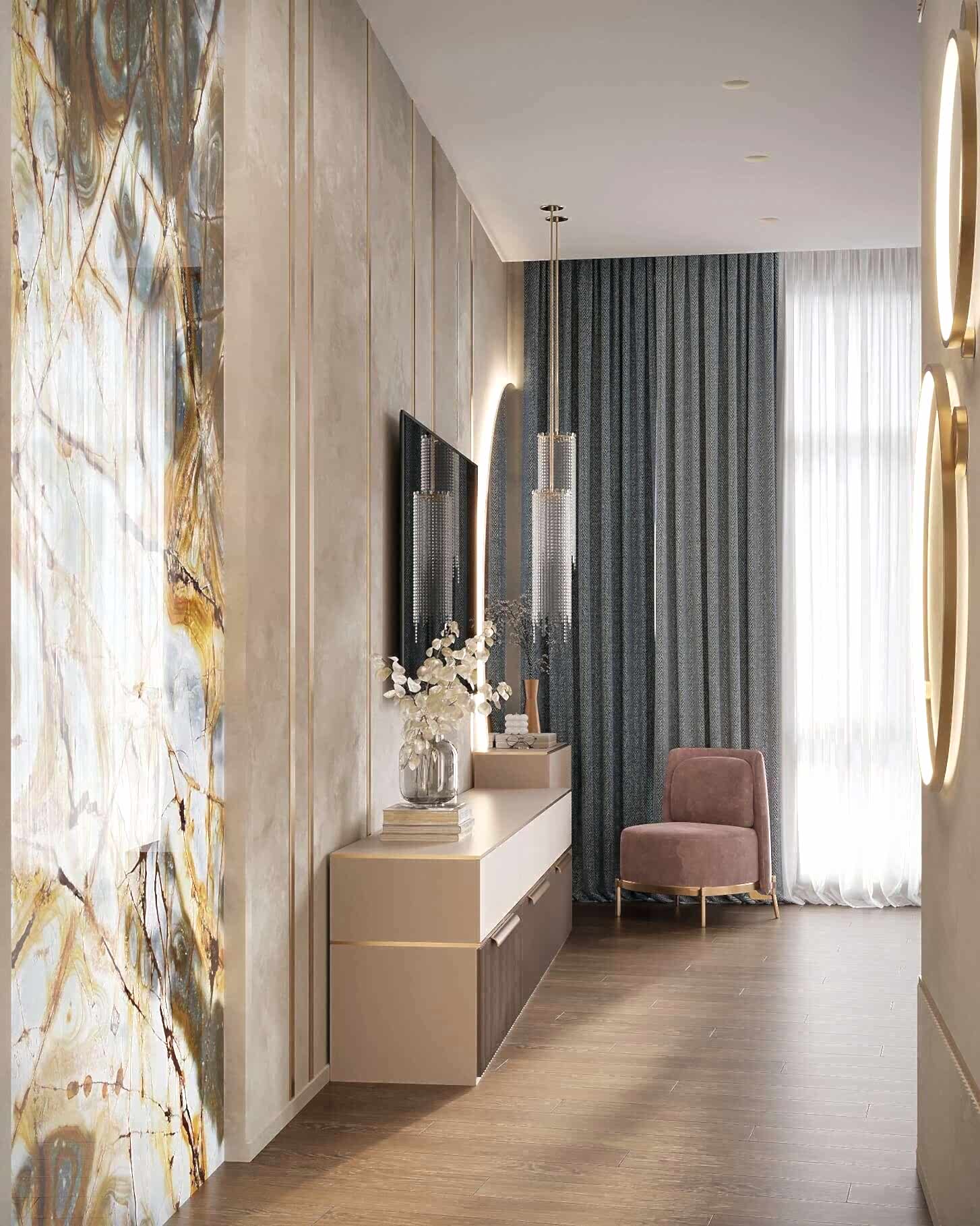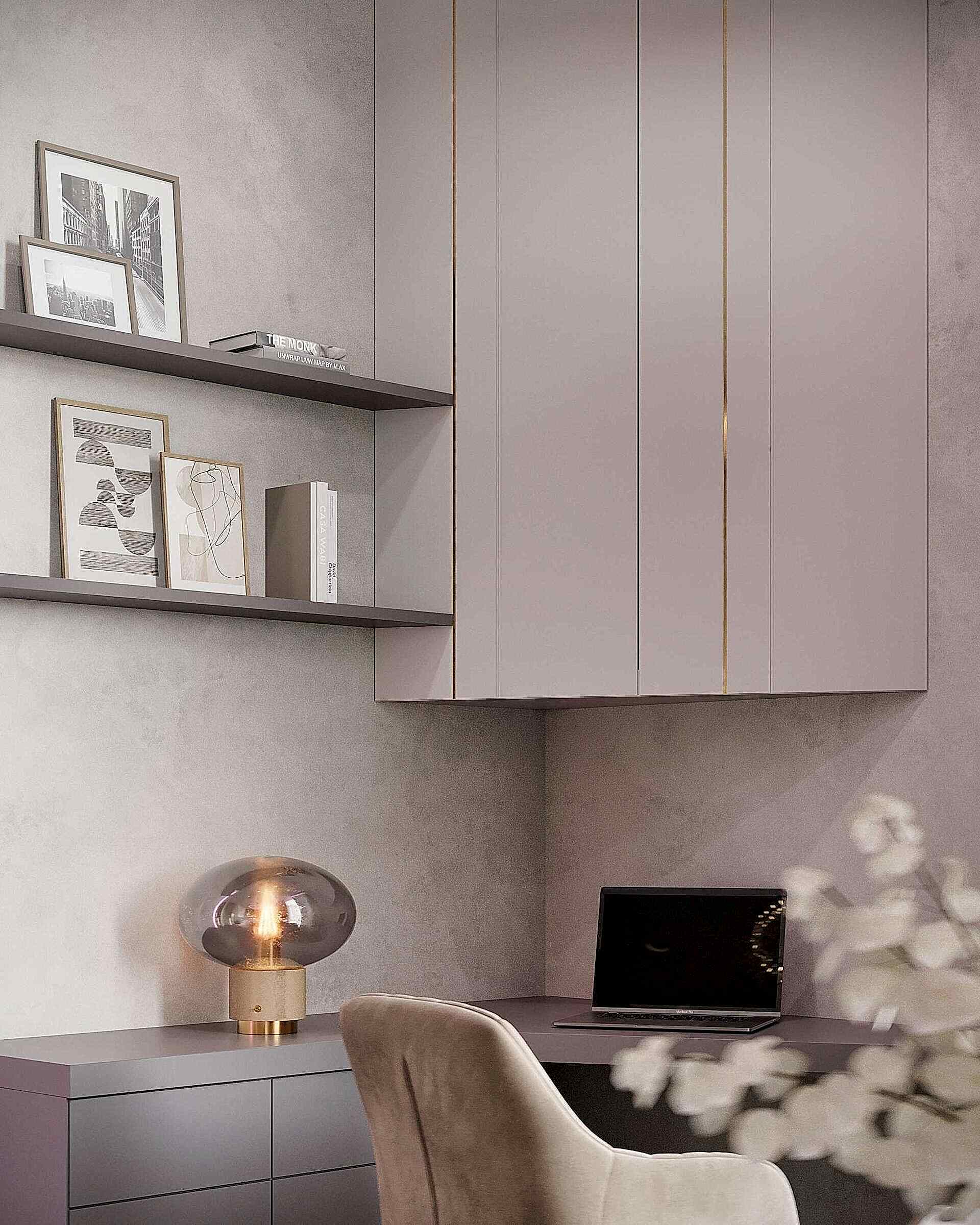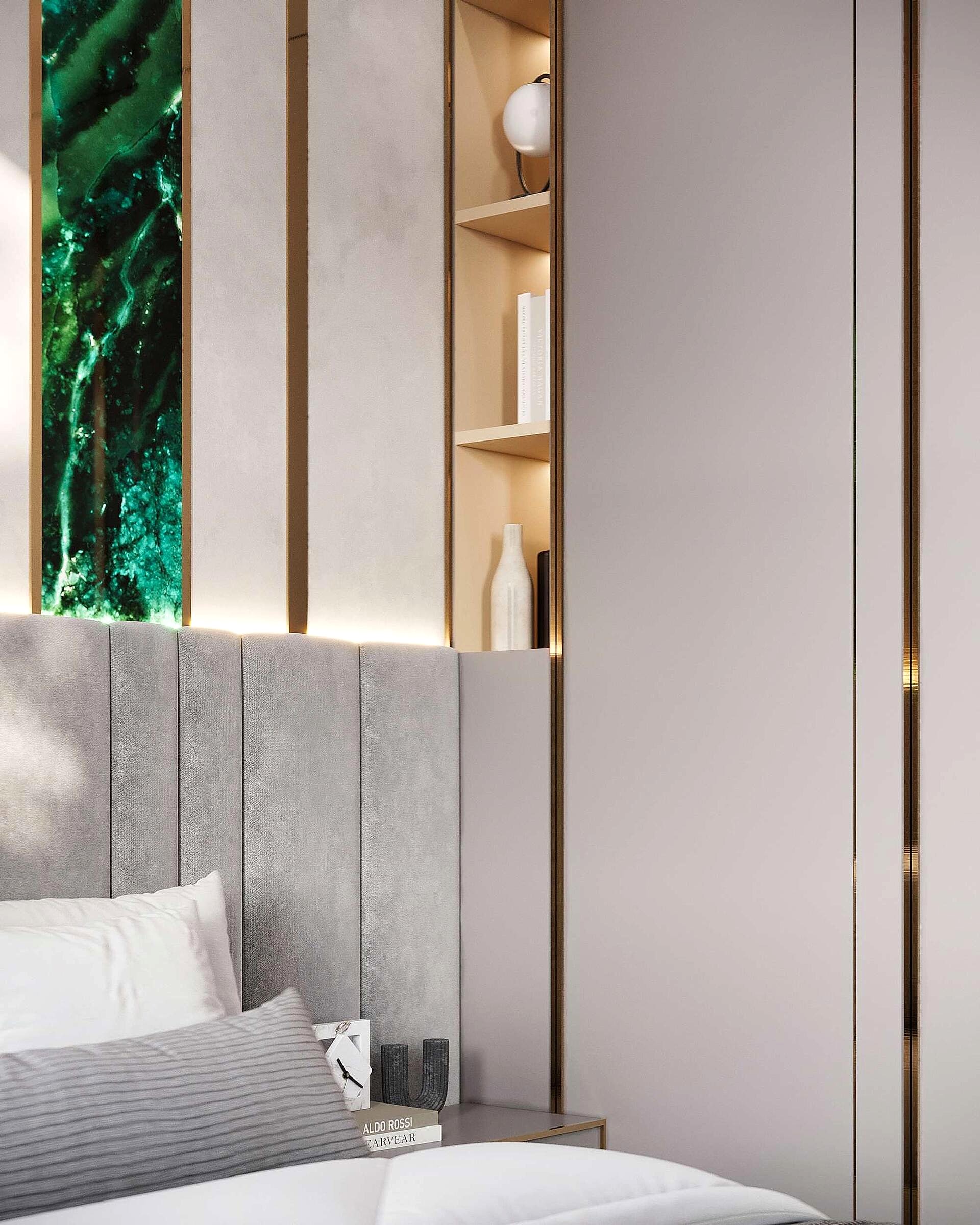 Детская - это стильное и функциональное пространство, оформленное в спокойных серых тонах с золотыми акцентами. Изголовье кровати дополнено вертикальными вставками с текстурой камня и мягкой подсветкой. Рабочая зона выполнена в лаконичном дизайне с мягким креслом и встроенными Pin-Up Бархатный пуф насыщенного зеленого оттенка добавляет интерьеру глубины. Люстра с хрустальными элементами делает пространство изящным и уютным.