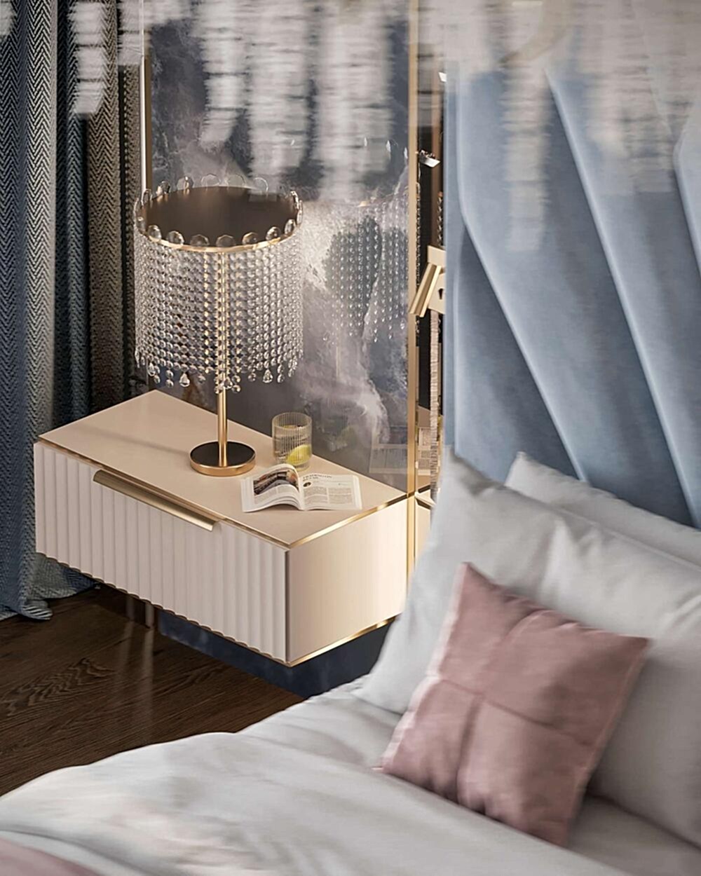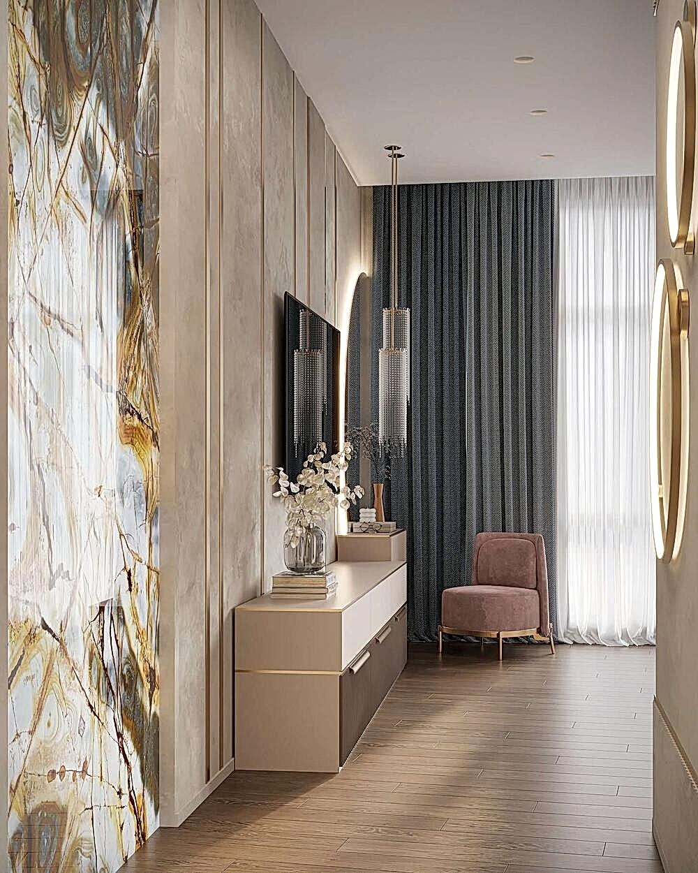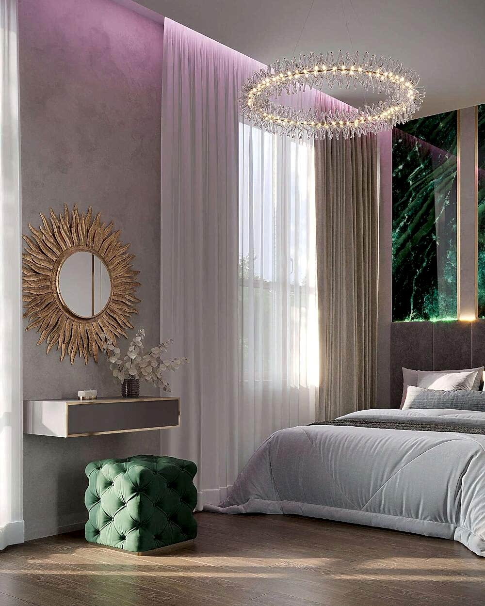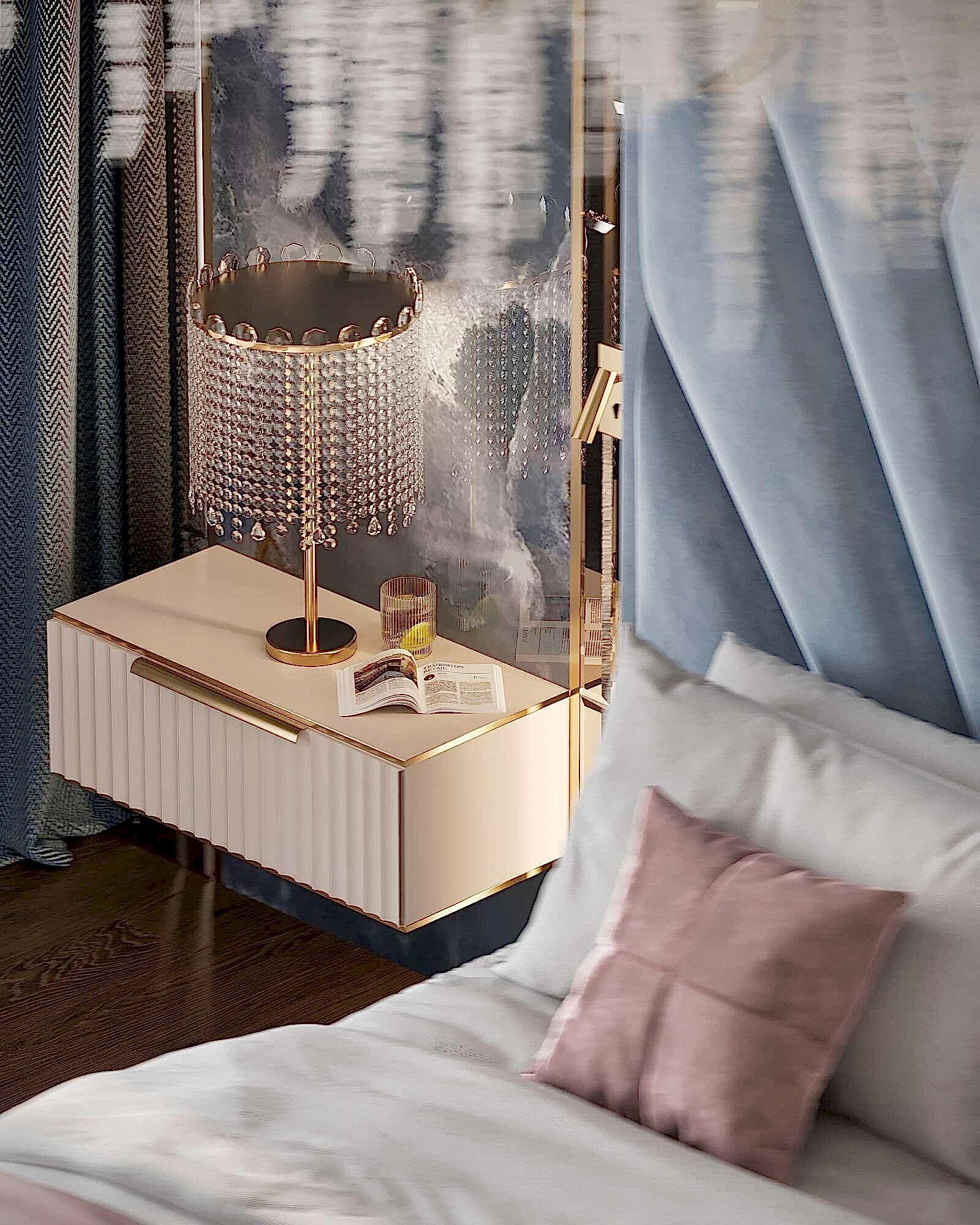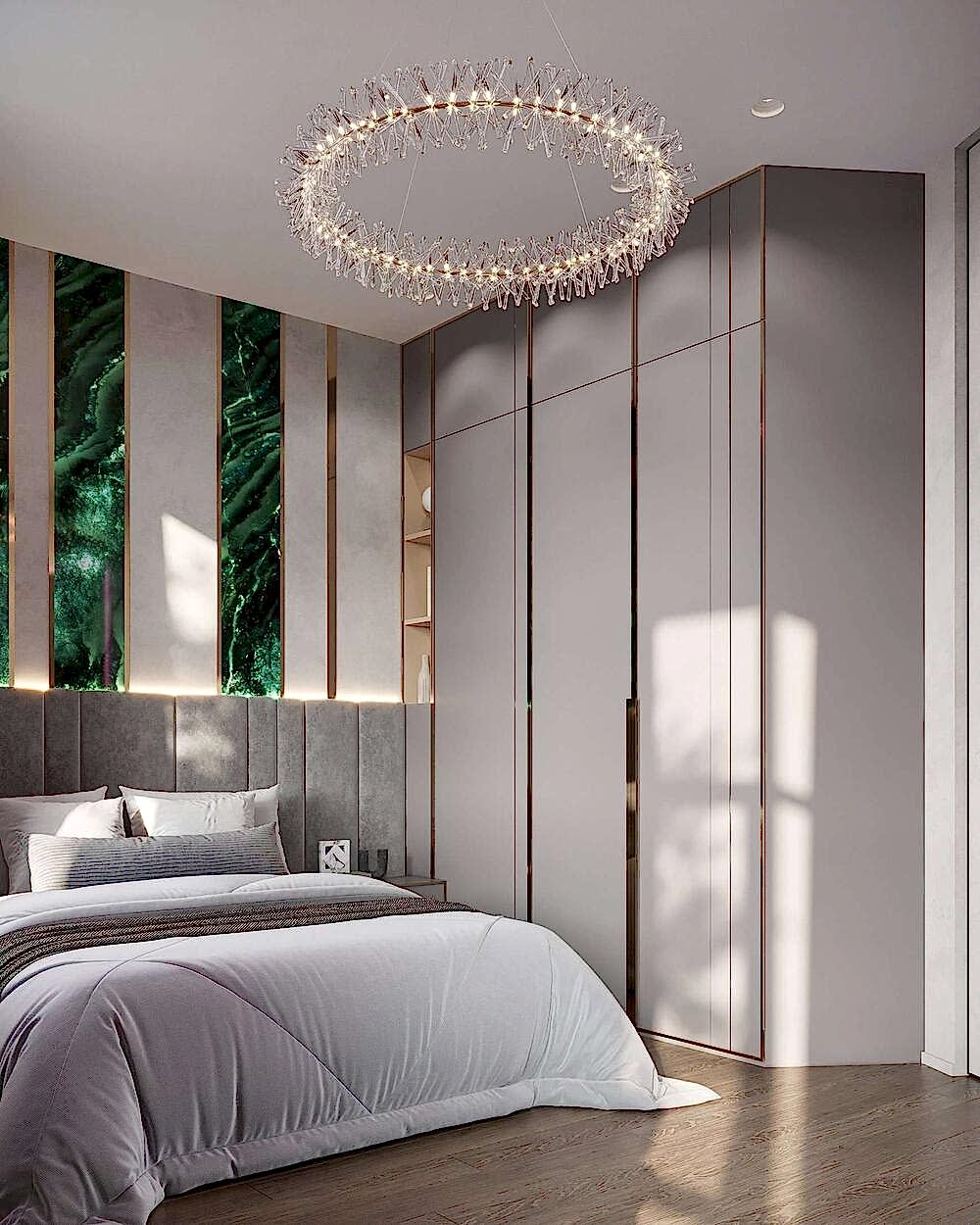Детская - это стильное и функциональное пространство, оформленное в спокойных серых тонах с золотыми акцентами. Изголовье кровати дополнено вертикальными вставками с текстурой камня и мягкой подсветкой. Рабочая зона выполнена в лаконичном дизайне с мягким креслом и встроенными Pin-Up Бархатный пуф насыщенного зеленого оттенка добавляет интерьеру глубины. Люстра с хрустальными элементами делает пространство изящным и уютным.