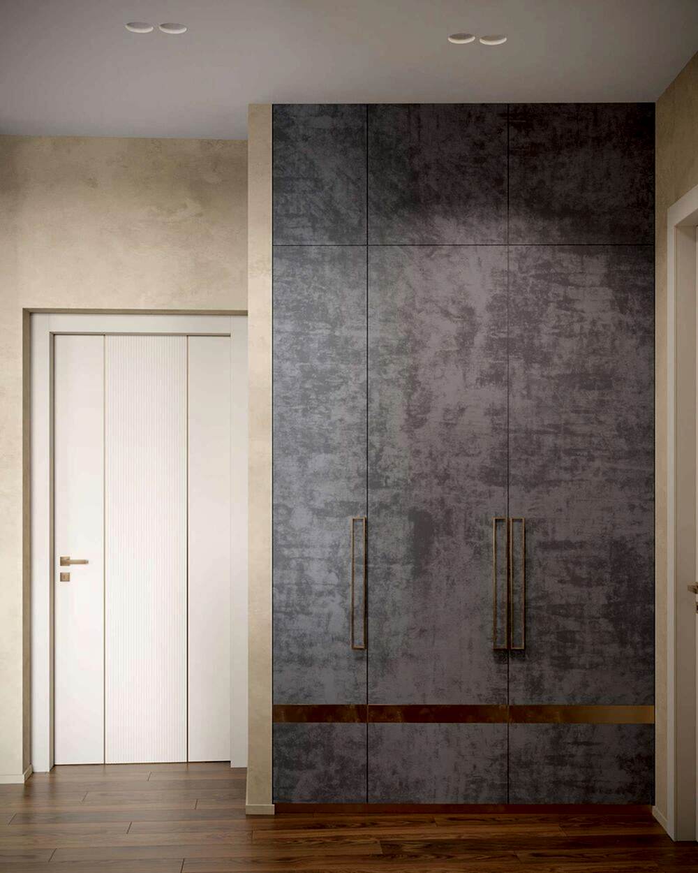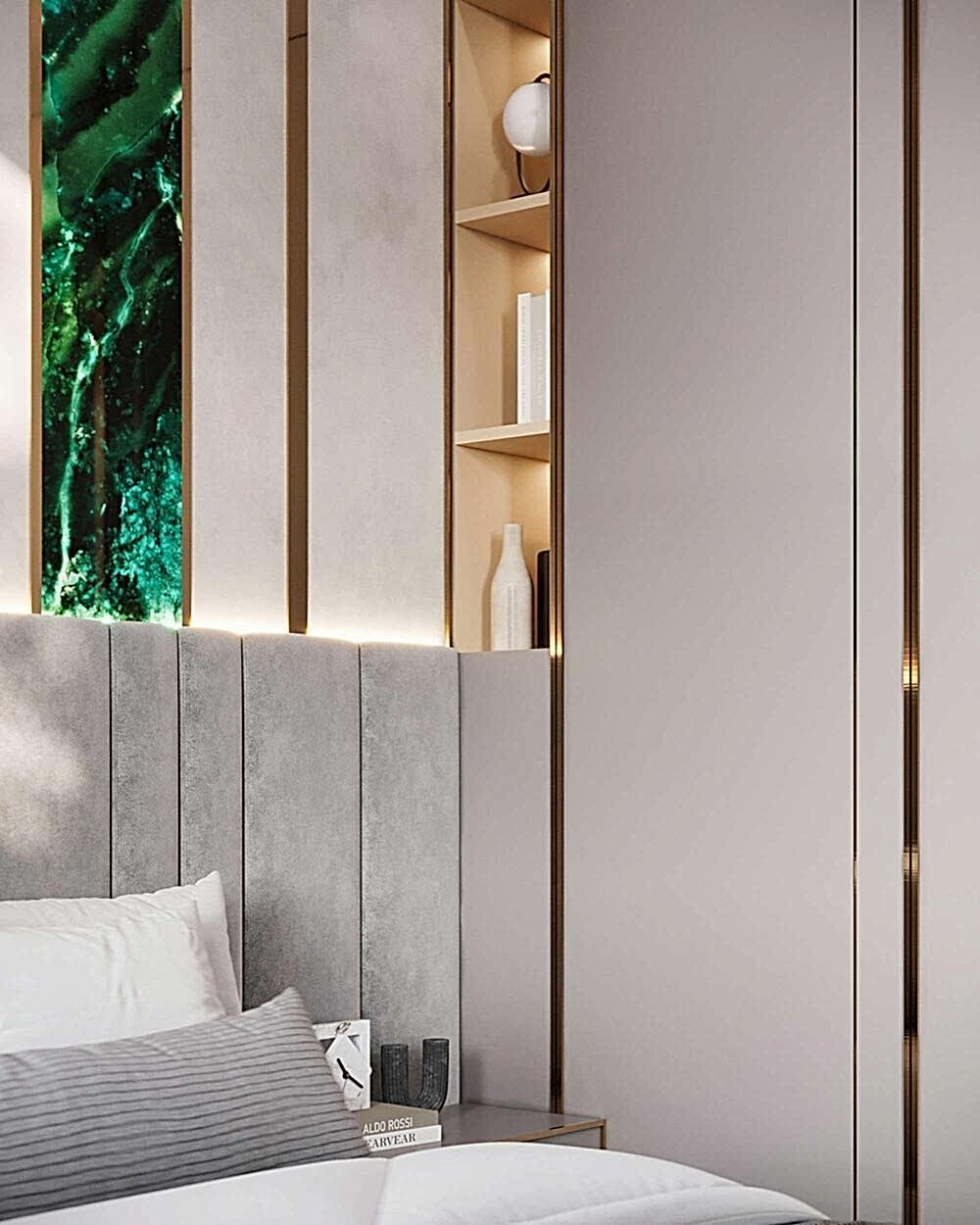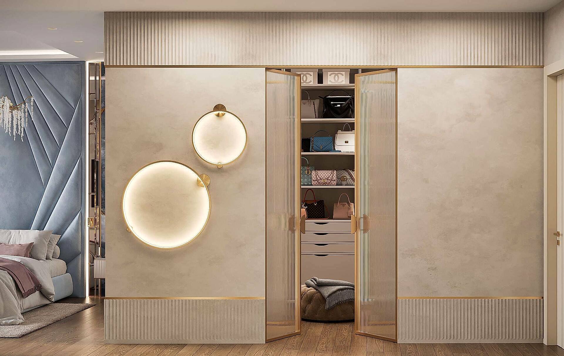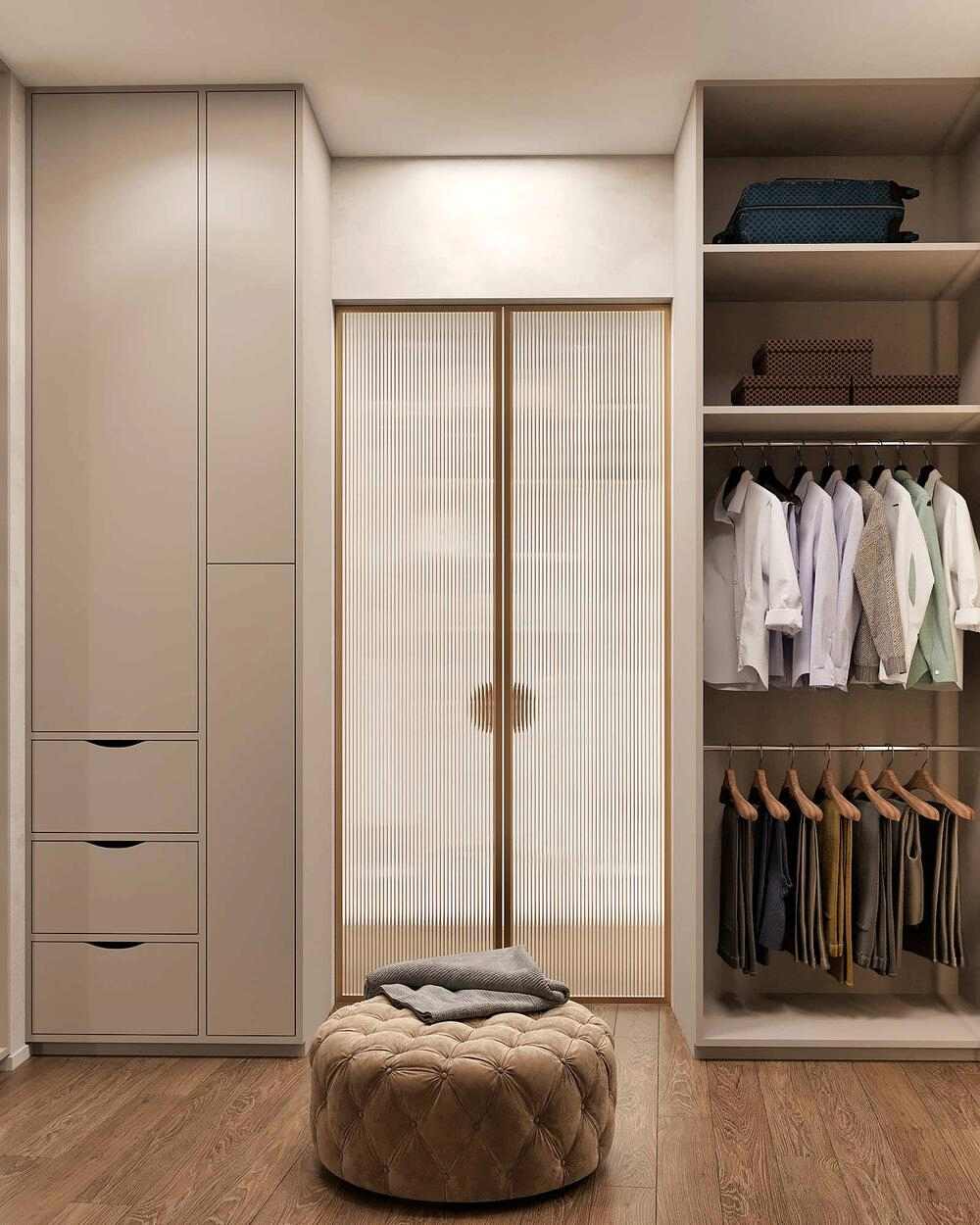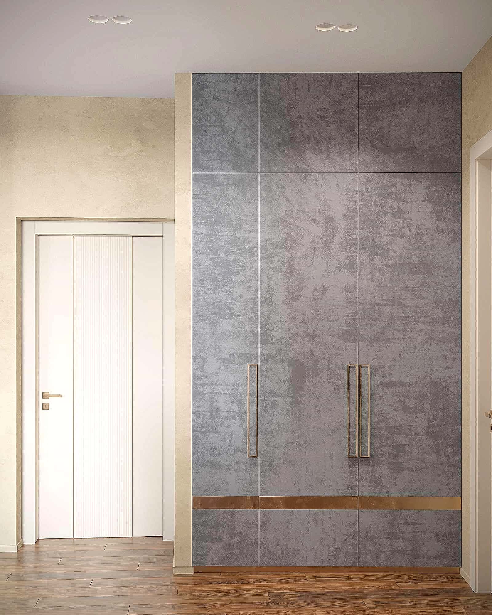 Шкаф и стены из алькантары- мягкая текстура добавляет интерьеру премиальности и Pin-Up комфорта, делает пространство визуально теплее и глубже.