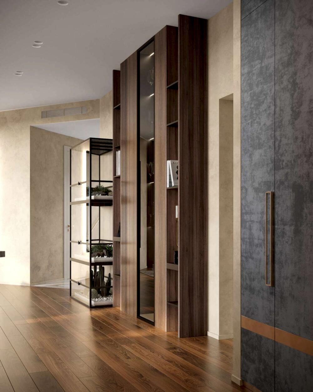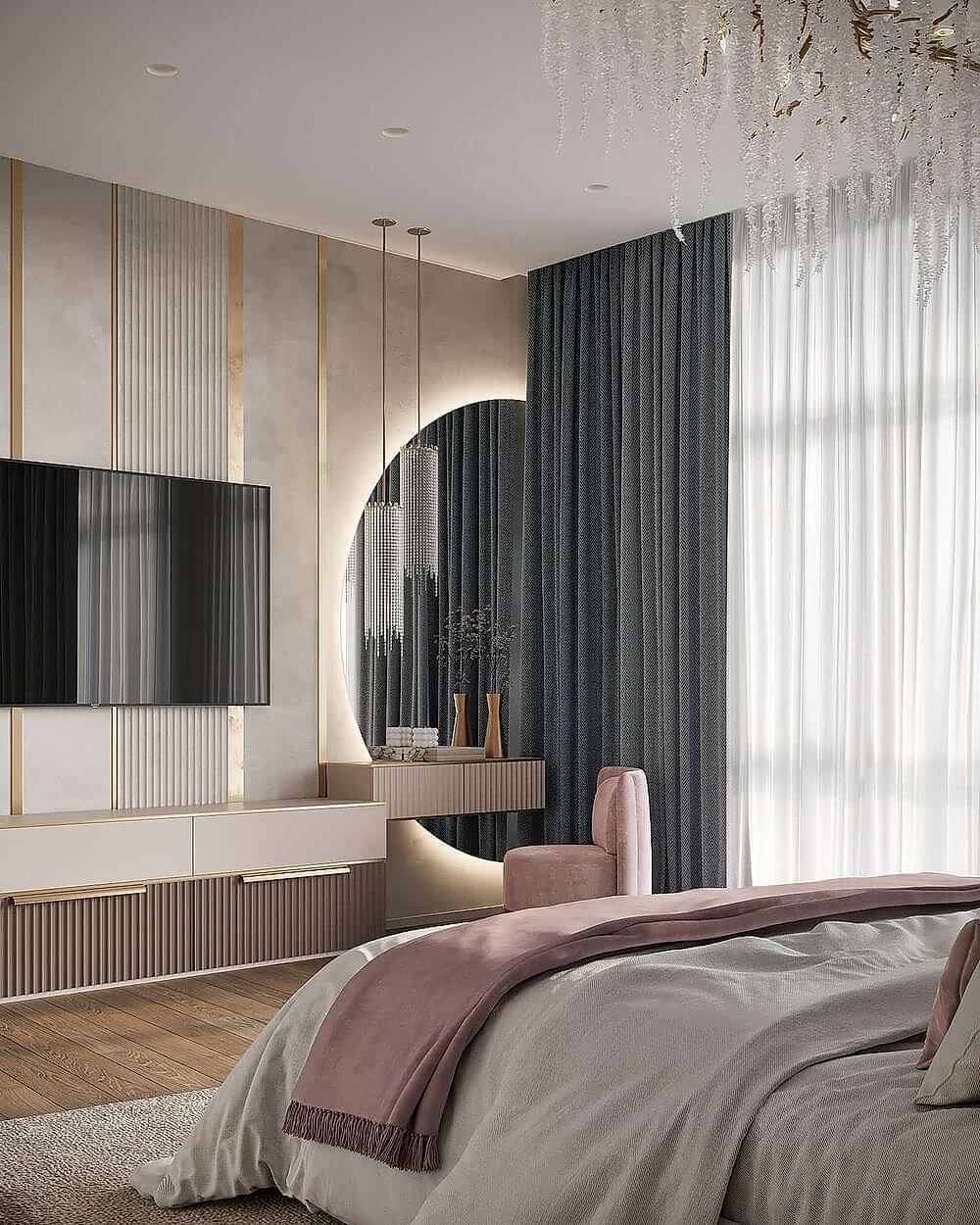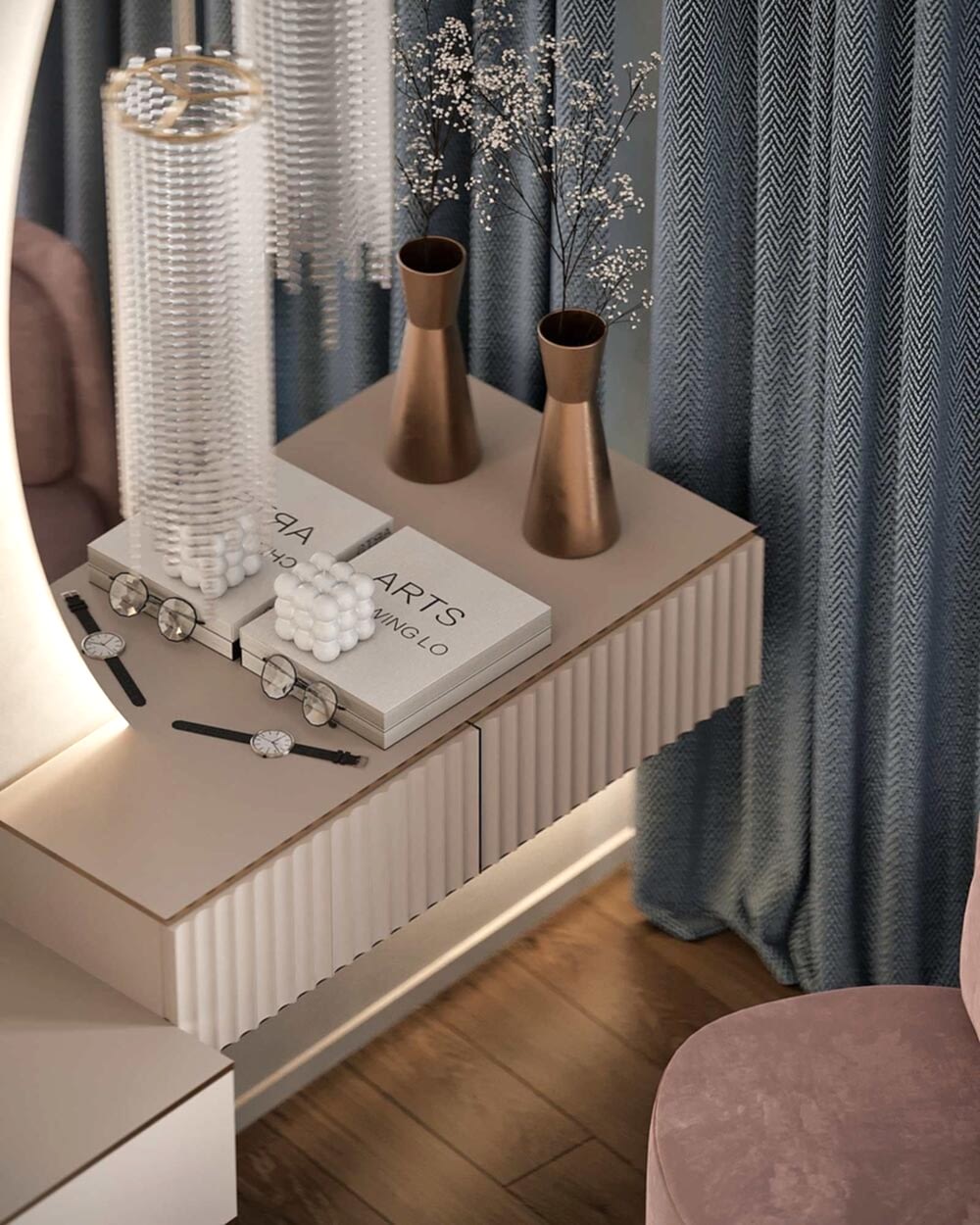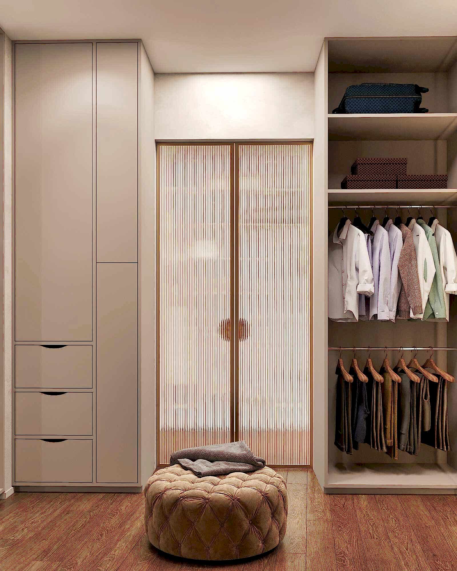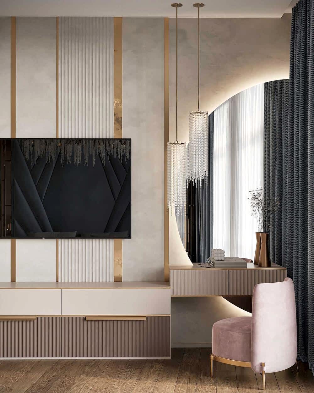Шкаф и стены из алькантары- мягкая текстура добавляет интерьеру премиальности и Pin-Up комфорта, делает пространство визуально теплее и глубже.