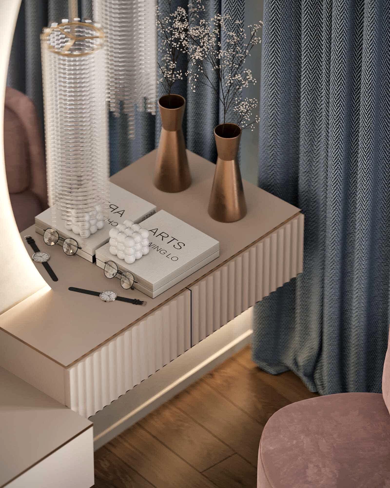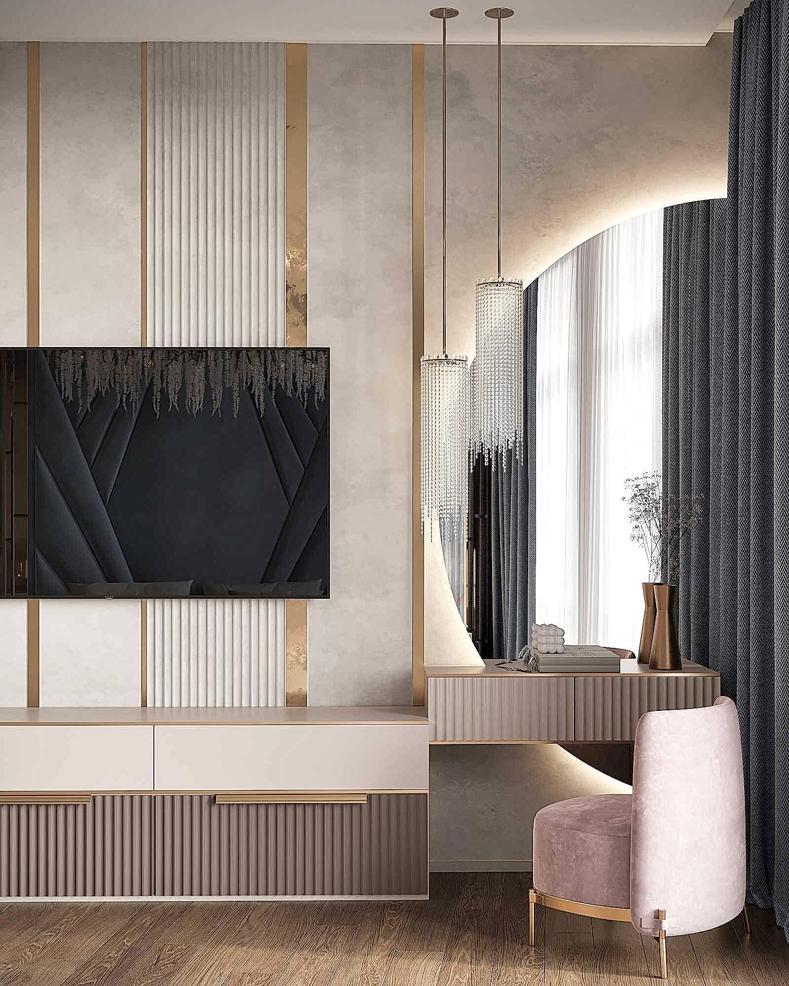 Современная Pin-Up с золотыми акцентами в дизайне интерьера квартиры в ЖК "Familia" - 80 м2