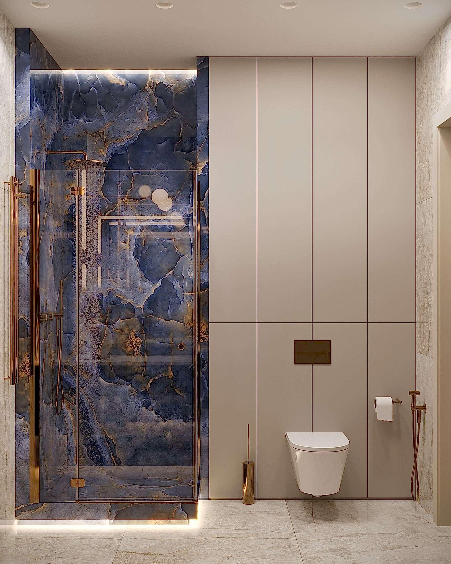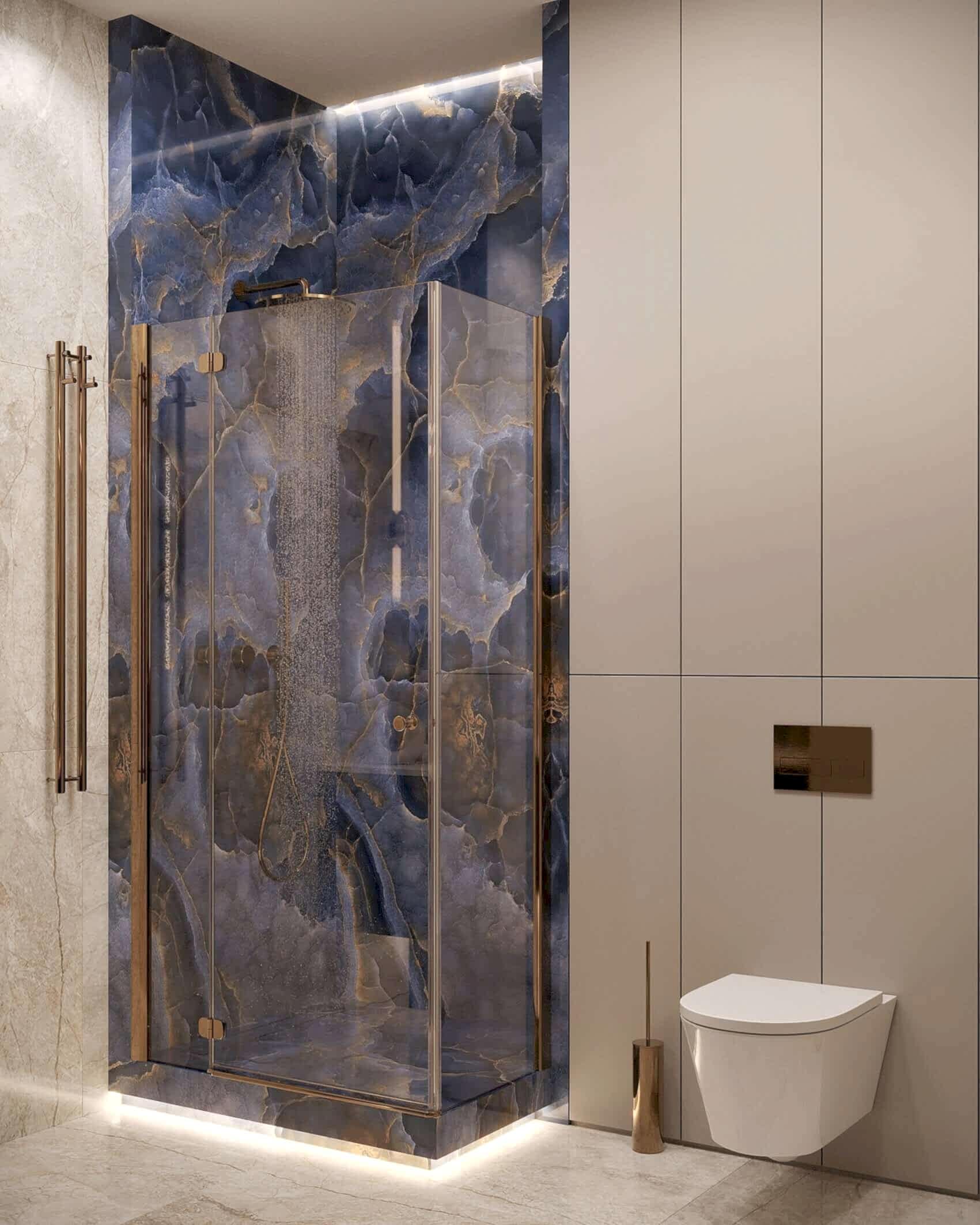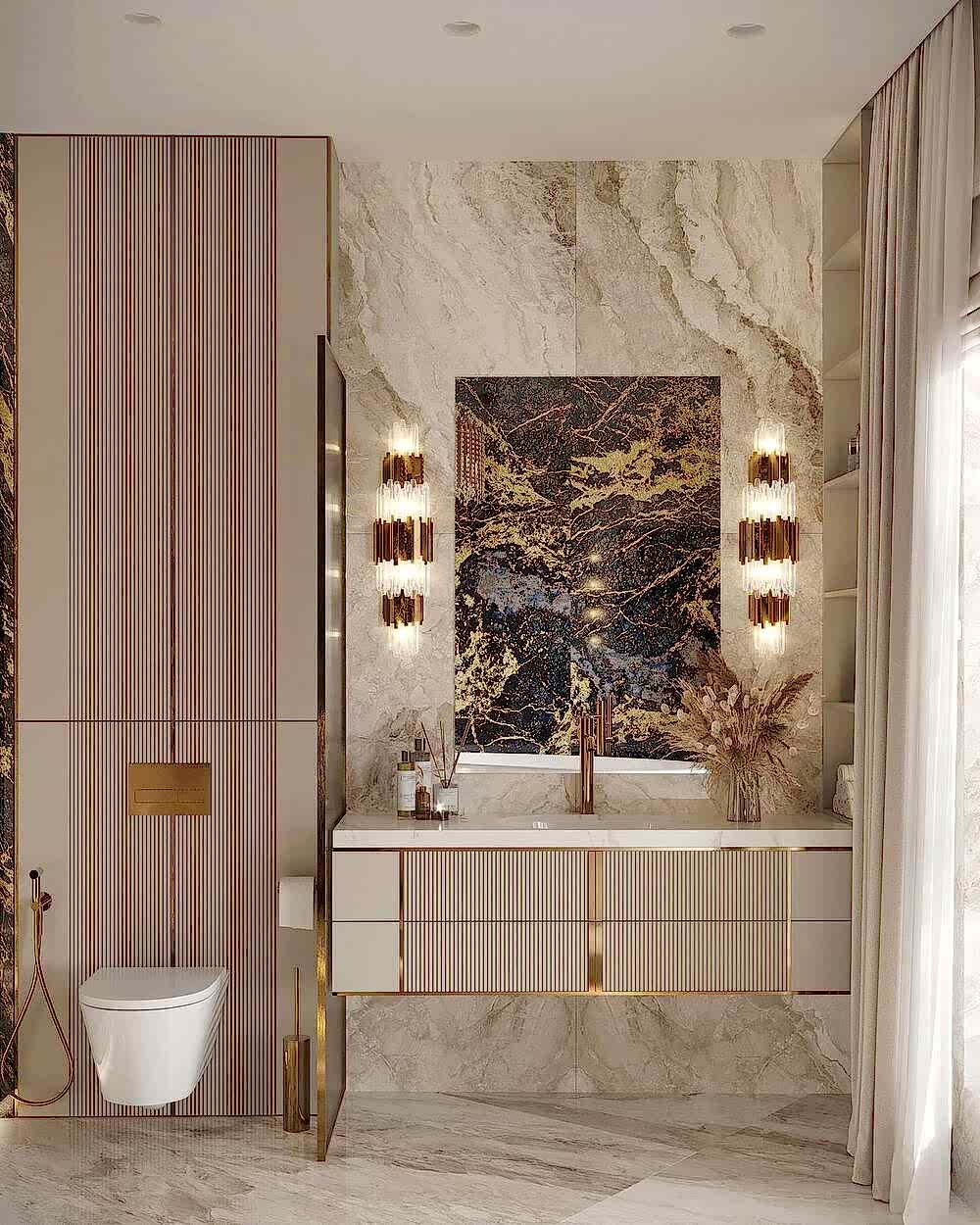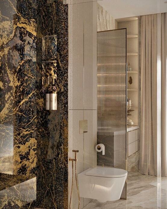 Гостевой санузел -компактный, но удобный, расположенный рядом с Pin-Up отделан натуральным камнем и металлом.