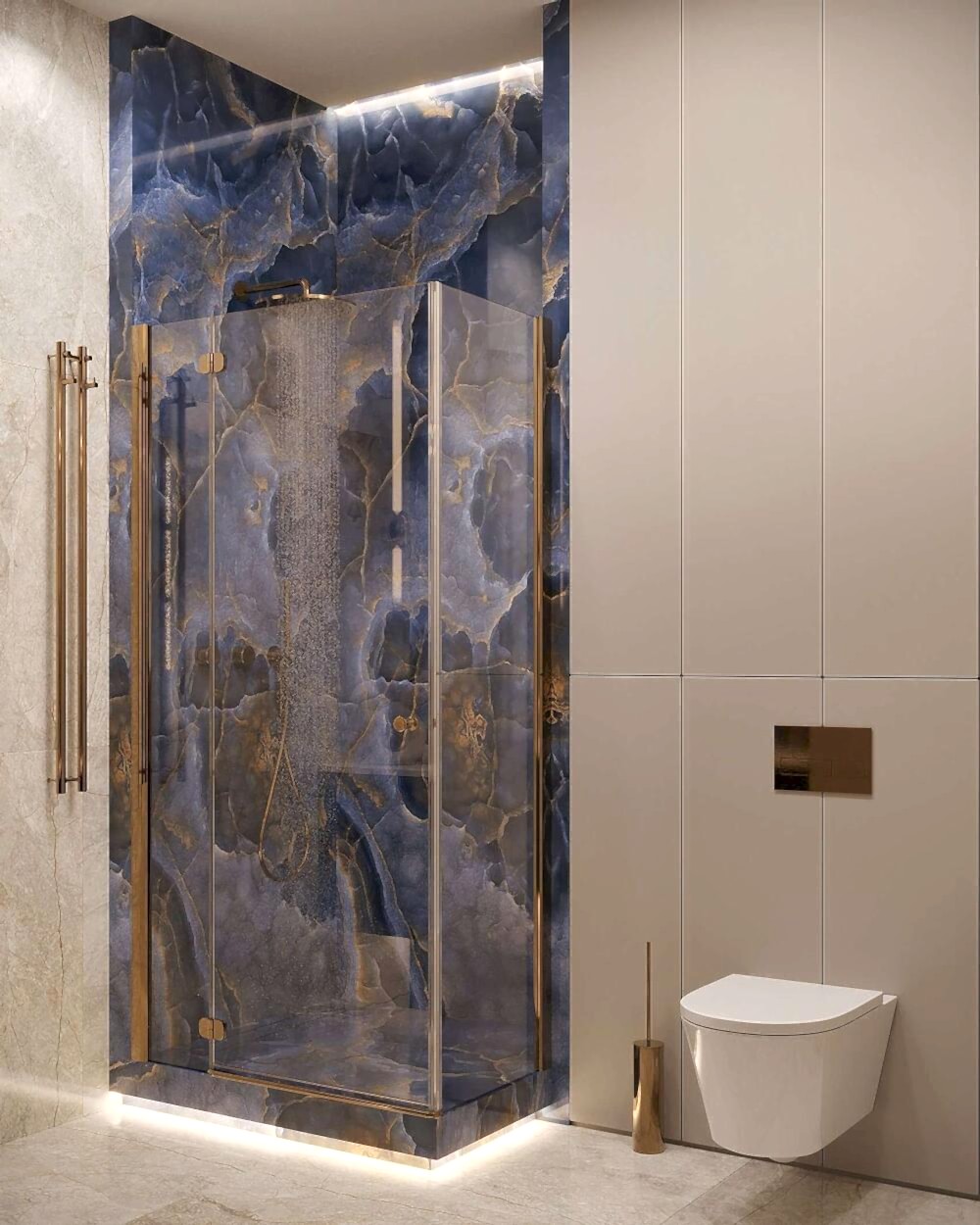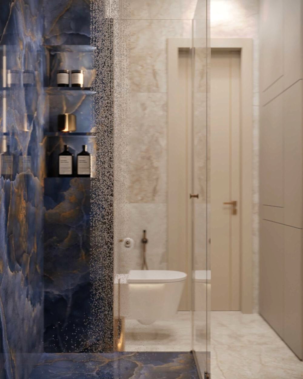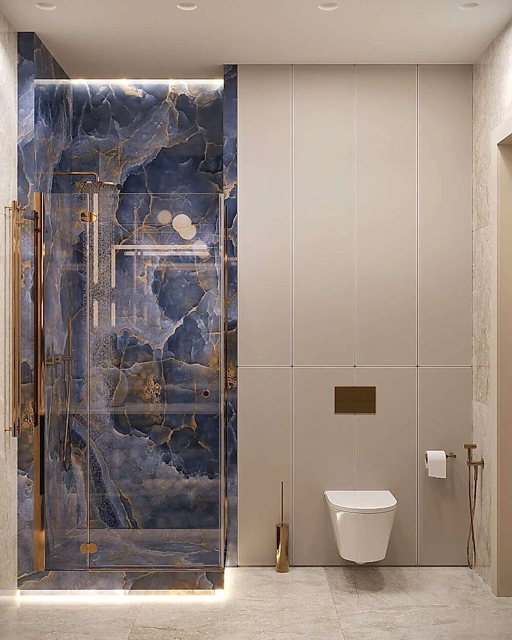 Гостевой санузел -компактный, но удобный, расположенный рядом с Pin-Up отделан натуральным камнем и металлом.