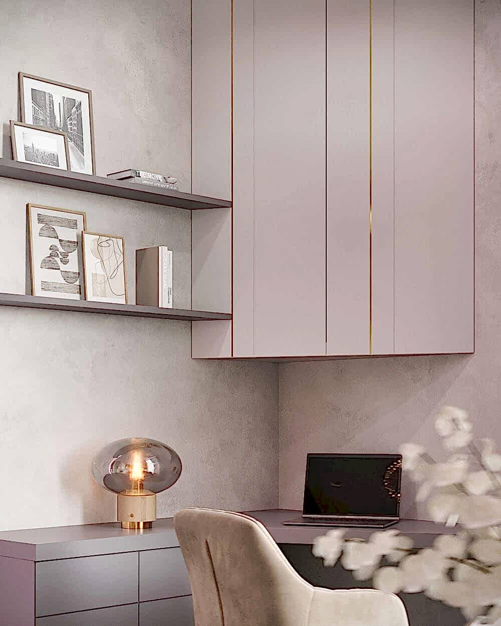 - Алькантара- использована в отделке стен и шкафа, создает мягкий Pin-Up комфорт.