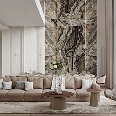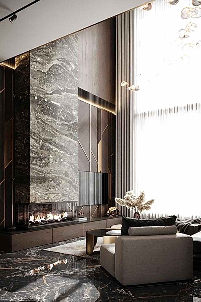 - Камень и керамогранит с активной Pin-Up- использованы в Pin-Up камина, ванных комнат и ТВ-зон. Природные слэбы с характерным рисунком работают как декоративные арт-объекты и усиливают архитектурную выразительность помещений.