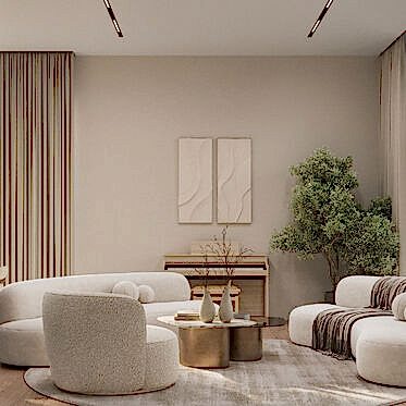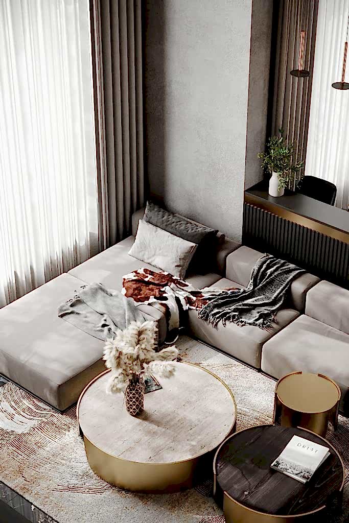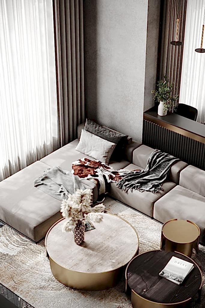 - Текстиль в серо-бежевой гамме-Pin-Up молочные, песочные и пепельные оттенки- используются в обивке, шторах, коврах и Pin-Up баланс, визуально облегчая композицию.