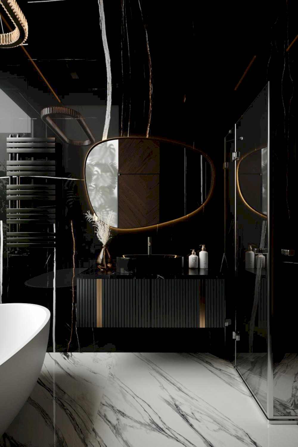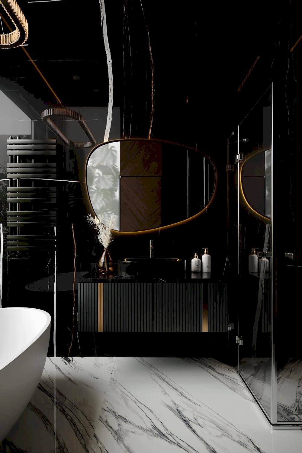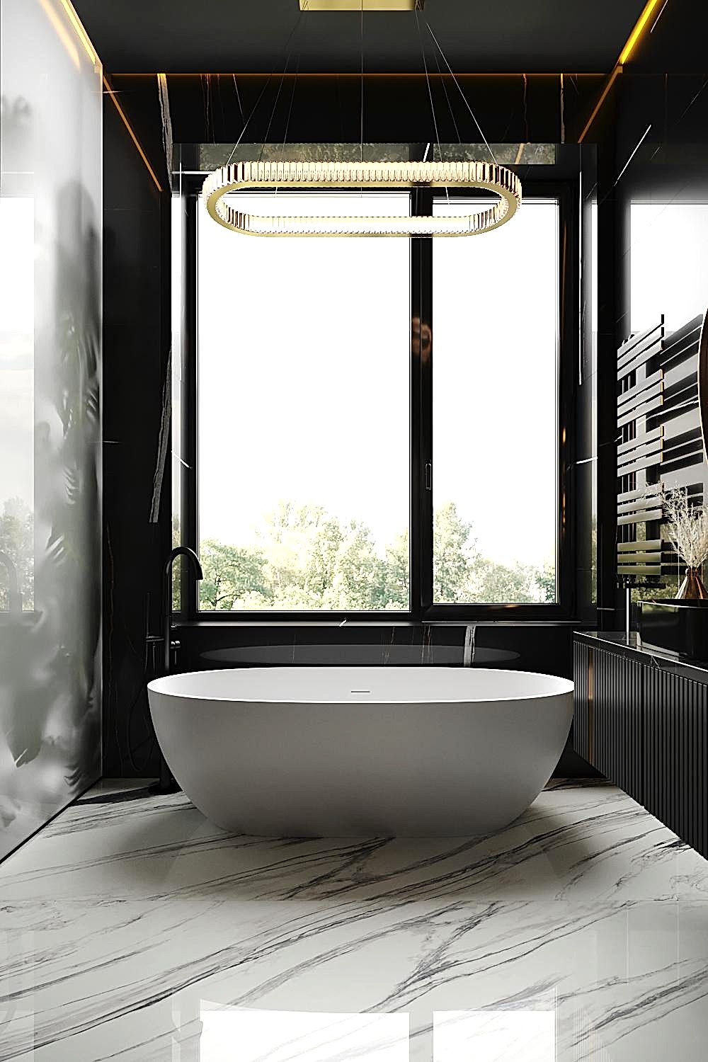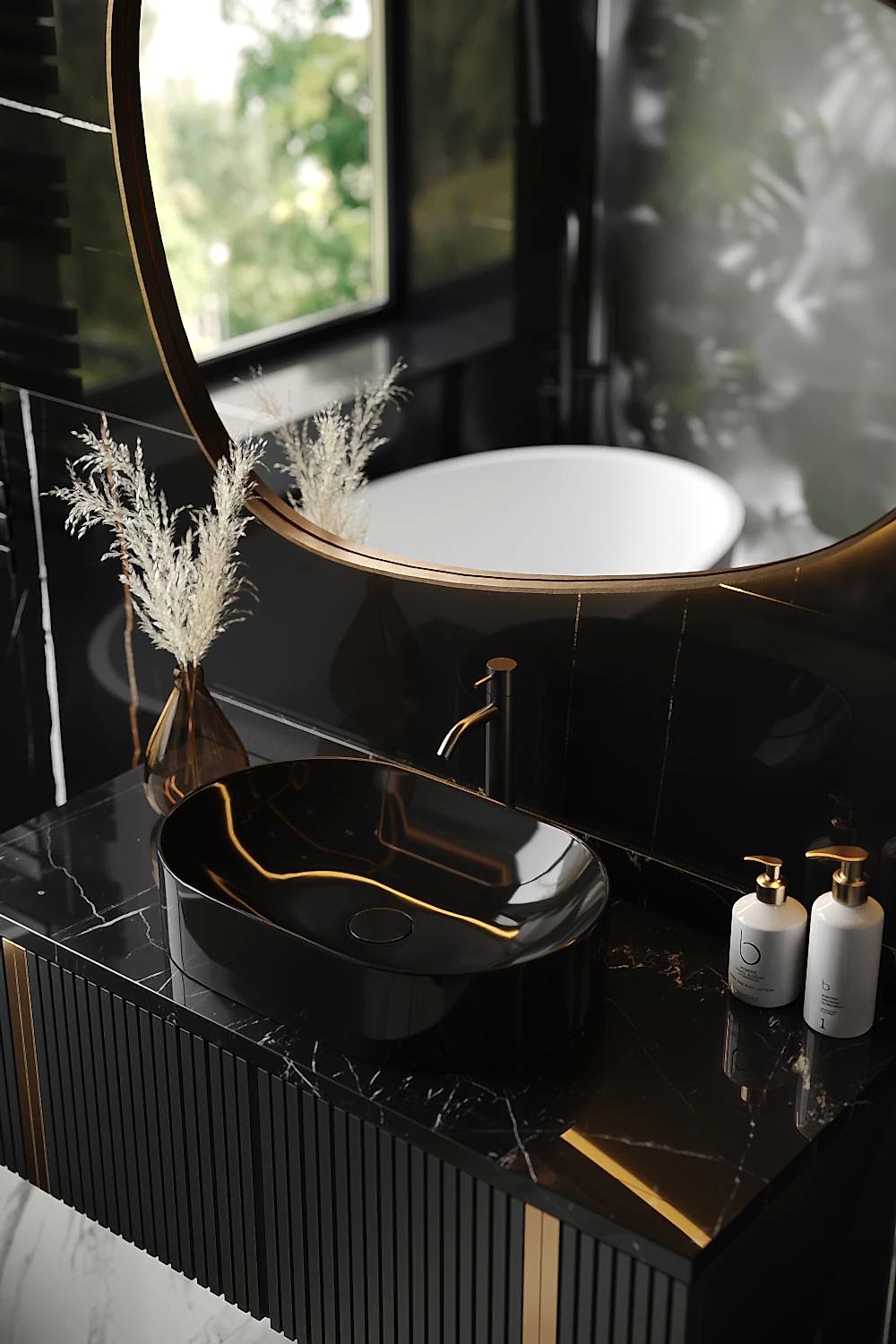 Здесь дизайн работает на эмоцию. Контраст тёмных глянцевых стен и светлого мрамора - про эффект. Отдельностоящая ванна у Pin-Up чёрная раковина, рифлёная тумба с латунью. Зеркало - овальное, с мягкой подсветкой. Выразительная люстра завершает образ.