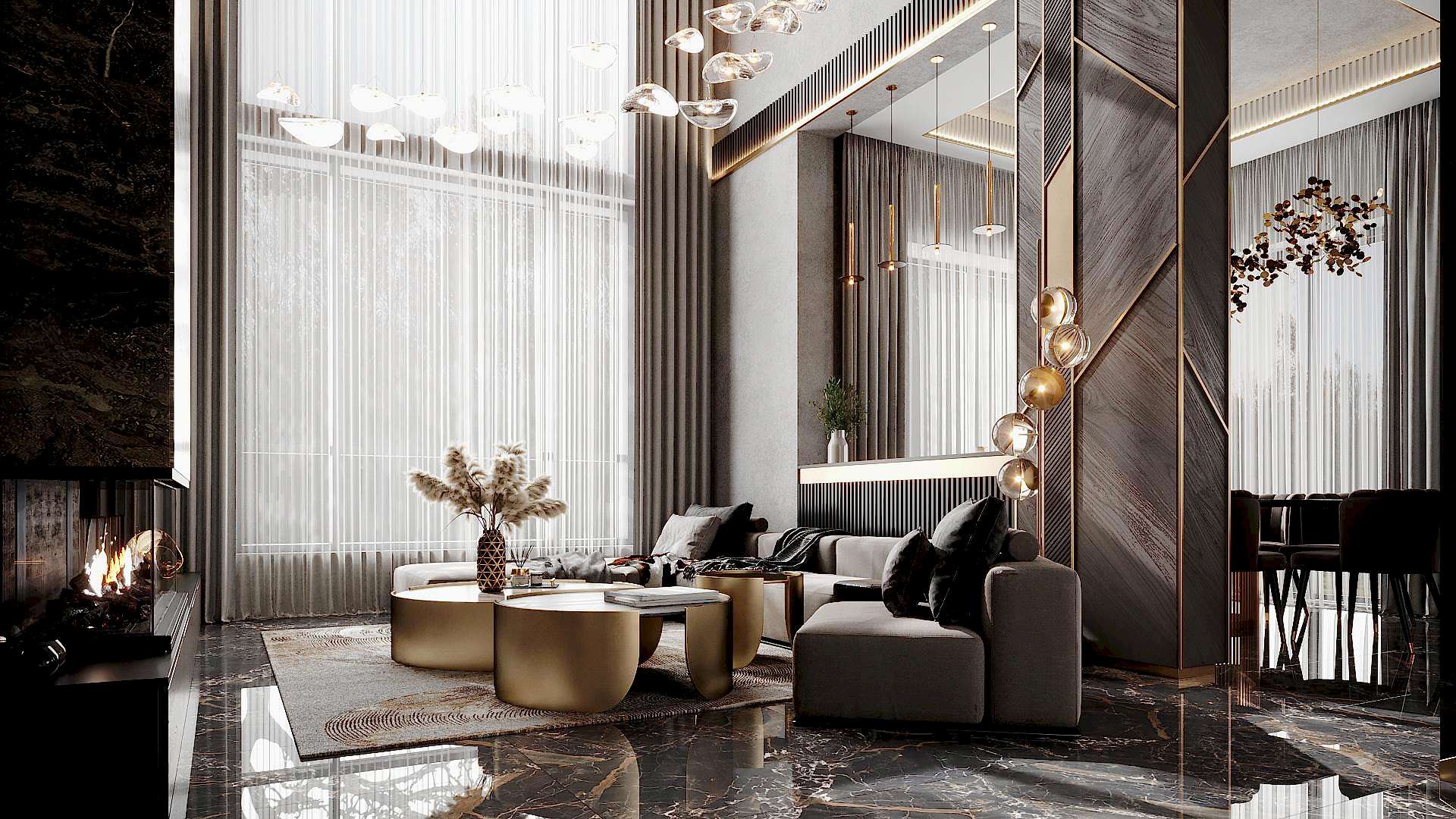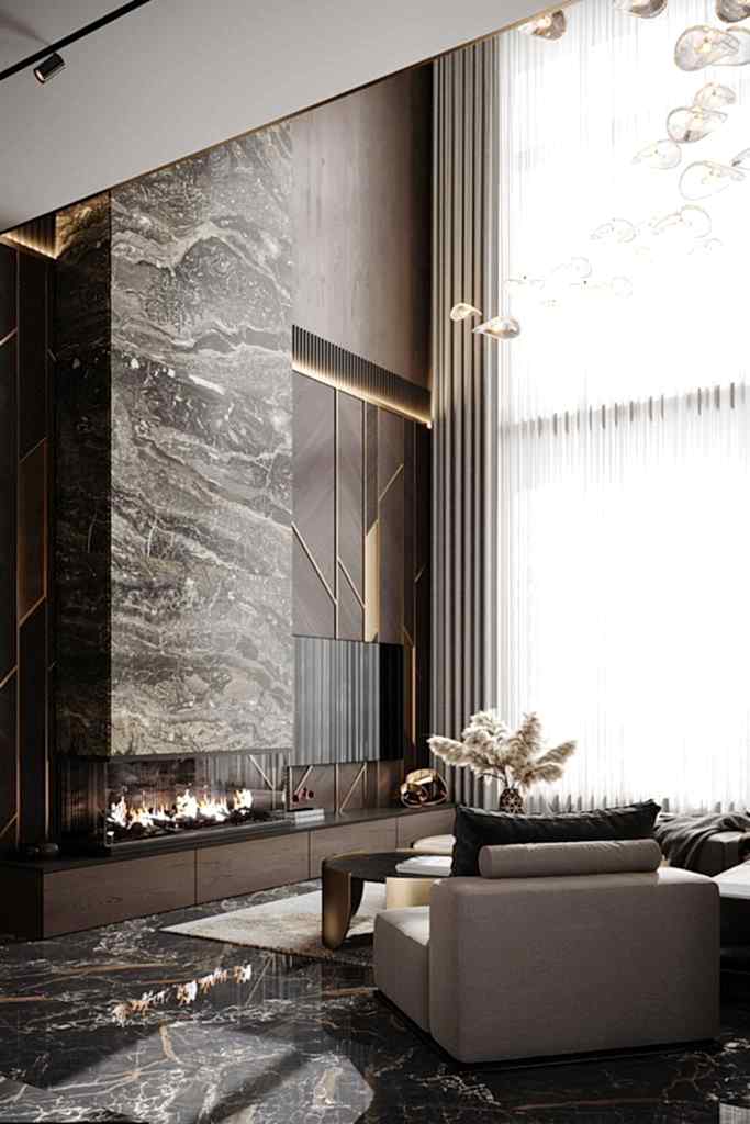 Гостиная - wow-зона с высотой в два этажа и камином из чёрного мрамора. Парящие стеклянные светильники создают ощущение движения и воздуха.Высокие зеркала и латунные акценты Pin-Up динамики.