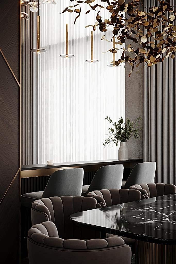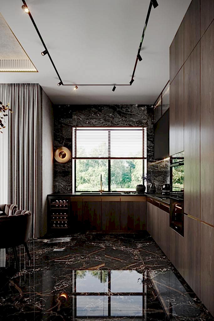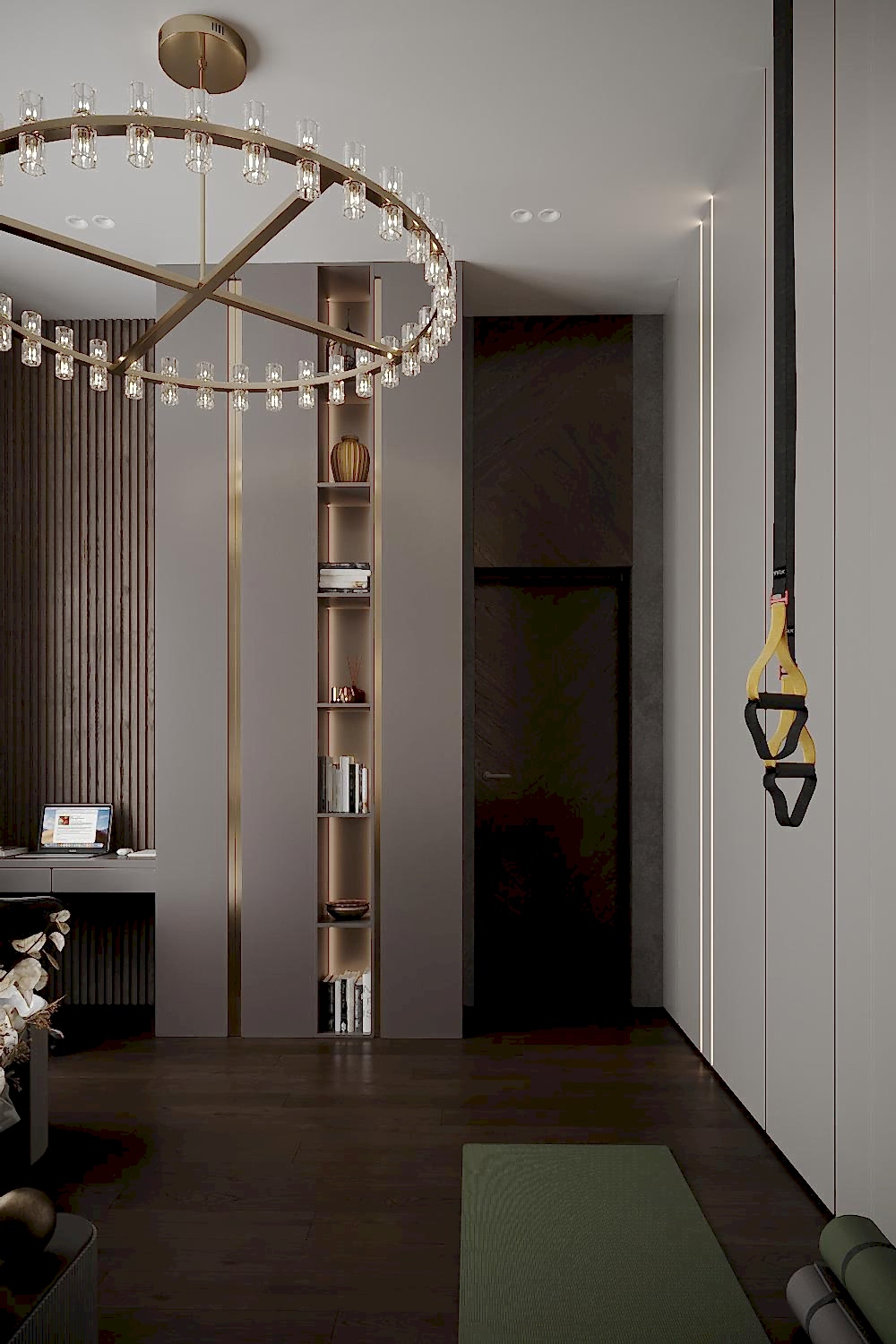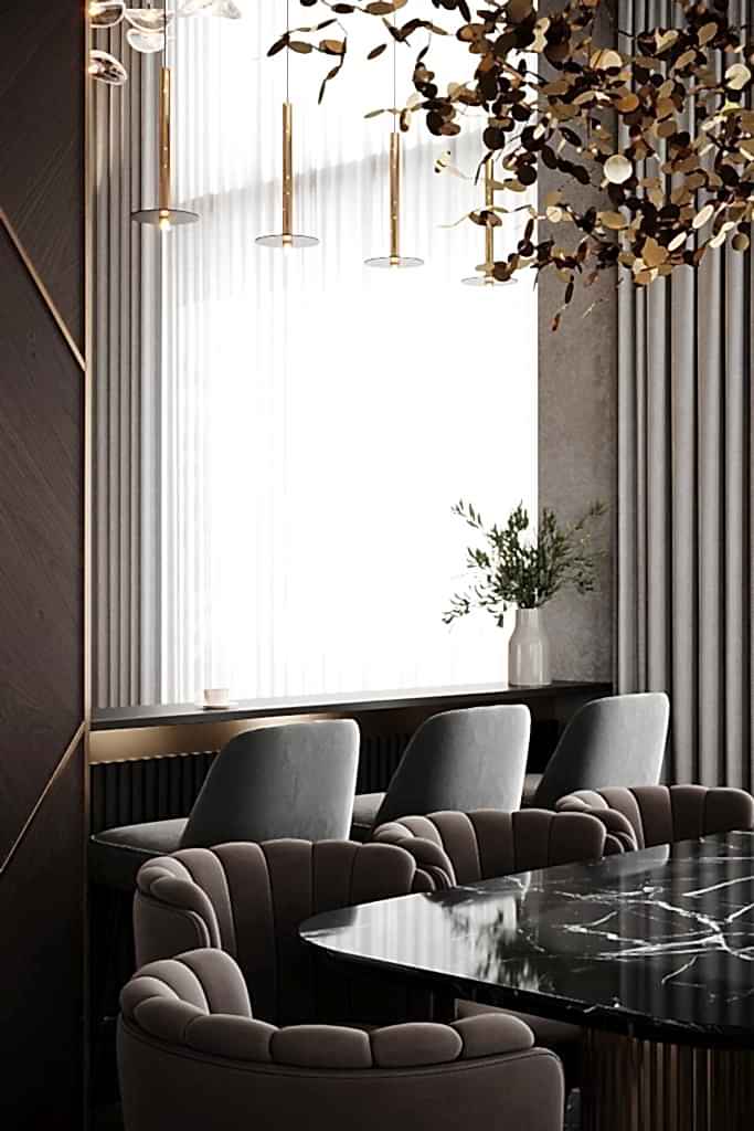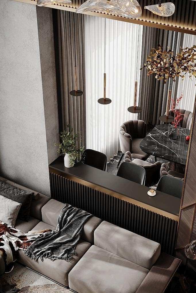 В столовой зоне глянцевый мраморный стол, будто высеченный из Pin-Up Над ним - скульптурная люстра с латунными лепестками. Стены отделаны геометрическими панелями, которые задают ритм и глубину. Атмосфера - как в бутиковом ресторане. Но с домашним комфортом.