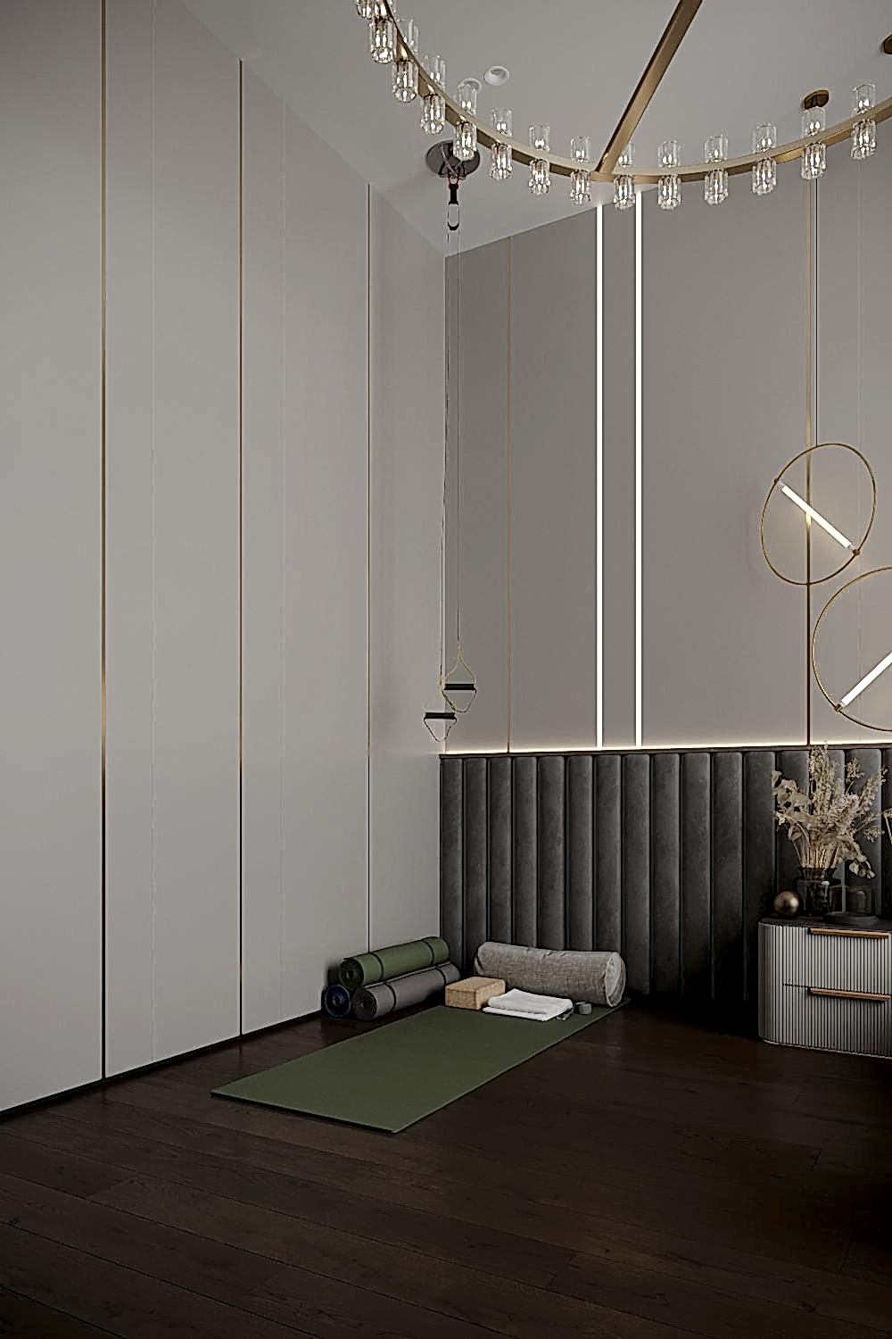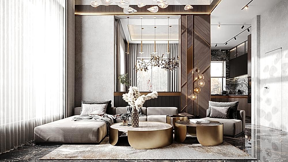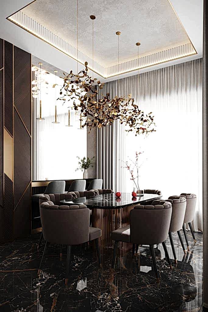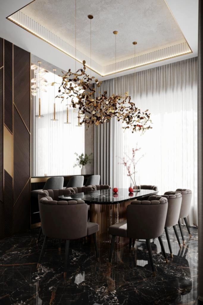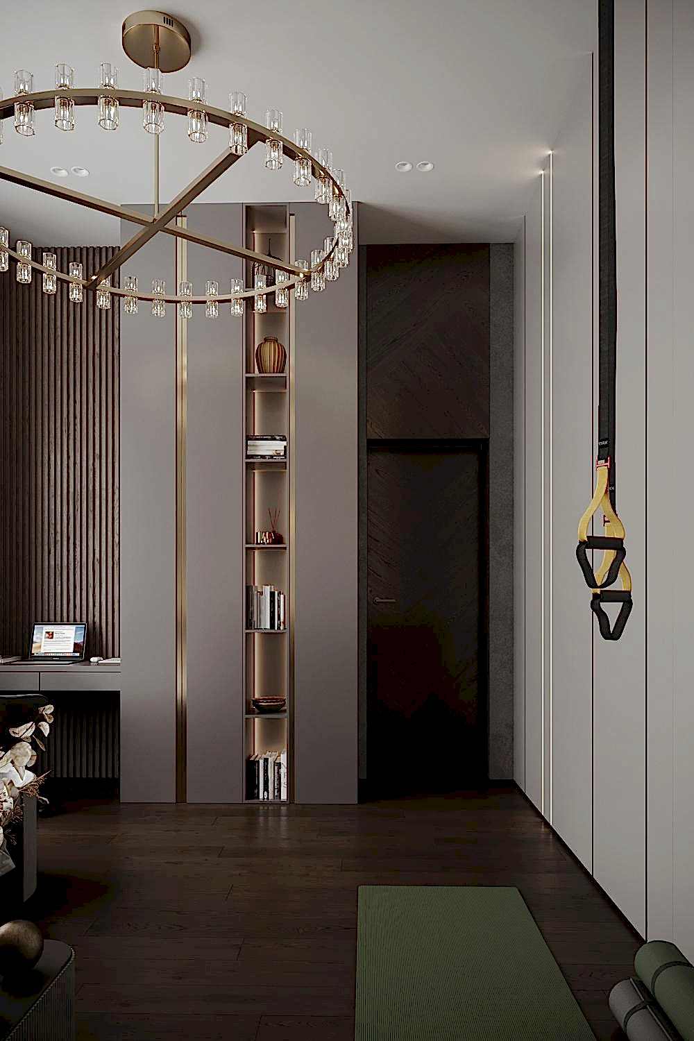 В столовой зоне глянцевый мраморный стол, будто высеченный из Pin-Up Над ним - скульптурная люстра с латунными лепестками. Стены отделаны геометрическими панелями, которые задают ритм и глубину. Атмосфера - как в бутиковом ресторане. Но с домашним комфортом.