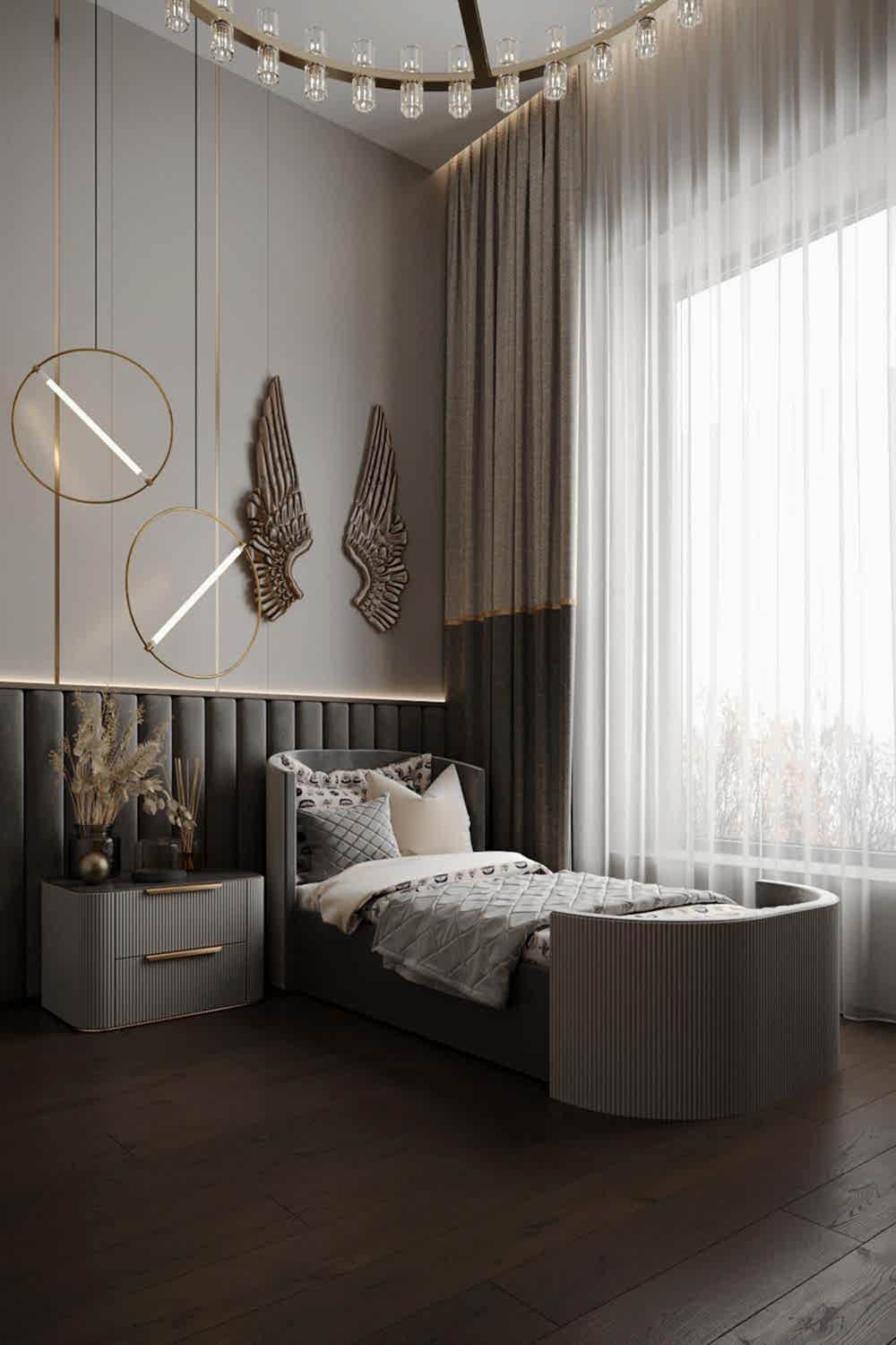 Первое, что сразу цепляет взгляд - это изголовье кровати. Оно сделано из объёмных панелей с геометричным рисунком и тонкими металлическими вставками. Pin-Up немного архитектурное, но при этом тёплое - визуально вытягивает стену вверх и создаёт классный фон.