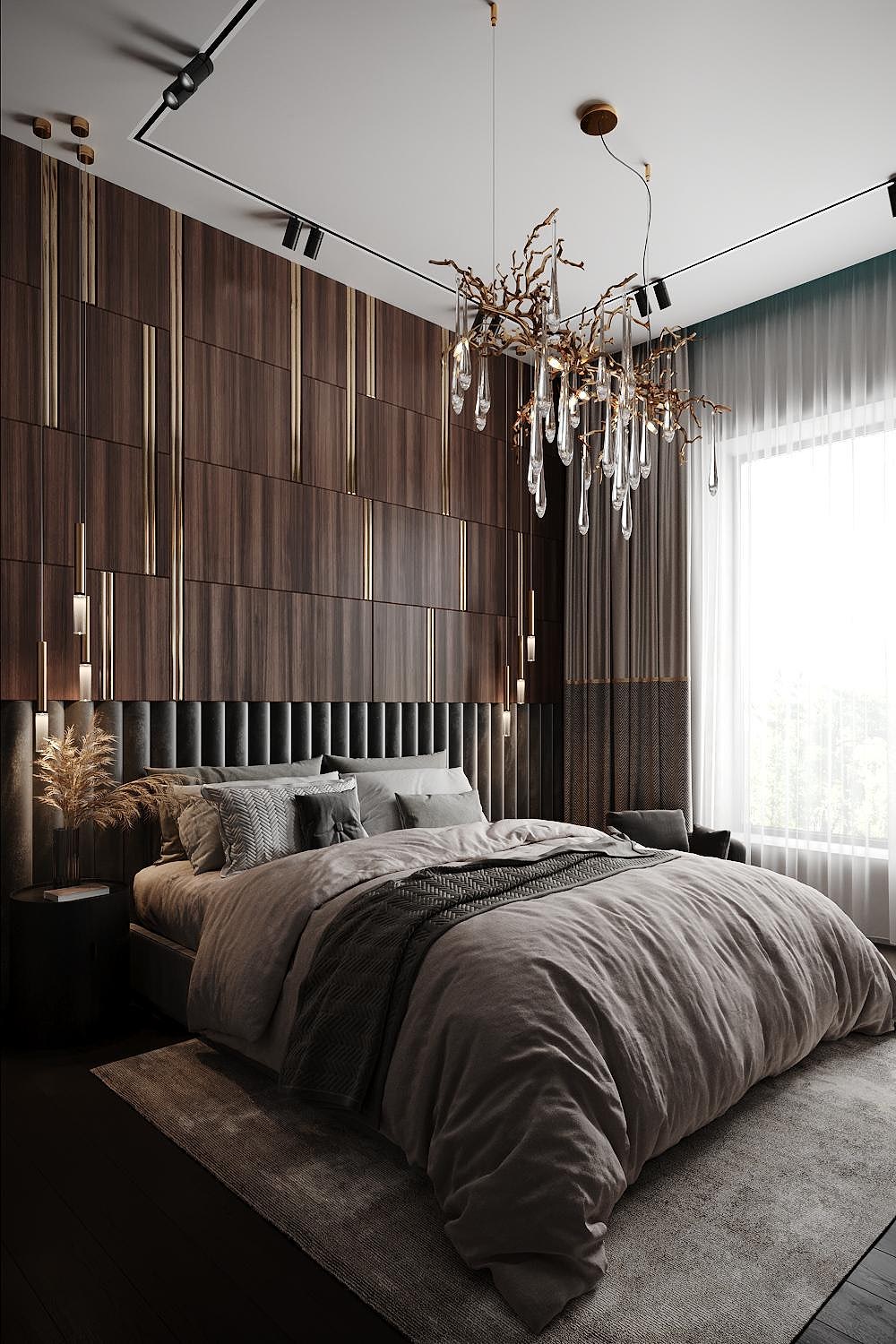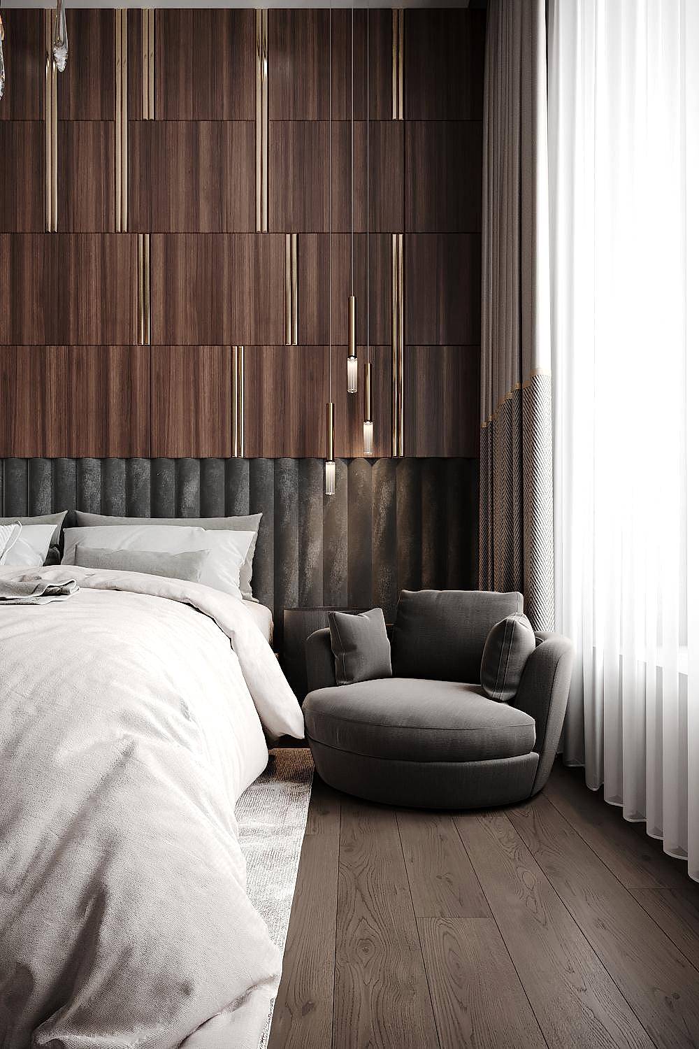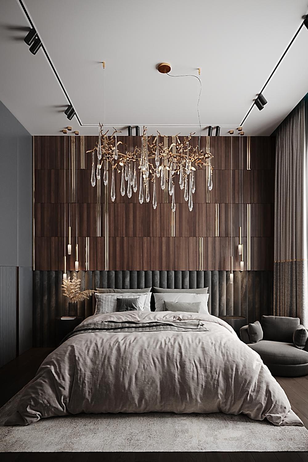 Интерьер дополнен изящными подвесными светильниками, которые создают мягкое, уютное освещение по обе стороны от кровати. У Pin-Up располагается зона с ТВ, встроеная в декоративную панель из тёмного дерева и графитовых реек.