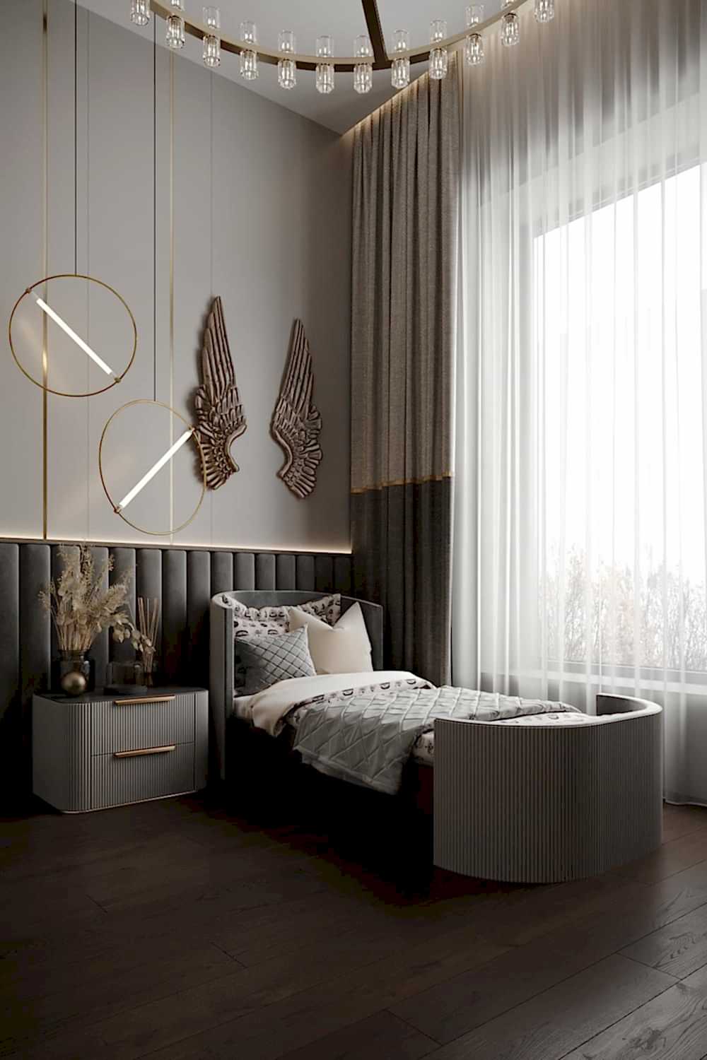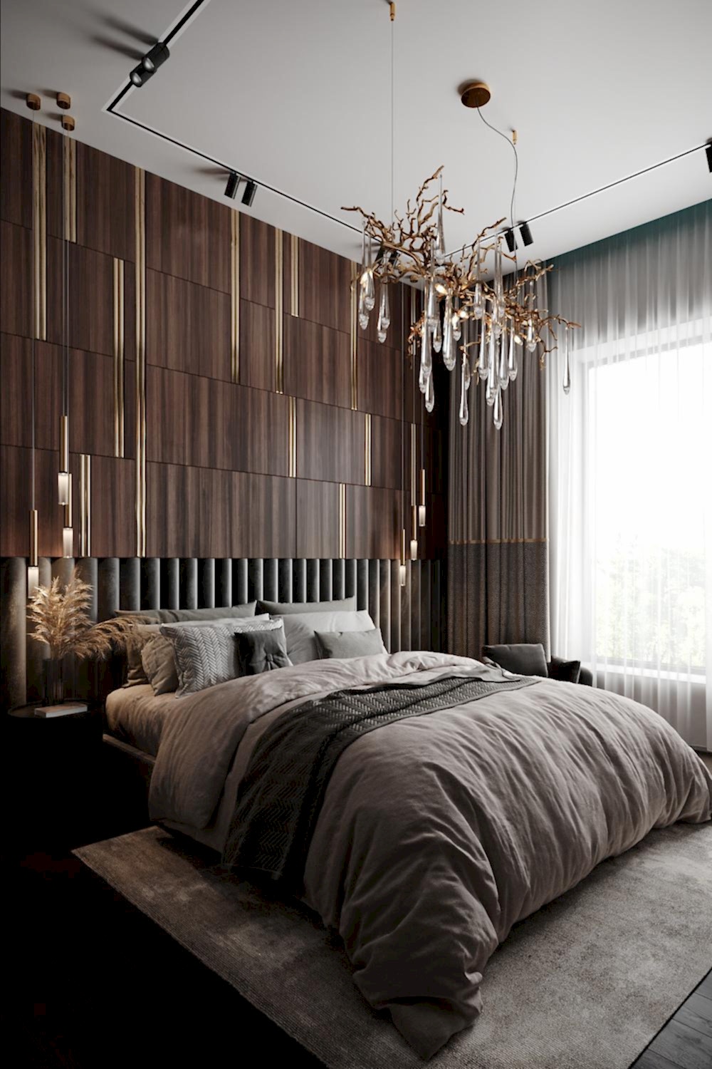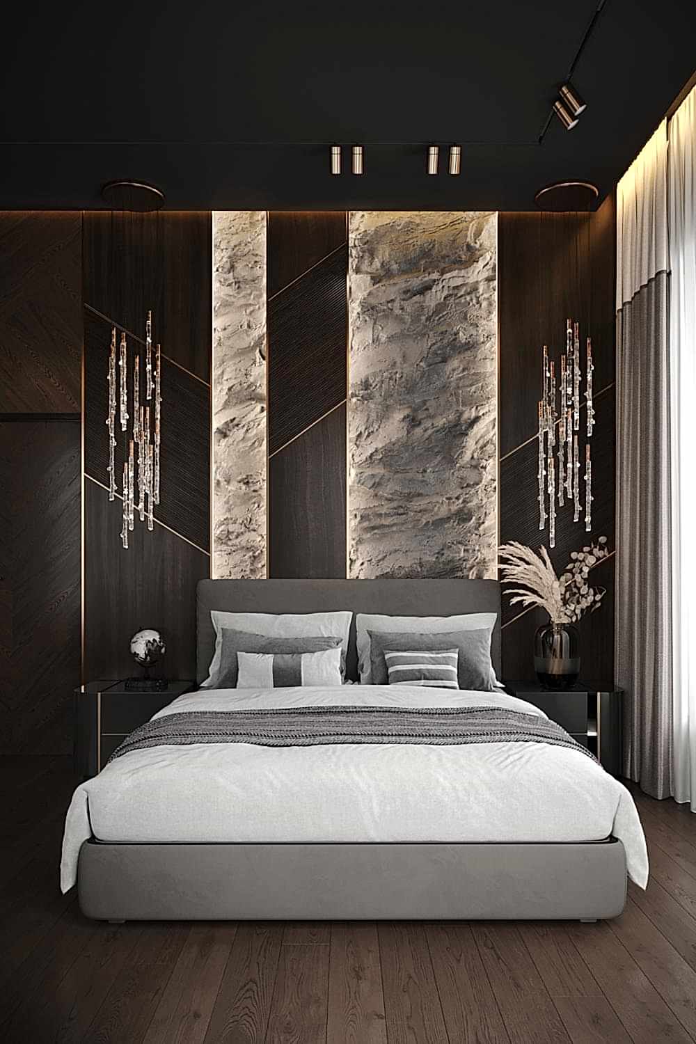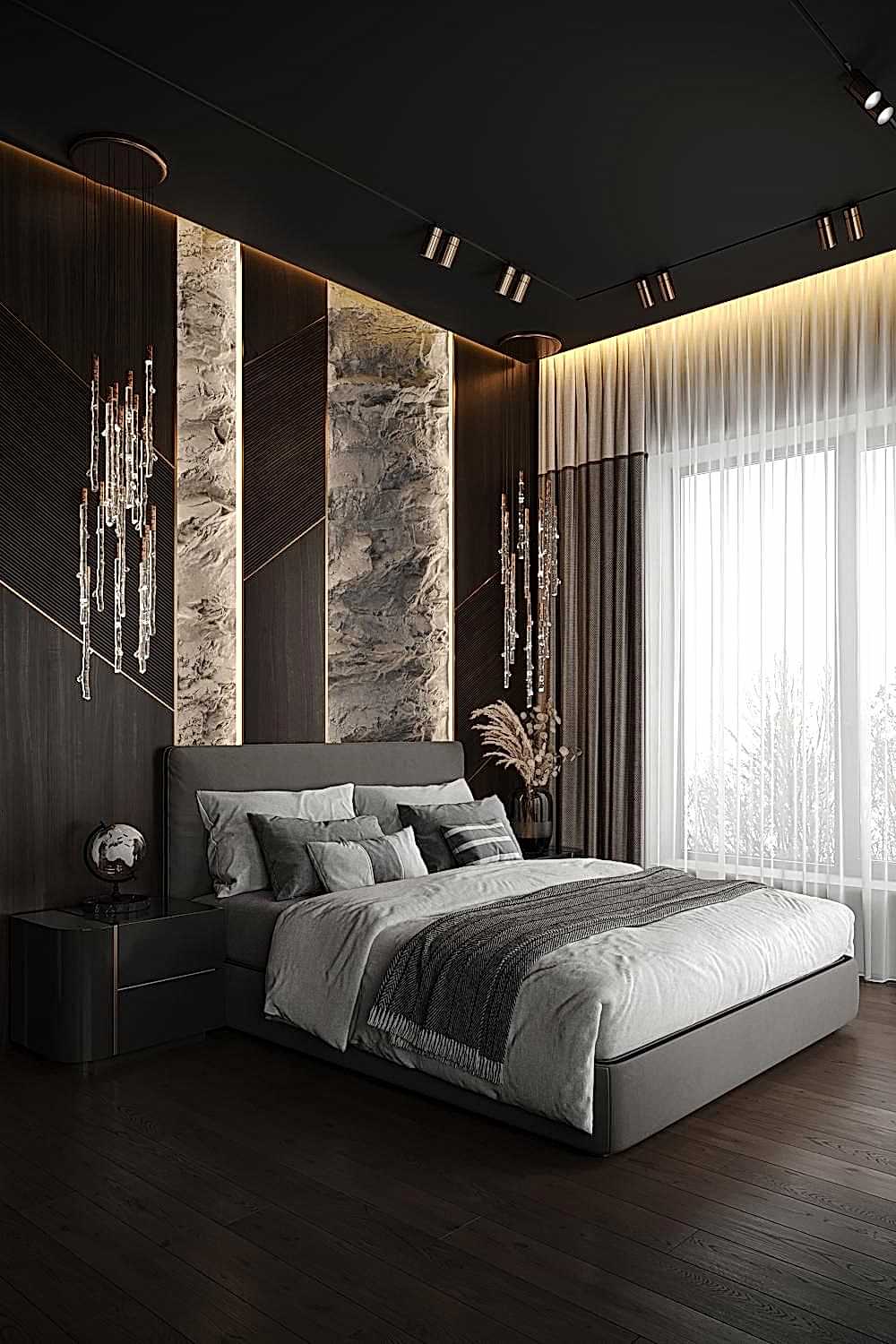 Интерьер дополнен изящными подвесными светильниками, которые создают мягкое, уютное освещение по обе стороны от кровати. У Pin-Up располагается зона с ТВ, встроеная в декоративную панель из тёмного дерева и графитовых реек.