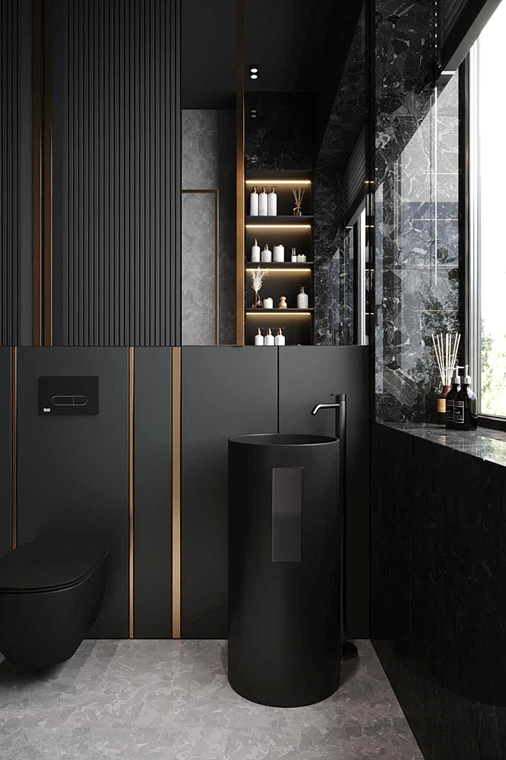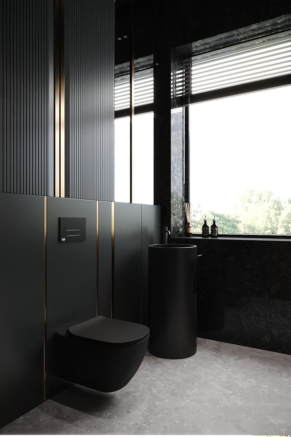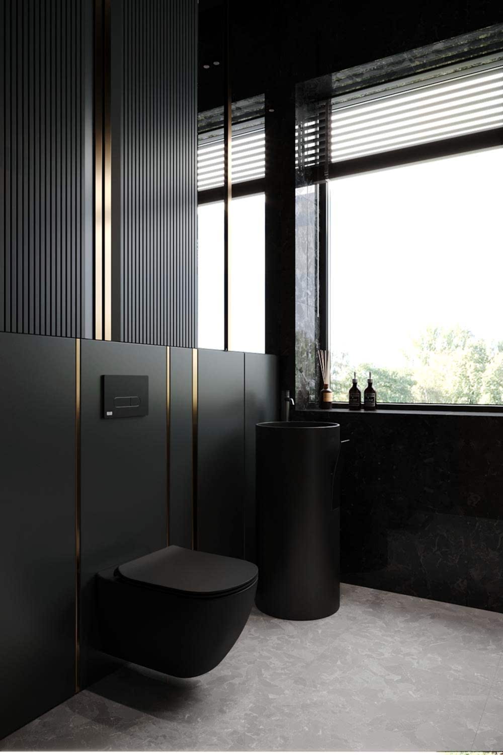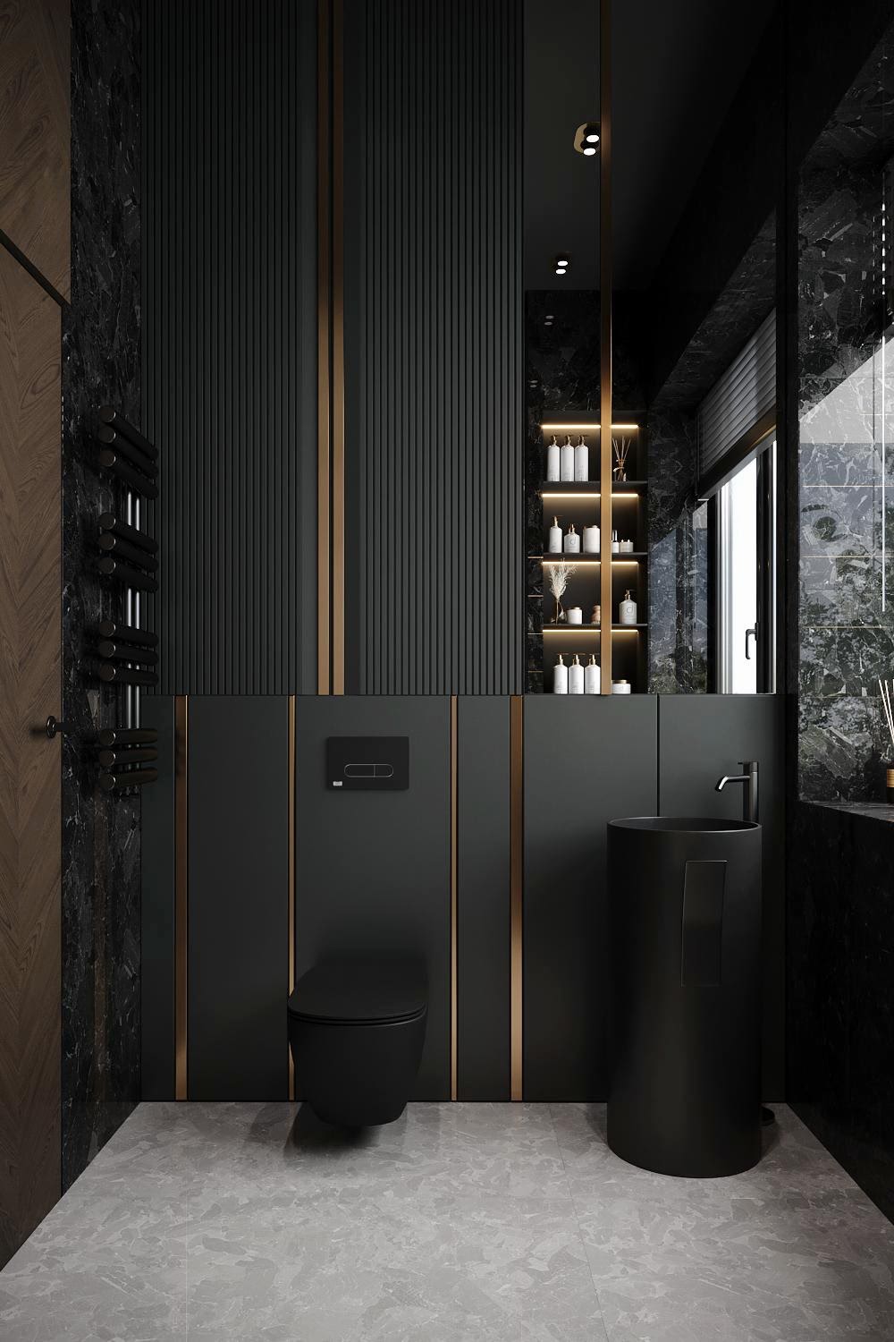 Сантехника - чёрная, лаконичная, но с характером. А раковина и столешница из тёмного мрамора с прожилкой - это просто вау! Очень тактильно, очень дорого и в то же время практично. В целом - это не просто санузел, а полноценное маленькое пространство комфорта с дизайнерским лицом.