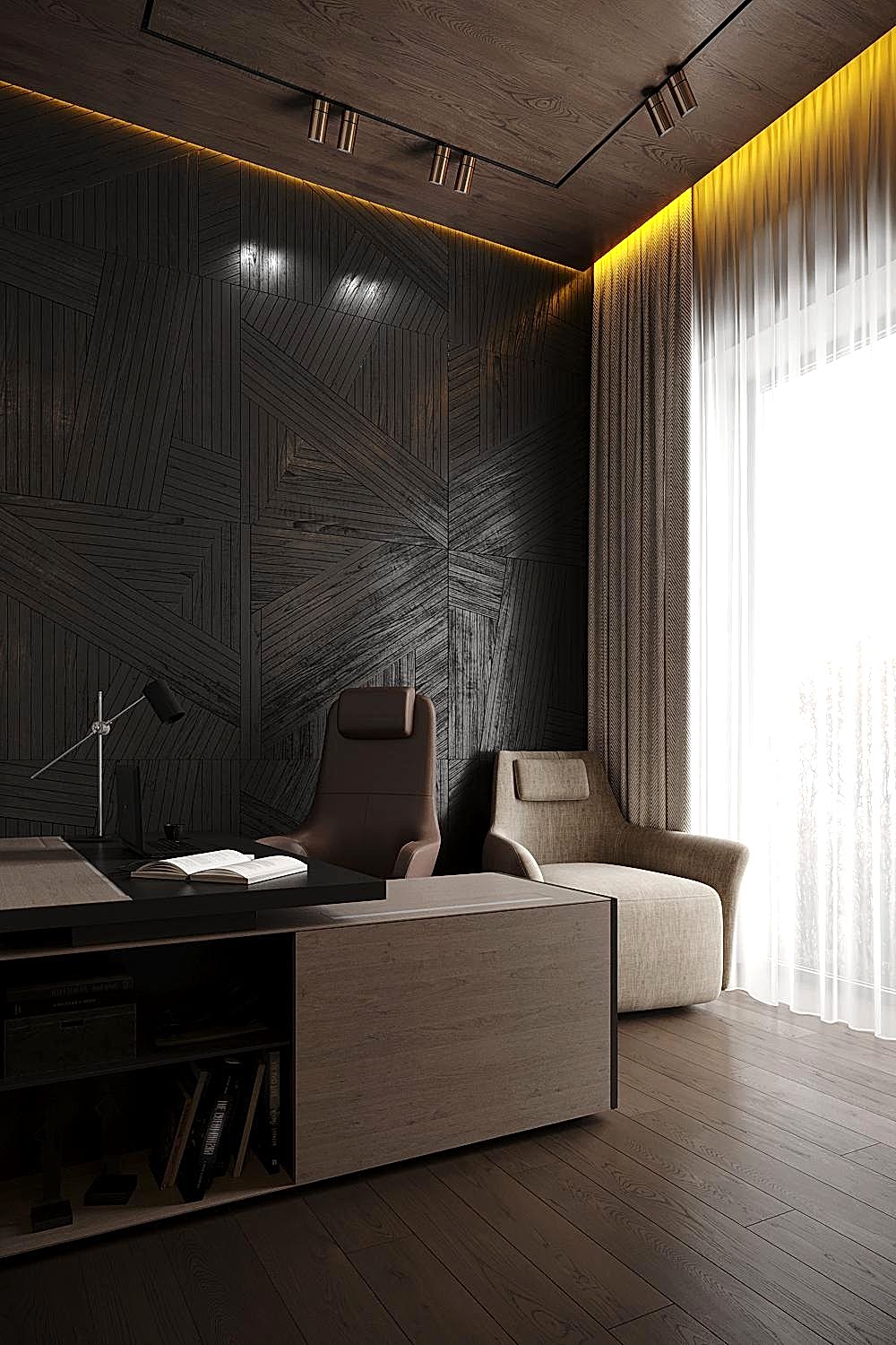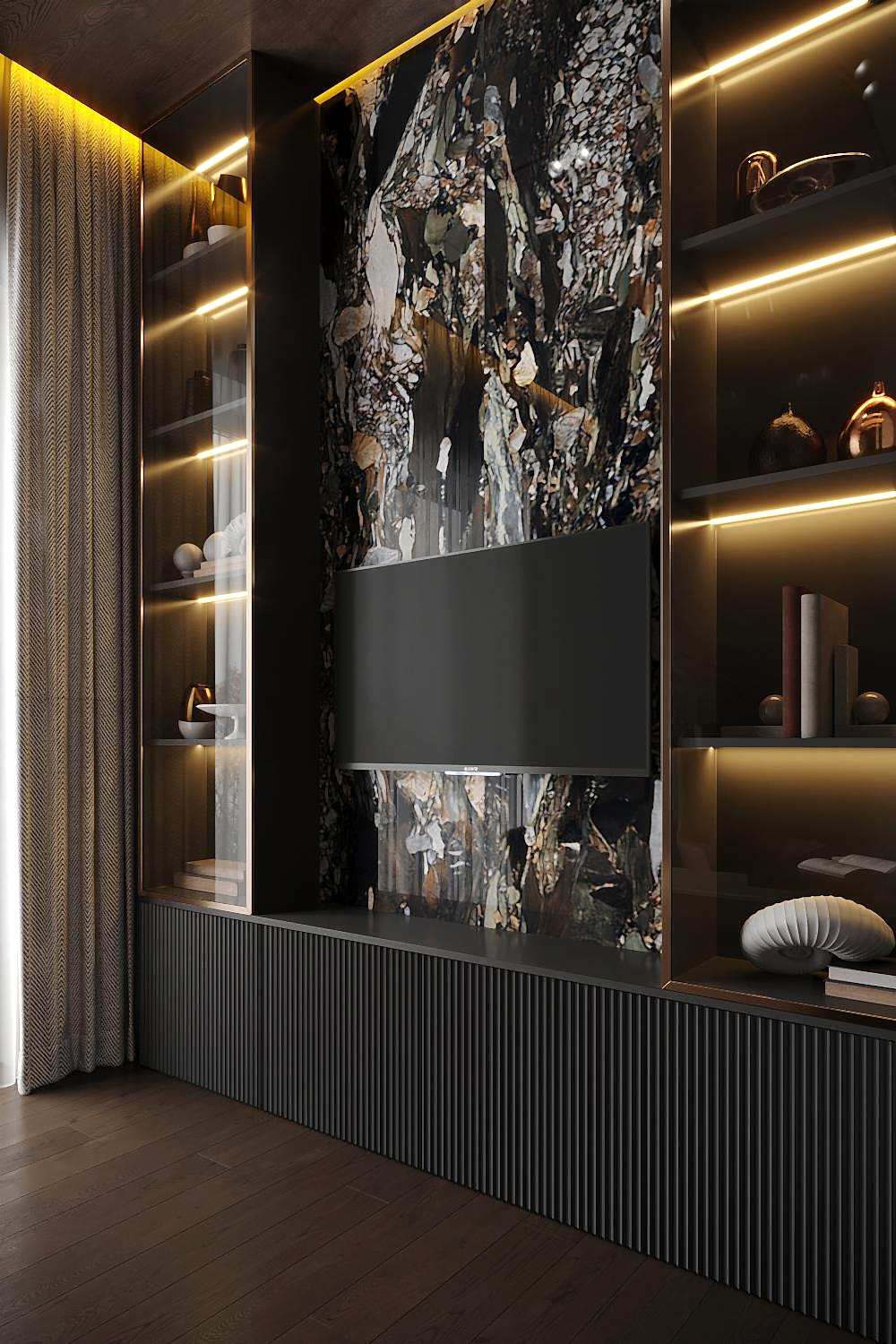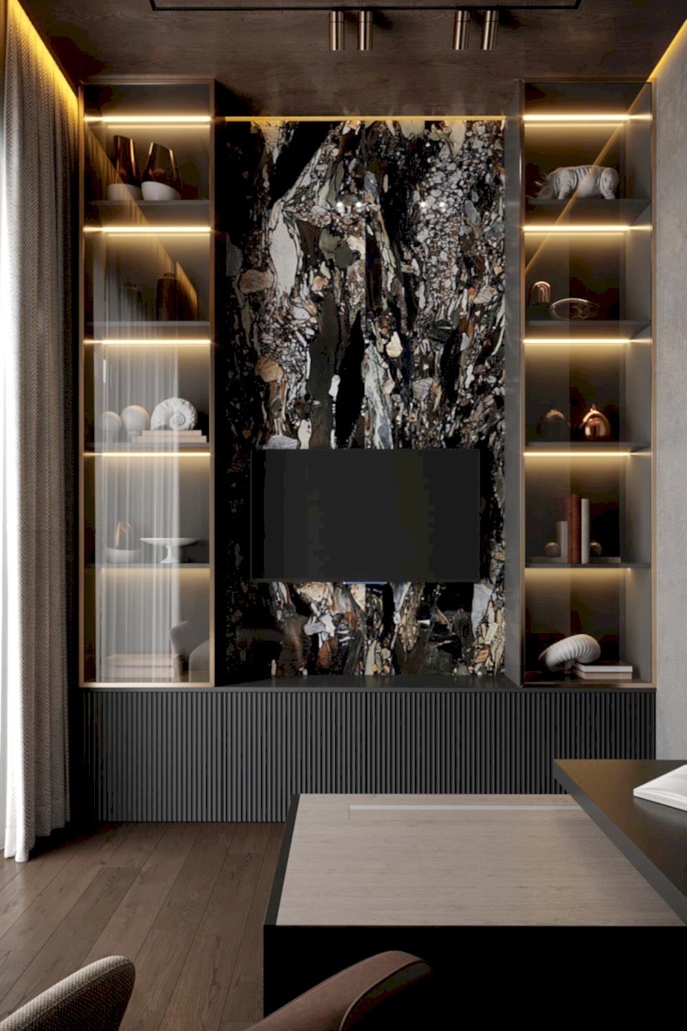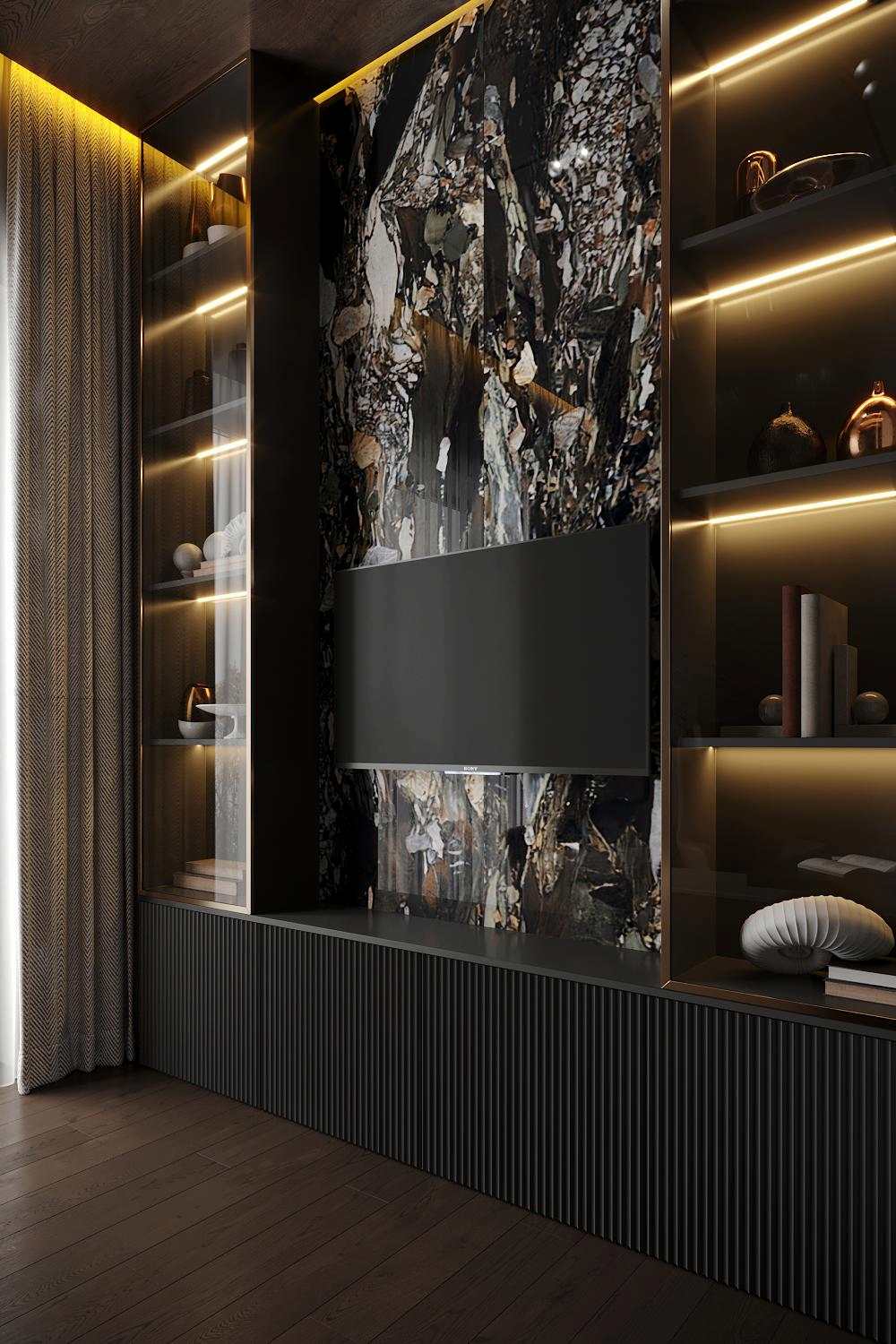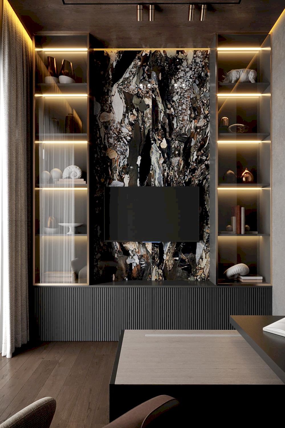 Кабинет здесь - прям как из кино про успешных и Pin-Up Сразу притягивает взгляд большая декоративная панель из камня за телевизором. Её прозвали «шоколад», и не зря - у неё глубокий, сложный рисунок и тёплый оттенок, от которого глаз не отвести. Она будто собирает всё пространство вокруг себя и задаёт тон всей комнате.