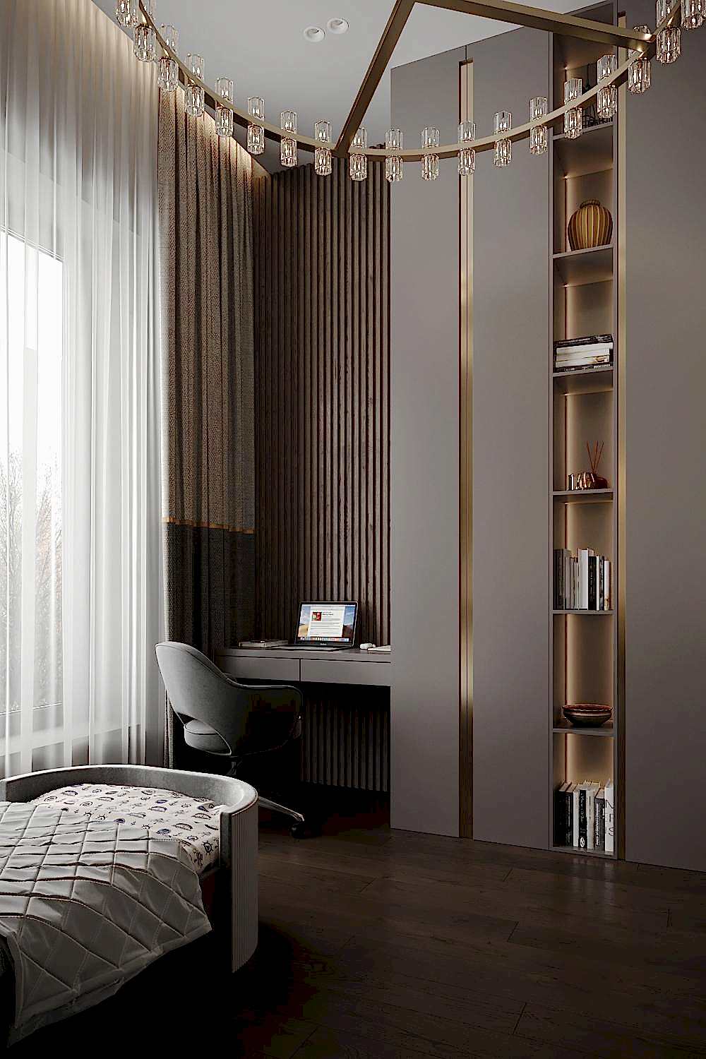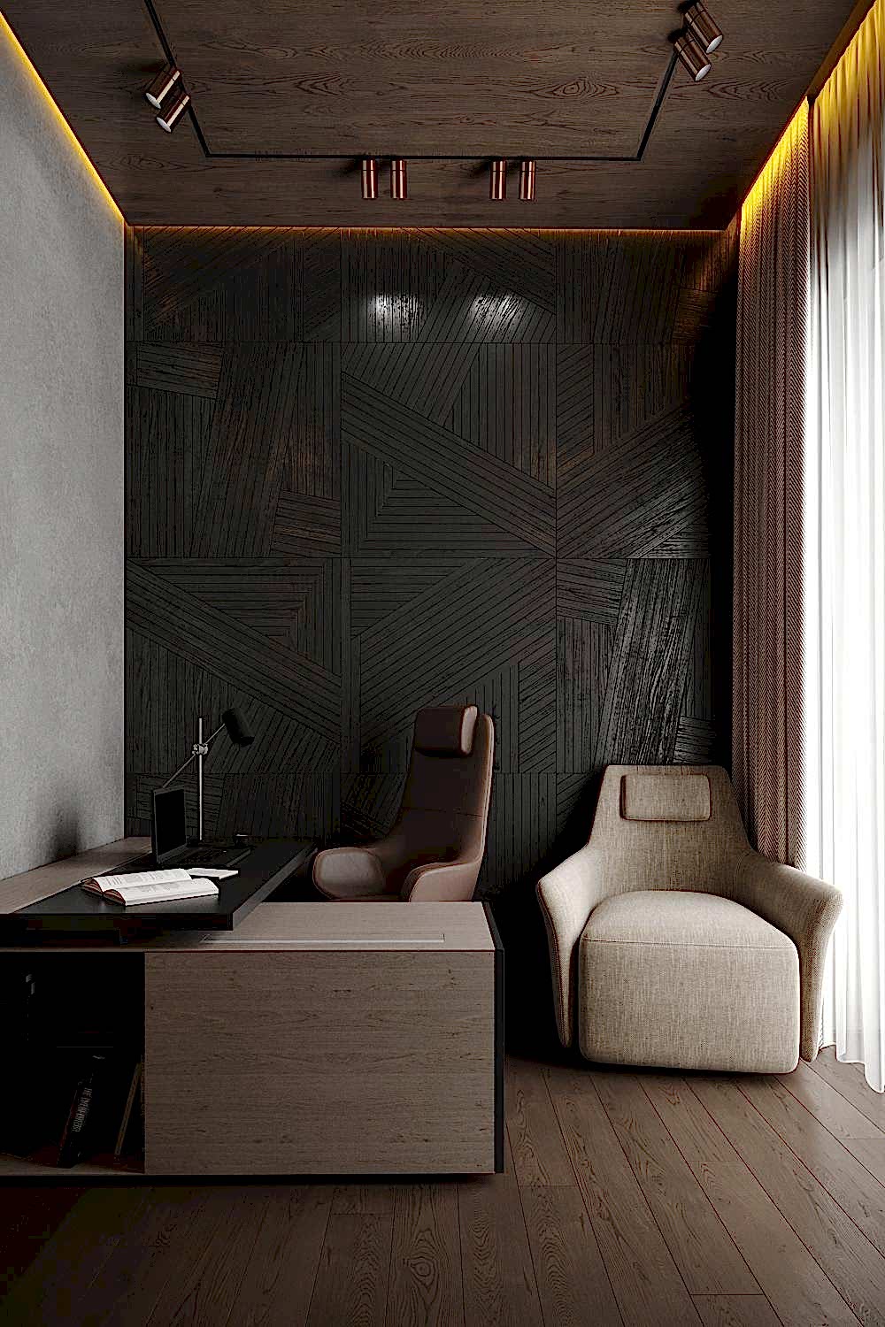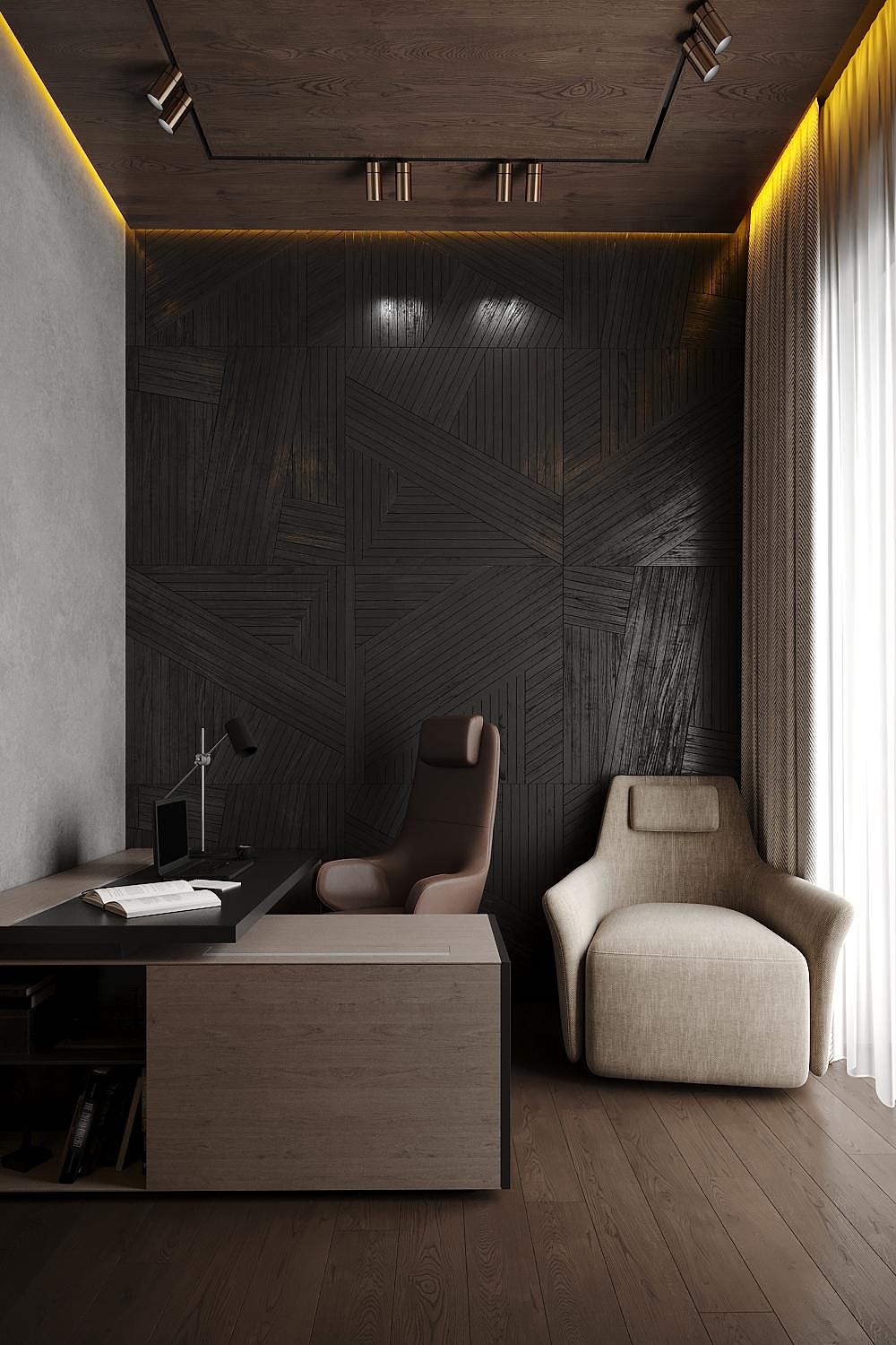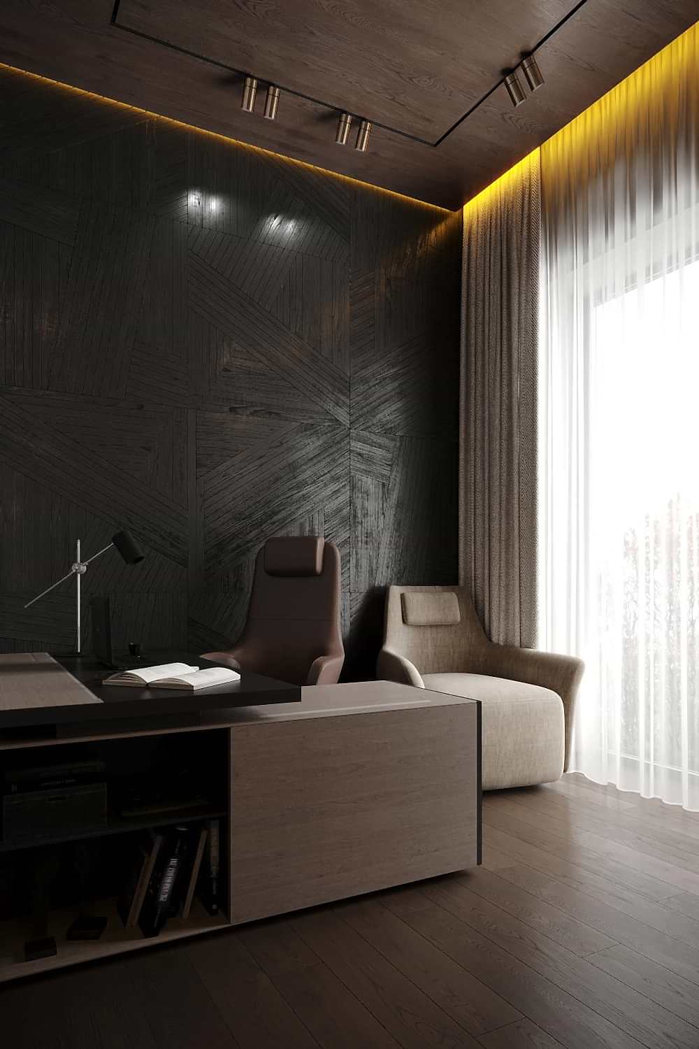Рабочее место простое, но с характером: массивный стол с контрастной Pin-Up и удобное кресло с высокой спинкой. Рядом - мягкое кресло для чтения, чтобы можно было переключиться без выхода из кабинета. Всё без лишнего декора, но продумано до мелочей - как раз для тех, кто ценит стиль и порядок.