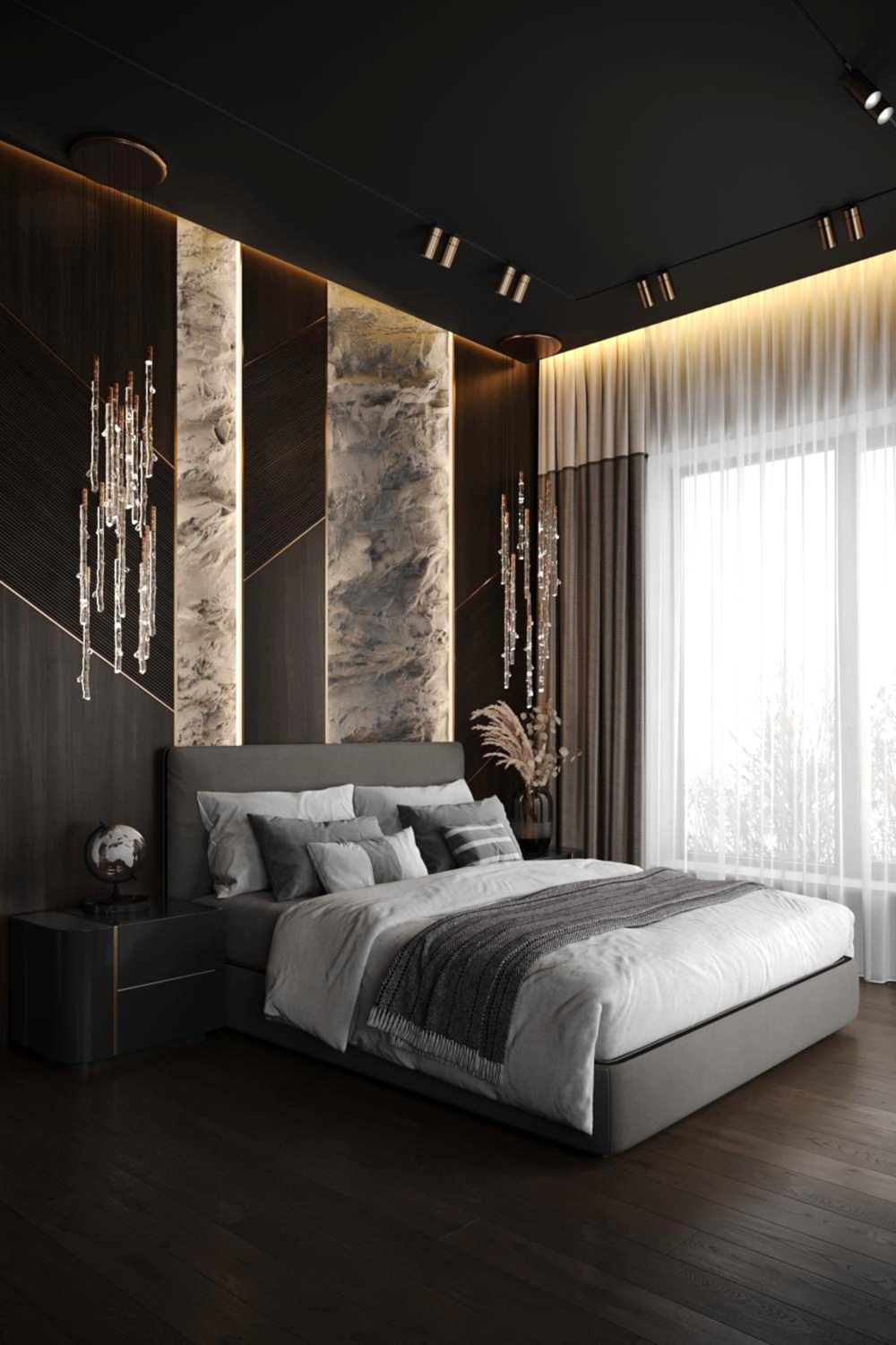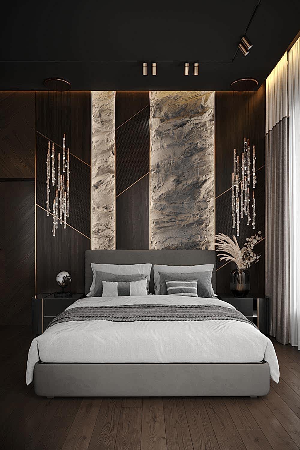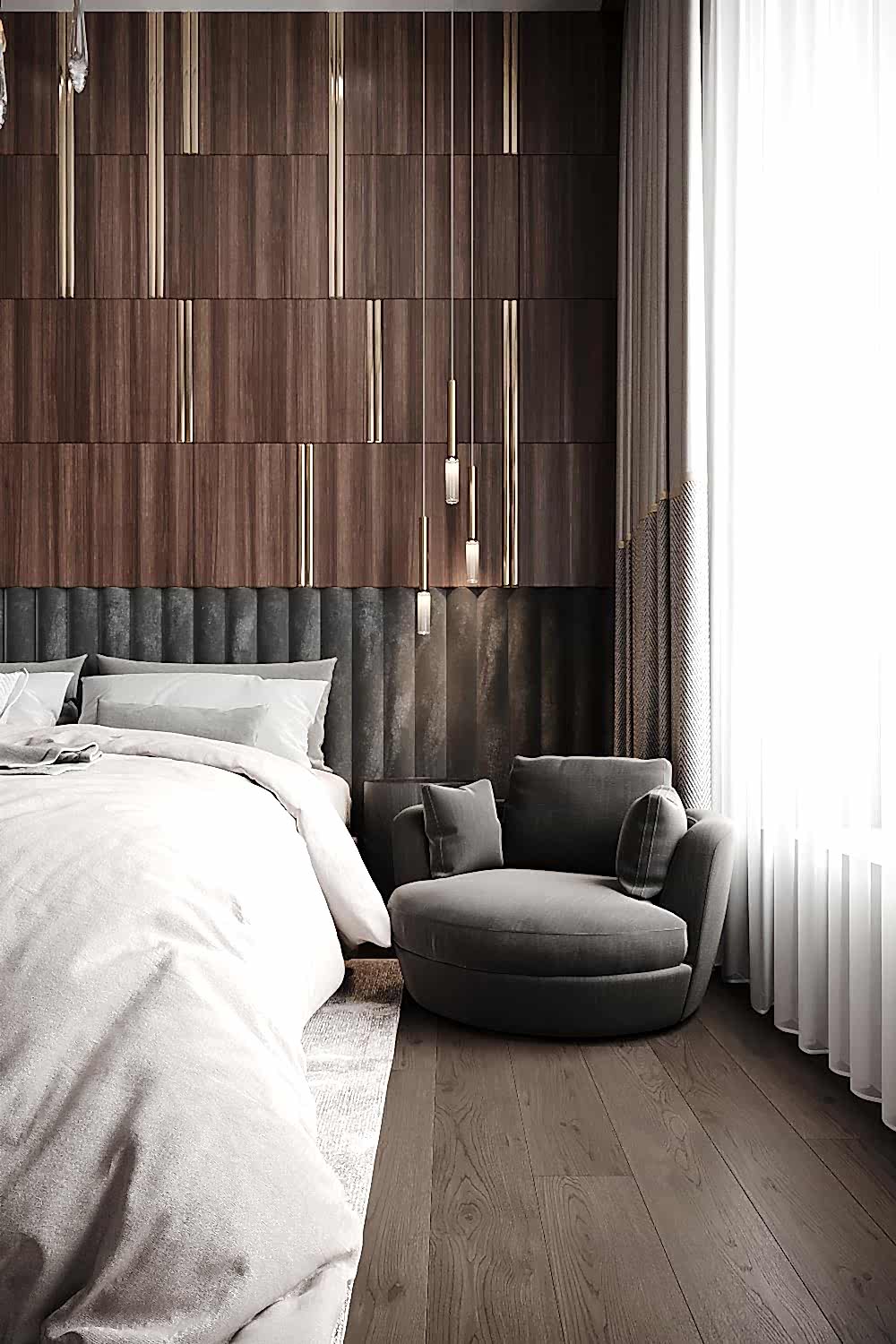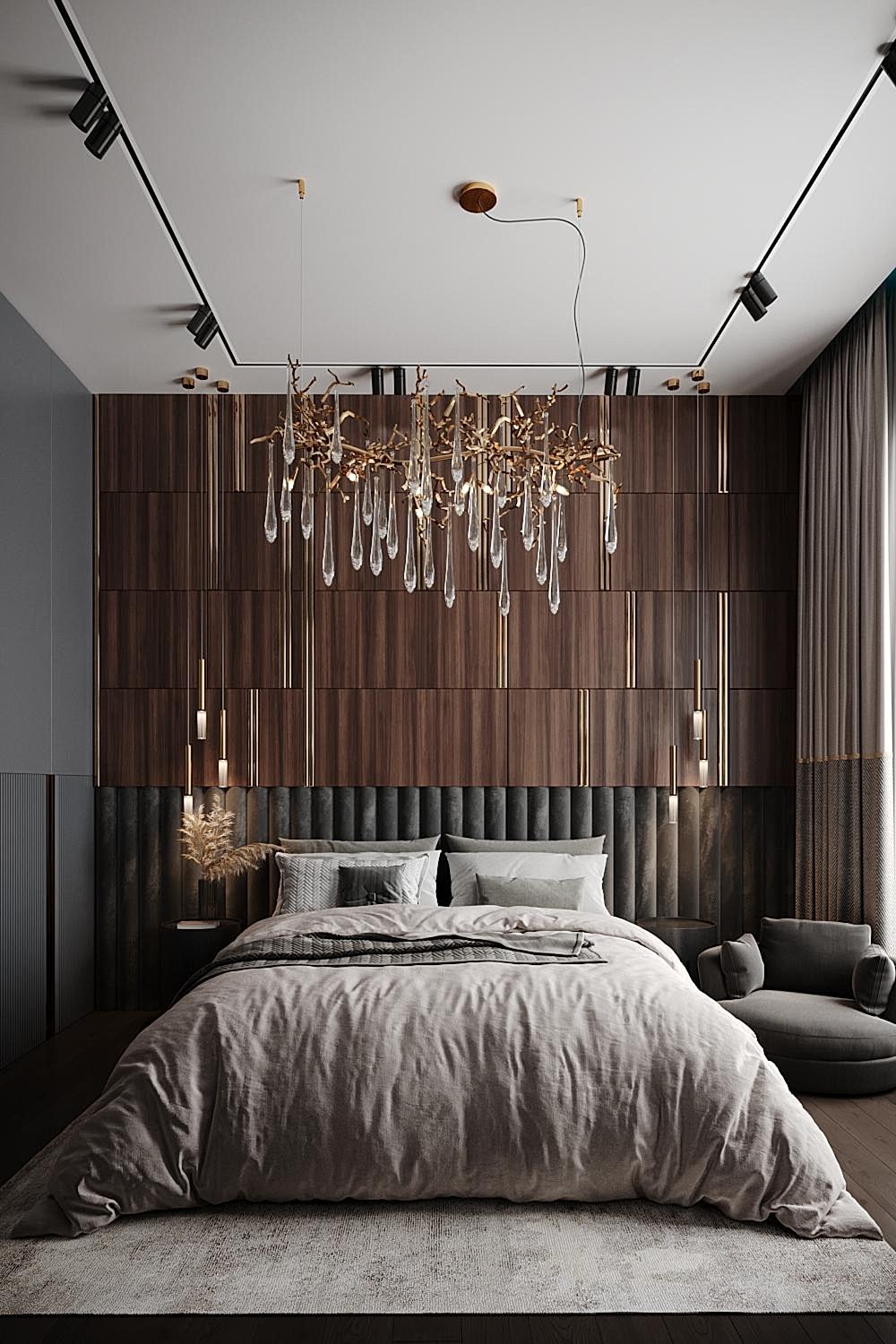 Интерьер этой спальни сочетает сдержанную элегантность и современное удобство. В центре Pin-Up - мягкая кровать с обивкой светлого оттенка, которая задаёт тон всей комнате. За изголовьем - акцентная стена из деревянных панелей с геометричным рисунком, подчёркивающим природную текстуру материала.