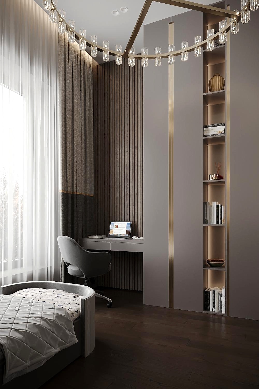 Гибкая, как график школьника. Пространство подстраивается под рост, интересы и количество игрушек. Акценты в виде крыльев на стене, рабочее место с интегрированным столом и зона с TRX - это вам не просто спальня, а стартовая Pin-Up детских свершений.