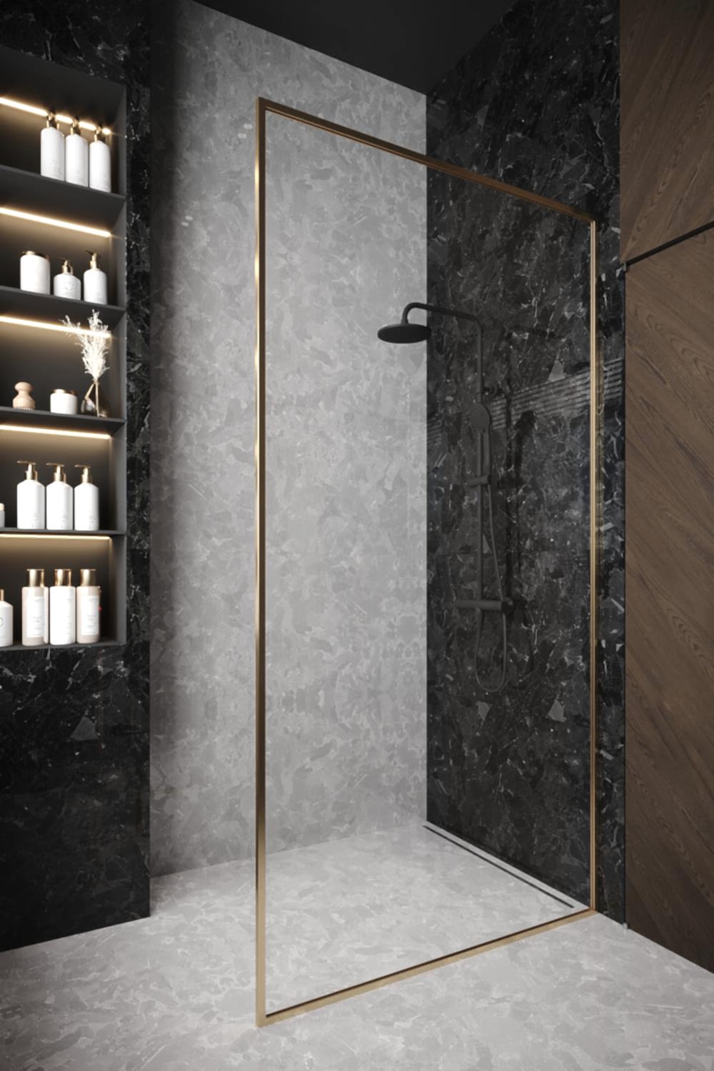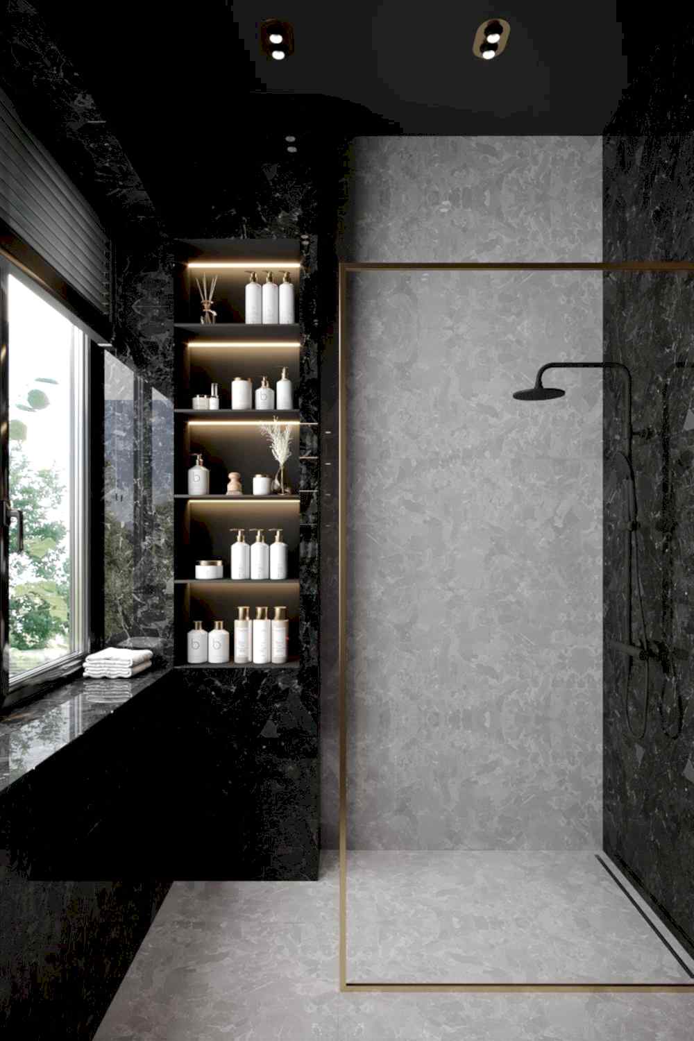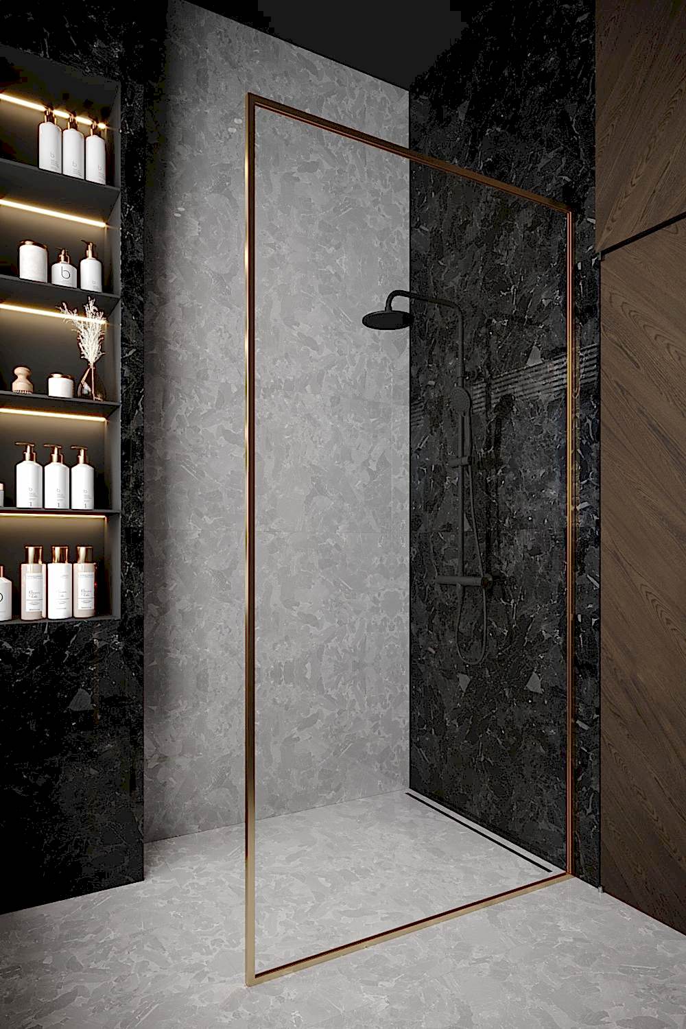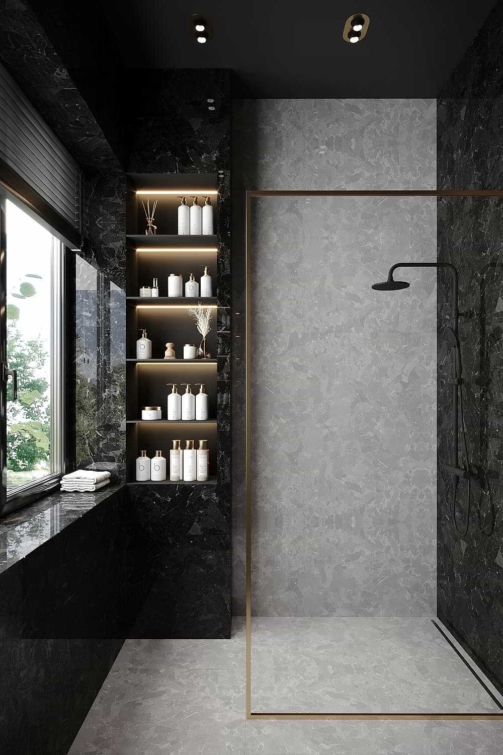 В зоне душа - светлая плитка под камень, чёрная сантехника и врезанные в стену полочки с подсветкой. Всё удобно, продумано и выглядит как в отеле, но лучше - потому что Pin-Up