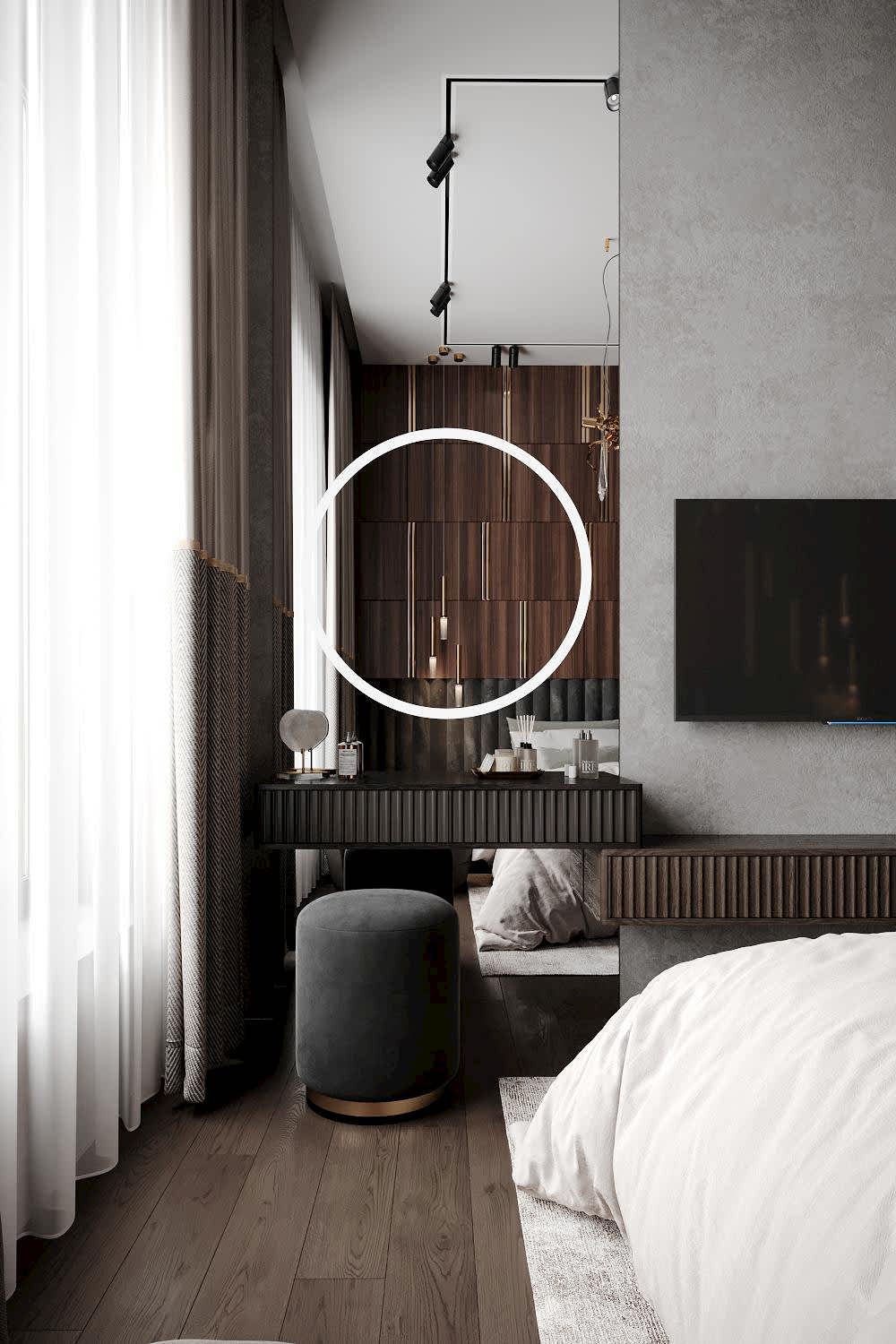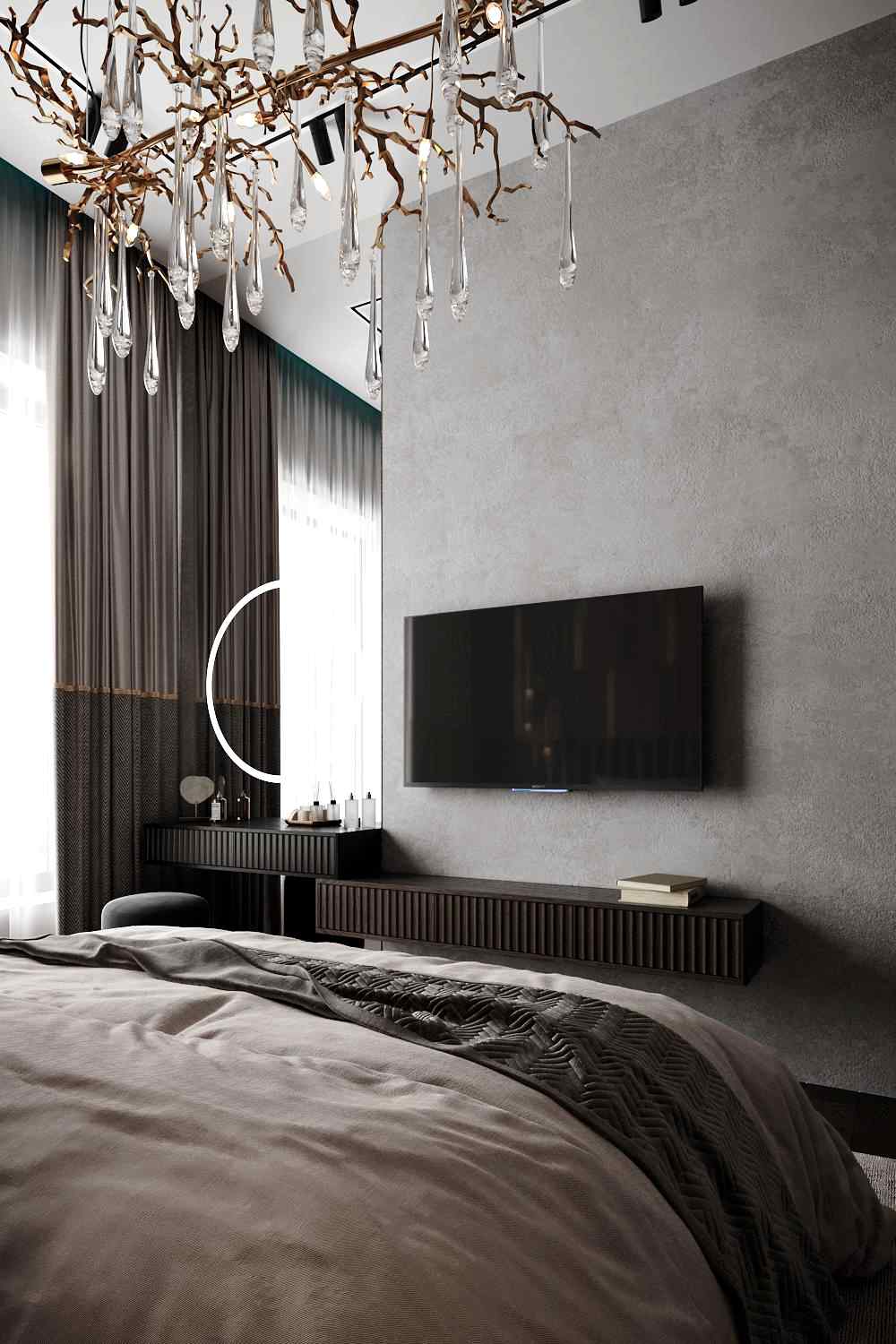 Шоколадные тона, фактурное Pin-Up вертикальное мягкое изголовье. Здесь всё дышит теплом и уравновешенностью. Люстра с каплями стекла добавляет лёгкости. Зона ТВ - с декоративной штукатуркой и рифлёной консолью, а туалетный столик - будто бьюти-зона с подиума, с зеркалом-кольцом и точечной подсветкой.