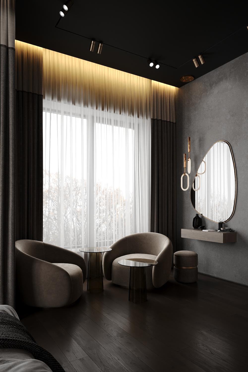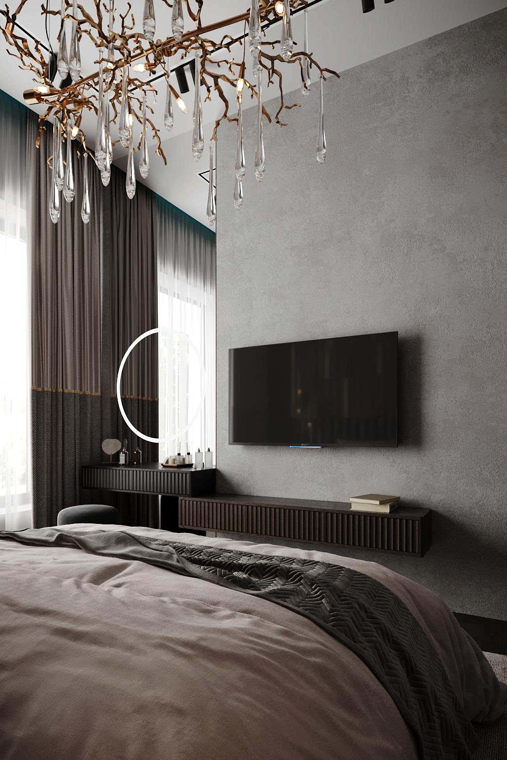 Большая кровать с объёмным изголовьем выполнена в тёмной бархатистой обивке, а текстиль, подобранный в Pin-Up палитре, подчёркивает атмосферу уюта. Основной акцент освещения - изящная люстра, напоминающая ветви с каплями росы, добавляет нотку арт-объекта. Пространство дополняет минималистичная ТВ-зона с подвесной тумбой и трюмо у окна с круглым зеркалом и мягким пуфом.