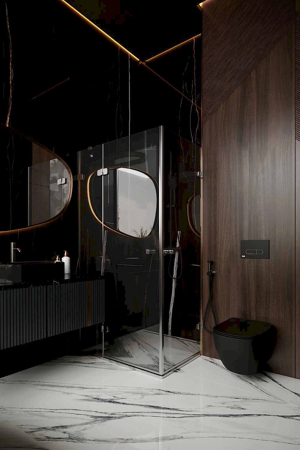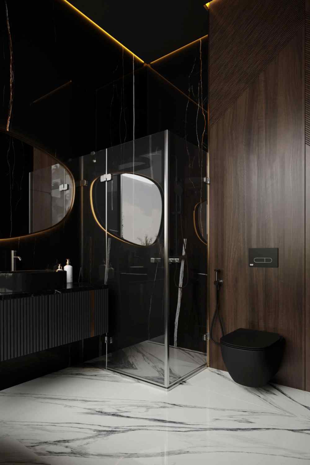 Этот санузел точно не про скучные плитки и стандартные решения. Здесь всё - про настроение, текстуры и тот самый «вау»-эффект с первого взгляда. В интерьере красиво сочетаются тёмное дерево, благородный Pin-Up камень и светлый мрамор с природным рисунком..