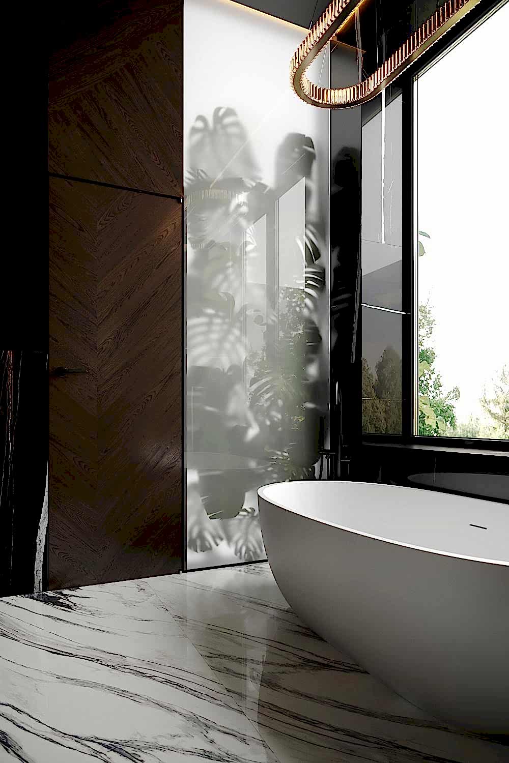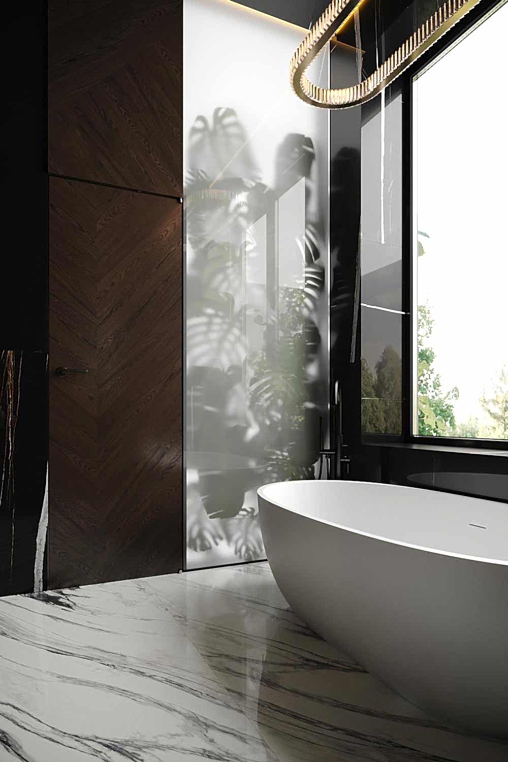 Pin-Up с листьями папоротника в мастер-ваннойЗа матовым стеклом мастер-ванной размещено декоративное панно с изображением папоротников. Этот приём стал тонкой отсылкой к природным мотивам и гармонично разбавил насыщенную тёмную палитру Pin-Up Светлый мраморный пол и отдельно стоящая ванна получили выразительную поддержку, а пространство - индивидуальный акцент, который отличает его от типовых решений.
