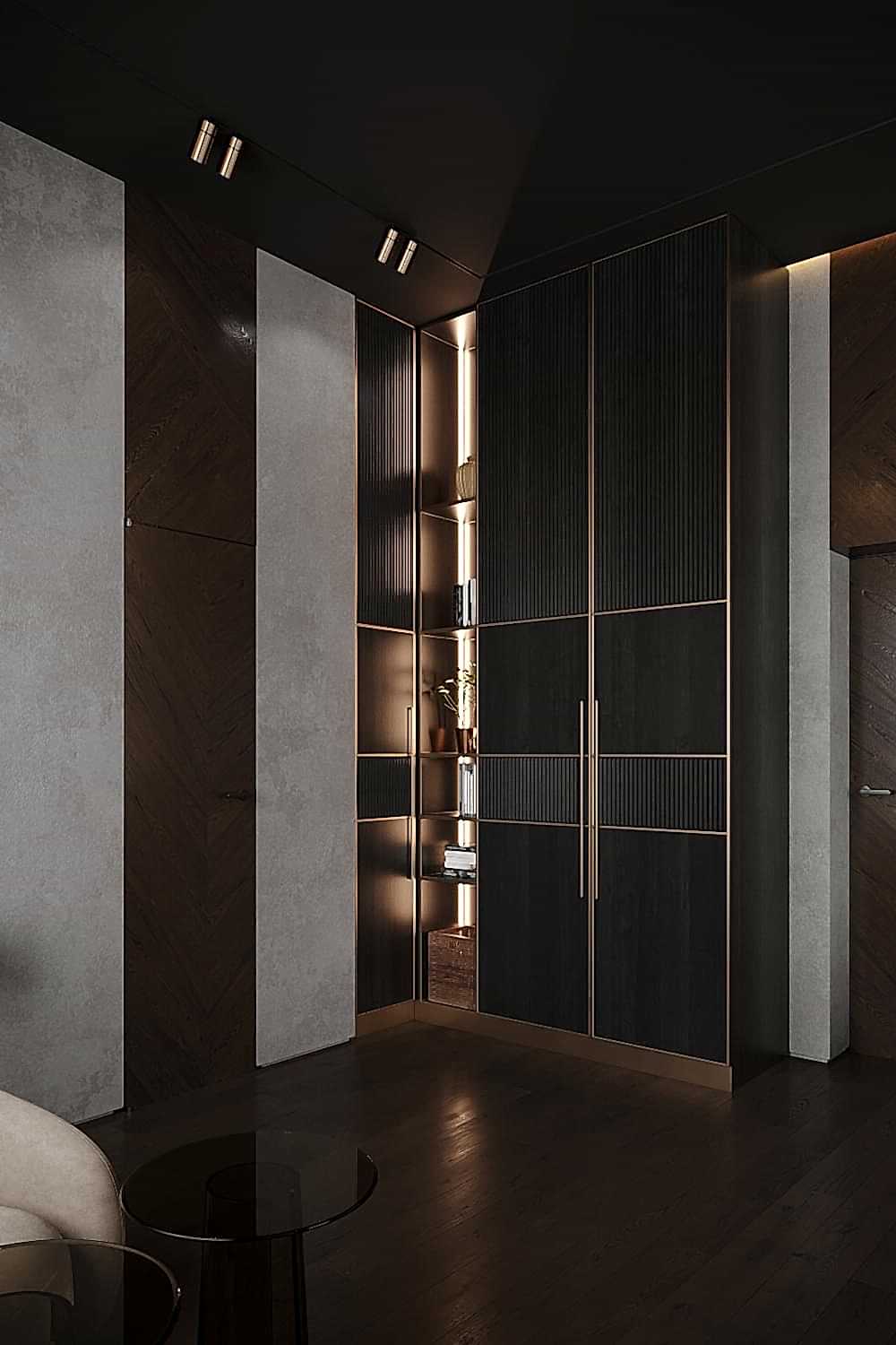 Шкаф встроен в нишу и оформлен как Pin-Up архитектурный элемент спальни. Фасады выполнены из тёмного шпона с рельефной вертикальной текстурой, разделены тонкими латунными профилями и дополнены высокими ручками в том же металлическом оттенке - сдержанный, но акцентный дизайн.