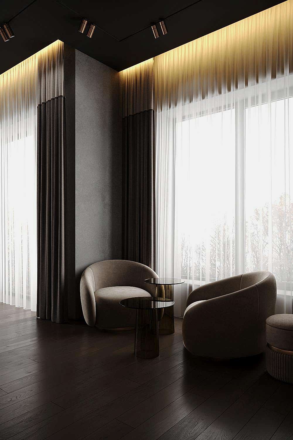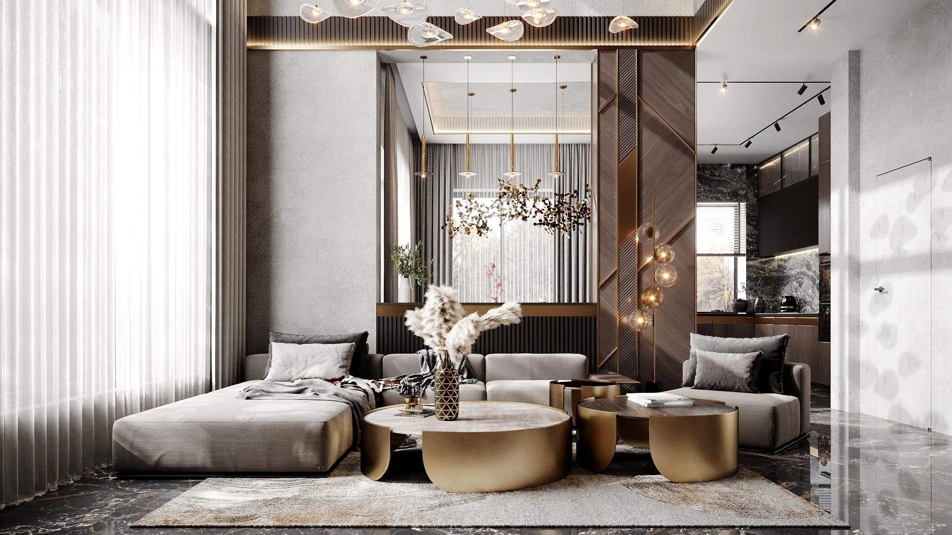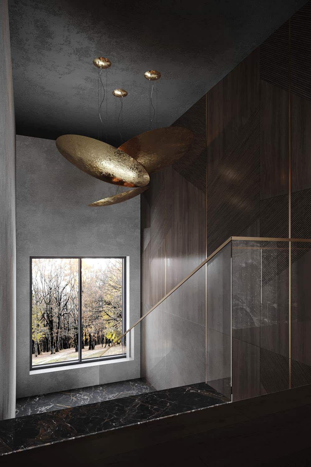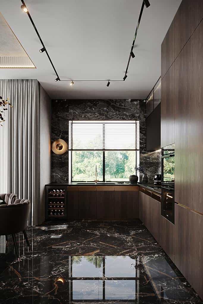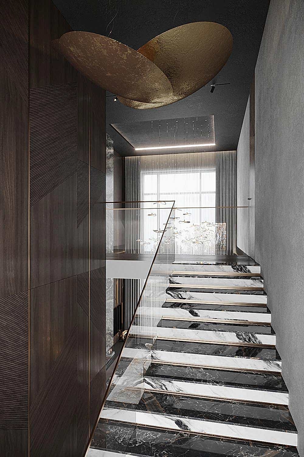 Основной акцент - на фактурах и свете. Pin-Up ореха, мрамор, латунь, декоративная штукатурка, натуральный камень и мягкие текстуры мебели создают живую, тактильную среду. Освещение выстроено в сценариях, подчеркивая объёмы и создавая нужную атмосферу - от вечернего уюта до яркого дневного света.