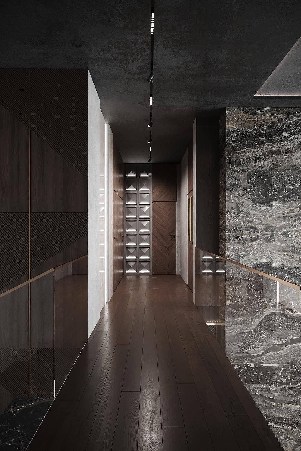 Пол - из натурального дерева насыщенного тёмного оттенка. Он объединяет весь дом по стилю и просто приятно выглядит. Стены оформлены панелями из тёмного шпона с латунными вставками по диагонали - перекликаются с отделкой в других зонах и добавляют ощущение единства.