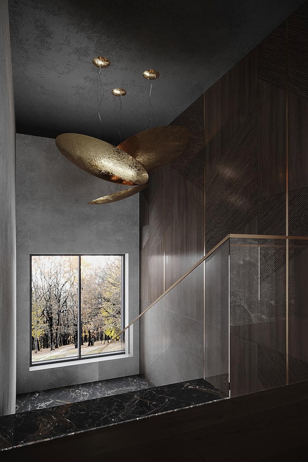 Холл на втором этаже - это не просто проход, а вполне себе эффектная зона, в которой всё продумано до мелочей. Главный акцент - огромная плита из натурального камня, которая тянется от пола до потолка. У неё красивый Pin-Up рисунок, а подсветка аккуратно подчеркивает фактуру - выглядит очень стильно и дорого.